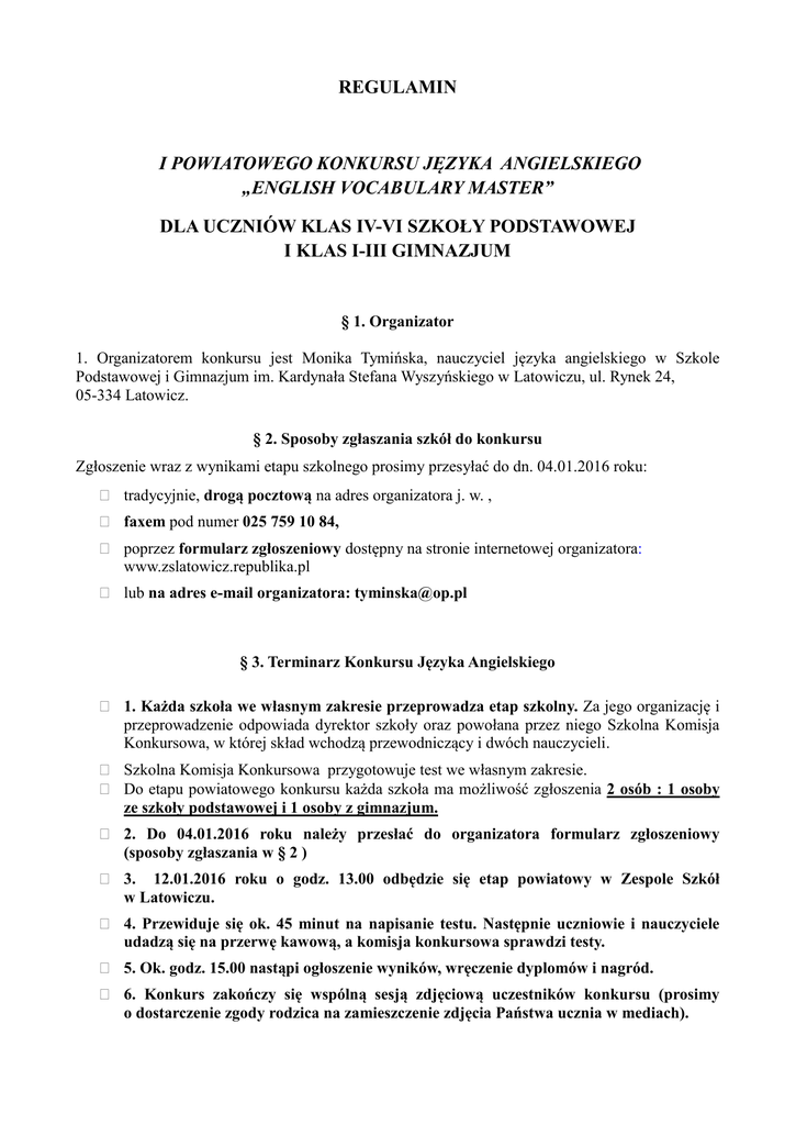 REGULAMIN I POWIATOWEGO KONKURSU JĘZYKA ANGIELSKIEGO „ENGLISH VOCABULARY MASTER” DLA UCZNIÓW KLAS IV-VI SZKOŁY PODSTAWOWEJ I KLAS I-III GIMNAZJUM § 1. Organizator 1. Organizatorem konkursu jest Monika Tymińska, nauczyciel języka angielskiego w Szkole Podstawowej i Gimnazjum im. Kardynała Stefana Wyszyńskiego w Latowiczu, ul. Rynek 24, 05-334 Latowicz. § 2. Sposoby zgłaszania szkół do konkursu Zgłoszenie wraz z wynikami etapu szkolnego prosimy przesyłać do dn. 04.01.2016 roku: tradycyjnie, drogą pocztową na adres organizatora j. w. , faxem pod numer 025 759 10 84, poprzez formularz zgłoszeniowy dostępny na stronie internetowej organizatora: www.zslatowicz.republika.pl lub na adres e-mail organizatora: [email protected] § 3. Terminarz Konkursu Języka Angielskiego 1. Każda szkoła we własnym zakresie przeprowadza etap szkolny. Za jego organizację i przeprowadzenie odpowiada dyrektor szkoły oraz powołana przez niego Szkolna Komisja Konkursowa, w której skład wchodzą przewodniczący i dwóch nauczycieli. Szkolna Komisja Konkursowa przygotowuje test we własnym zakresie. Do etapu powiatowego konkursu każda szkoła ma możliwość zgłoszenia 2 osób : 1 osoby ze szkoły podstawowej i 1 osoby z gimnazjum. 2. Do 04.01.2016 roku należy przesłać do organizatora formularz zgłoszeniowy (sposoby zgłaszania w § 2 ) 3. 12.01.2016 roku o godz. 13.00 odbędzie się etap powiatowy w Zespole Szkół w Latowiczu. 4. Przewiduje się ok. 45 minut na napisanie testu. Następnie uczniowie i nauczyciele udadzą się na przerwę kawową, a komisja konkursowa sprawdzi testy. 5. Ok. godz. 15.00 nastąpi ogłoszenie wyników, wręczenie dyplomów i nagród. 6. Konkurs zakończy się wspólną sesją zdjęciową uczestników konkursu (prosimy o dostarczenie zgody rodzica na zamieszczenie zdjęcia Państwa ucznia w mediach). § 4. Cele Konkursu 1. Promowanie wśród uczniów znajomości języka angielskiego oraz chęci pogłębiania swojej wiedzy. 2. Stworzenie uczniom możliwości sprawdzenia się w rywalizacji z rówieśnikami 3. Popularyzowanie nauki języka angielskiego. 4. Nawiązanie współpracy pomiędzy szkołami na terenie powiatu. § 5. Uczestnicy Konkursu 1. Konkurs zorganizowany jest dla uczniów szkół podstawowych i gimnazjów powiatu mińskiego. § 6. Zakresy wiedzy i umiejętności 1. Od uczestników Konkursu wymagana jest wiedza z zakresu treści zawartych w podstawie programowej dla klas IV-VI szkoły podstawowej oraz odpowiednio dla klas I-III gimnazjum z języka angielskiego – tematy przewodnie w tym roku to „człowiek” i „dom”. 2. Uczestnicy rozwiązują test składający się z pytań zamkniętych jednokrotnego wyboru. § 7. Zwycięzcy 1. Zwycięzcami są 3 osoby z najlepszym wynikiem punktowym w kategorii: szkoła podstawowa i 3 osoby z najlepszym wynikiem punktowym w kategorii: gimnazjum. Łącznie 6 osób i te osoby otrzymują nagrody. Pozostali uczestnicy otrzymują dyplomy za udział. Opiekunowie otrzymują podziękowania za przygotowanie uczniów. 2. W przypadku takiego samego wyniku dwóch lub więcej uczestników przewidziana jest dogrywka. Jej wynik decyduje o wygranej i jest ostateczny. Wszelkich informacji o konkursie udziela organizator p. Monika Tymińska tel. 694 384 356; e-mail: [email protected] konkursu SERDECZNIE ZAPRASZAMY DO UDZIAŁU W KONKURSIE! ŻYCZYMY SUKCESÓW! – KARTA ZGŁOSZENIA DO I POWIATOWEGO KONKURSU JĘZYKA ANGIELSKIEGO „ENGLISH VOCABULARY MASTER” DLA UCZNIÓW KLAS IV-VI SZKOŁY PODSTAWOWEJ I KLAS I-III GIMNAZJUM UWAGA! Kartę proszę wypełnić drukowanymi literami! Szkoła: ......................................................................................................................................... ......................................................................................................................................... Adres: ........................................................................................................................................ Telefon: ........................................................... Imię i nazwisko ucznia – szkoła podstawowa ………………………………………………………………………………………… Opiekun (imię i nazwisko, nr telefonu): ………………………………………………………………………………………… Imię i nazwisko ucznia – gimnazjum ………………………………………………………………………………………… Opiekun (imię i nazwisko, nr telefonu): ………………………………………………………………………………………… Zgoda na publikację wizerunku Ja, niżej podpisany/a wyrażam zgodę na umieszczenie wizerunku mojego syna/córki ........................................................................ (imię, nazwisko) na stronie internetowej i blogu ZS w Latowiczu oraz w lokalnych mediach w celach promocyjnych I POWIATOWEGO KONKURSU JĘZYKA ANGIELSKIEGO „ENGLISH VOCABULARY MASTER”. .......................................... Miejscowość, data ................................................. Podpis Rodzica Zgoda na publikację wizerunku Ja, niżej podpisany/a wyrażam zgodę na umieszczenie wizerunku mojego syna/córki ........................................................................ (imię, nazwisko) na stronie internetowej i blogu ZS w Latowiczu oraz w lokalnych mediach w celach promocyjnych I POWIATOWEGO KONKURSU JĘZYKA ANGIELSKIEGO „ENGLISH VOCABULARY MASTER”. .......................................... Miejscowość, data ................................................. Podpis Rodzica