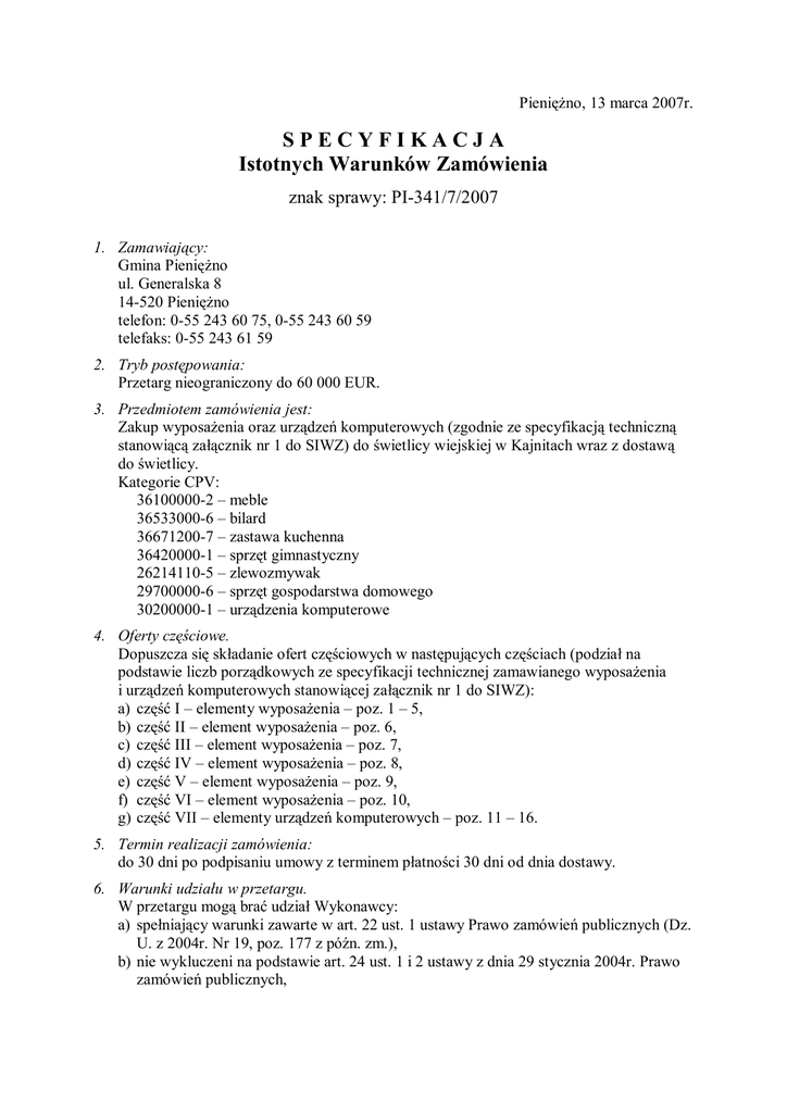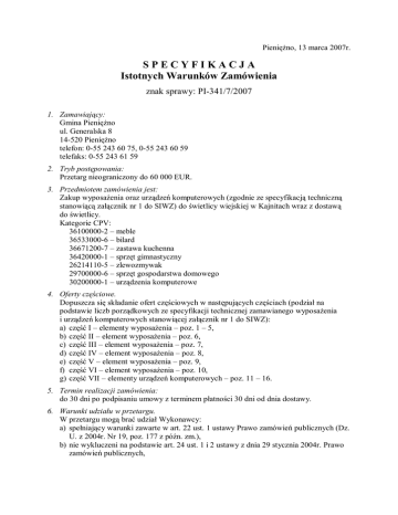 Pieniężno, 13 marca 2007r. SPECYFIKACJA Istotnych Warunków Zamówienia znak sprawy: PI-341/7/2007 1. Zamawiający: Gmina Pieniężno ul. Generalska 8 14-520 Pieniężno telefon: 0-55 243 60 75, 0-55 243 60 59 telefaks: 0-55 243 61 59 2. Tryb postępowania: Przetarg nieograniczony do 60 000 EUR. 3. Przedmiotem zamówienia jest: Zakup wyposażenia oraz urządzeń komputerowych (zgodnie ze specyfikacją techniczną stanowiącą załącznik nr 1 do SIWZ) do świetlicy wiejskiej w Kajnitach wraz z dostawą do świetlicy. Kategorie CPV: 36100000-2 – meble 36533000-6 – bilard 36671200-7 – zastawa kuchenna 36420000-1 – sprzęt gimnastyczny 26214110-5 – zlewozmywak 29700000-6 – sprzęt gospodarstwa domowego 30200000-1 – urządzenia komputerowe 4. Oferty częściowe. Dopuszcza się składanie ofert częściowych w następujących częściach (podział na podstawie liczb porządkowych ze specyfikacji technicznej zamawianego wyposażenia i urządzeń komputerowych stanowiącej załącznik nr 1 do SIWZ): a) część I – elementy wyposażenia – poz. 1 – 5, b) część II – element wyposażenia – poz. 6, c) część III – element wyposażenia – poz. 7, d) część IV – element wyposażenia – poz. 8, e) część V – element wyposażenia – poz. 9, f) część VI – element wyposażenia – poz. 10, g) część VII – elementy urządzeń komputerowych – poz. 11 – 16. 5. Termin realizacji zamówienia: do 30 dni po podpisaniu umowy z terminem płatności 30 dni od dnia dostawy. 6. Warunki udziału w przetargu. W przetargu mogą brać udział Wykonawcy: a) spełniający warunki zawarte w art. 22 ust. 1 ustawy Prawo zamówień publicznych (Dz. U. z 2004r. Nr 19, poz. 177 z późn. zm.), b) nie wykluczeni na podstawie art. 24 ust. 1 i 2 ustawy z dnia 29 stycznia 2004r. Prawo zamówień publicznych, –2– c) posiadający uprawnienia do działalności zgodnie z ustawą o swobodzie działalności gospodarczej, co potwierdzą zaświadczeniem o wpisie do ewidencji działalności gospodarczej lub wypisem KRS (lub ich kserokopią z potwierdzeniem zgodności z oryginałem przez uprawnioną osobę), d) którzy złożą wypełniony i podpisany formularz oferty wraz z załącznikami, e) zobowiązujący się udzielić co najmniej 12-miesięcznej gwarancji na montaż podzespołów komputerowych w gotowe do pracy zestawy komputerowe. 7. Ogólne informacje dla Wykonawcy: a) Wykonawca może złożyć tylko jedną ofertę zawierającą wybrane części. b) Wykonawca ponosi wszystkie koszty związane ze sporządzeniem i złożeniem oferty niezależnie od wyniku postępowania przetargowego. c) Zaleca się Wykonawcy zdobycie wszelkich informacji koniecznych do przygotowania oferty i zawarcia umowy dostawy. d) Nie dopuszcza się składania ofert wariantowych. e) Nie wymaga się wnoszenia wadium. f) Składający ofertę pozostaje nią związany przez okres 30 dni kalendarzowych licząc od terminu składania ofert. g) Oferta musi być podpisana przez upełnomocnionego przedstawiciela Wykonawcy. h) Zamawiający dokona zamówienia u tego Wykonawcy, którego część oferty odpowiada zasadom określonym w ustawie Prawo zamówień publicznych oraz została uznana przez Zamawiającego za najkorzystniejszą zgodnie z SIWZ. 8. Dokumentacja przetargowa powinna zawierać: a) wypełniony formularz oferty (zał.); b) wypełnione zestawienie elementów i cen (zał.). Cena w okresie związania Wykonawcy ofertą nie ulega zmianie ani waloryzacji. 9. Zapoznanie Wykonawców z dokumentacją przetargową. a) Zamawiający wymaga, żeby Wykonawcy zapoznali się dokładnie z treścią wszystkich dokumentów przetargowych. b) Oferty sporządzone niezgodnie z wymaganiami dokumentacji przetargowej będą odrzucone. c) Każdy Wykonawca ma prawo zwrócić się do Zamawiającego o wyjaśnienie treści dokumentów przetargowych w terminie nie późniejszym niż 6 dni roboczych przed upływem terminu składania ofert. d) Pytania odnośnie zamówienia powinny być formułowane na piśmie i złożone na adres zamawiającego i opatrzone nazwą Wykonawcy. e) Zamawiający niezwłocznie udzieli pisemnej odpowiedzi na pytania odnośnie zamówienia wszystkim zainteresowanym Wykonawcom. 10. Osobą upoważnioną do bezpośredniego kontaktowania się z Wykonawcami jest: a) imię i nazwisko: Halina Błońska, b) miejsce: pokój nr 9 (parter) w Urzędzie Miejskim w Pieniężnie, ul. Generalska 8, c) tel.: 0-55 243 60 75 lub 0-55 243 60 59 w. 24 w godz. 8:00 – 15:00 od poniedziałku do piątku 11. Forma składania ofert: a) Dwie zamknięte koperty: – zewnętrzna z opisem: „Przetarg na wyposażenie świetlicy wiejskiej w Kajnitach”, – wewnętrzna z opisem: „Przetarg na wyposażenie świetlicy wiejskiej w Kajnitach” oraz oznaczeniem nazwy i adresu Wykonawcy. –3– b) Miejsce: siedziba Zamawiającego, sekretariat Urzędu Miejskiego w Pieniężnie, ul. Generalska 8; 14-520 Pieniężno, pokój nr 14 (I piętro). c) Termin: 2 kwietnia 2007r. do godz. 12:00. 12. Forma rozpatrywania ofert: a) Zamawiający otworzy oferty 2 kwietnia 2007r. o godz. 12:30 w siedzibie UM w Pieniężnie, pok. nr 12 (I piętro). b) Otwarcie ofert jest jawne. c) O wyniku postępowania Zamawiający powiadomi Wykonawców pisemnie; wynik postępowania zostanie również ogłoszony na stronie internetowej Biuletynu Informacji Publicznej Gminy Pieniężno (http://bip.pieniezno.pl) w dziale „Finanse gminy”, „Przetargi”. d) Umowy dostawy pomiędzy Zamawiającym a Dostawcami (Wykonawcami danych ofert częściowych wyłonionymi w trakcie postępowania przetargowego) zostaną zawarte w terminie nie krótszym niż 7 dni od dnia przekazania zawiadomienia o wyborze danej oferty częściowej, nie później jednak niż przed upływem terminu związania ofertą. 13. Kryteria wyboru Wykonawcy części oferty: a) Każda część oferty otrzyma ocenę punktową wyliczoną według wzoru: cena minimalna danej części oferty z wszystkich ofert cena badanej c
