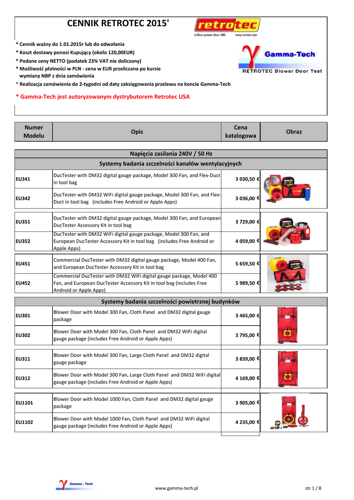 CENNIK RETROTEC 2015' * Cennik ważny do 1.01.2015r lub do odwołania * Koszt dostawy ponosi Kupujący (około 120,00EUR) * Podane ceny NETTO (podatek 23% VAT nie doliczony) * Możliwość płatności w PLN - cena w EUR przeliczana po kursie wymiany NBP z dnia zamówienia * Realizacja zamówienia do 2-tygodni od daty zaksięgowania przelewu na koncie Gamma-Tech * Gamma-Tech jest autoryzowanym dystrybutorem Retrotec USA Numer Modelu Cena katalogowa Opis Obraz Napięcia zasilania 240V / 50 Hz Systemy badania szczelności kanałów wentylacyjnych EU341 DucTester with DM32 digital gauge package, Model 300 Fan, and Flex-Duct in tool bag 3 030,50 € EU342 DucTester with DM32 WiFi digital gauge package, Model 300 Fan, and FlexDuct in tool bag (includes Free Android or Apple Apps) 3 036,00 € EU351 DucTester with DM32 digital gauge package, Model 300 Fan, and European DucTester Accessory Kit in tool bag 3 729,00 € EU352 DucTester with DM32 WiFi digital gauge package, Model 300 Fan, and European DucTester Accessory Kit in tool bag (includes Free Android or Apple Apps) 4 059,00 € EU451 Commercial DucTester with DM32 digital gauge package, Model 400 Fan, and European DucTester Accessory Kit in tool bag 5 659,50 € EU452 Commercial DucTester with DM32 WiFi digital gauge package, Model 400 Fan, and European DucTester Accessory Kit in tool bag (includes Free Android or Apple Apps) 5 989,50 € Systemy badania szczelności powietrznej budynków EU301 Blower Door with Model 300 Fan, Cloth Panel and DM32 digital gauge package 3 465,00 € EU302 Blower Door with Model 300 Fan, Cloth Panel and DM32 WiFi digital gauge package (includes Free Android or Apple Apps) 3 795,00 € EU311 Blower Door with Model 300 Fan, Large Cloth Panel and DM32 digital gauge package 3 839,00 € EU312 Blower Door with Model 300 Fan, Large Cloth Panel and DM32 WiFi digital gauge package (includes Free Android or Apple Apps) 4 169,00 € EU1101 Blower Door with Model 1000 Fan, Cloth Panel and DM32 digital gauge package 3 905,00 € EU1102 Blower Door with Model 1000 Fan, Cloth Panel and DM32 WiFi digital gauge package (includes Free Android or Apple Apps) 4 235,00 € www.gamma-tech.pl str 1 / 8 EU1111 System Model 1000 Fan, duża rama aluminiowa z dużą przesłoną nylonową, sterownik DM32, oprogramowanie FanTestic PRO 4 191,00 € EU1112 System Model 1000 Fan, duża rama aluminiowa z dużą przesłoną nylonową, sterownik DM32WiFi, oprogramowanie FanTestic PRO (zawiera Free Android lub Apple Apps) 4 521,00 € EU1211 System z dwoma Model 1000 Fan, duża rama aluminiowa z dużą przesłoną nylonową, sterownik DM32, oprogramowanie FanTestic PRO 7 848,50 € EU1212 System z dwoma Model 1000 Fan, duża rama aluminiowa z dużą przesłoną nylonową, sterownik DM32WiFi, oprogramowanie FanTestic PRO (zawiera Free Android lub Apple Apps) 8 508,50 € EU1311 System z trzema Model 1000 Fan, duża rama aluminiowa z dużą przesłoną nylonową, sterownik DM32, oprogramowanie FanTestic PRO-6 12 067,00 € EU1312 System z trzema Model 1000 Fan, duża rama aluminiowa z dużą przesłoną nylonową, sterownik DM32WiFi, oprogramowanie FanTestic PRO-6 (zawiera Free Android lub Apple Apps) 13 057,00 € EU3101 System Model 3000 Fan, rama aluminiowa z przesłoną nylonową, sterownik DM32, oprogramowanie FanTestic LITE 5 934,50 € EU3102 System Model 3000 Fan, rama aluminiowa z przesłoną nylonową, sterownik DM32WiFi, oprogramowanie FanTestic LITE (zawiera Free Android lub Apple Apps) 6 264,50 € EU3111 System Model 3000 Fan, duża rama aluminiowa z dużą przesłoną nylonową, sterownik DM32, oprogramowanie FanTestic LITE 6 220,50 € EU3112 System Model 3000 Fan, duża rama aluminiowa z dużą przesłoną nylonową, sterownik DM32WiFi, oprogramowanie FanTestic LITE (zawiera Free Android lub Apple Apps) 6 550,50 € EU3211 System z dwoma Model 3000 Fan, duża rama aluminiowa z dużą przesłoną nylonową, sterownik DM32, oprogramowanie FanTestic PRO 12 127,50 € EU3212 System z dwoma Model 3000 Fan, duża rama aluminiowa z dużą przesłoną nylonową, sterownik DM32WiFi, oprogramowanie FanTestic PRO (zawiera Free Android lub Apple Apps) 12 787,50 € EU3311 System z trzema Model 3000 Fan, duża rama aluminiowa z dużą przesłoną nylonową, sterownik DM32, oprogramowanie FanTestic PRO-6 18 419,50 € EU3312 System z trzema Model 3000 Fan, duża rama aluminiowa z dużą przesłoną nylonową, sterownik DM32WiFi, oprogramowanie FanTestic PRO-6 (zawiera Free Android lub Apple Apps) 19 409,50 € EU3121 System Model 3000 Fan, sztywna przesłona, sterownik DM32, oprogramowanie FanTestic LITE 7 711,00 € EU3122 System Model 3000 Fan, sztywna przesłona, sterownik DM32WiFi, oprogramowanie FanTestic LITE (zawiera Free Android lub Apple Apps) 8 041,00 € www.gamma-tech.pl str 2 / 8 EU3331 System z trzema Model 3000 Fan, sztywna przesłona, sterownik DM32, oprogramowanie FanTestic PRO-6 19 299,50 € EU3332 System z trzema Model 3000 Fan, sztywna przesłona, sterownik DM32WiFi, oprogramowanie FanTestic PRO-6 (zawiera Free Android lub Apple Apps) 20 289,50 € EU4211 Blower Door with Double Contra Fan with Large Cloth Panel and DM32 digital gauge package 12 111,00 € EU4212 Blower Door with Double Contra Fan with Large Cloth Panel and DM32 WiFi digital gauge package (includes Free Android or Apple Apps) 12 771,00 € Części do wentylatora 181,50 € FN280 Rozdzielacz kontroli szybkości (zawiera DM205 – Kabel sterowania) DM205 Kabel sterowania - około 6,7m FN313 Zasilacz wentylatora dużej mocy Model 3000, GFCI, 240V/50Hz FN214 Pierścień zakresu A, wentylator Model 1000 77,00 € FN216 Pierścień zakresu A, wentylator Model 2000/3000 77,00 € FN217 Pierścień zakresu B 44,00 € FN218 Pierścień zakresu C8 85,80 € FN219 Zaślepki pierścienia C8, 10 szt 13,20 € DU311 Control Panel for 300 Series Fan 137,50 € DU310 End Plate 300 - Range 102 137,50 € RP074 4" Plug - Range 74 137,50 € RP047 4" Plug - Range 47 137,5