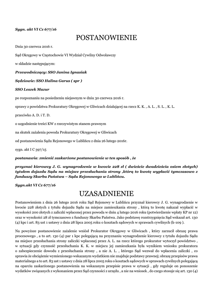 Sygn. akt VI Cz 677/16 POSTANOWIENIE Dnia 30 czerwca 2016 r. Sąd Okręgowy w Częstochowie VI Wydział Cywilny Odwoławczy w składzie następującym: Przewodniczący: SSO Janina Ignasiak Sędziowie: SSO Halina Garus ( spr ) SSO Leszek Mazur po rozpoznaniu na posiedzeniu niejawnym w dniu 30 czerwca 2016 r. sprawy z powództwa Prokuratury Okręgowej w Gliwicach działającej na rzecz K. K. , A. L. , S. L. , K. L. przeciwko A. D. i T. D. o uzgodnienie treści KW z rzeczywistym stanem prawnym na skutek zażalenia powoda Prokuratury Okręgowej w Gliwicach od postanowienia Sądu Rejonowego w Lublińcu z dnia 26 lutego 2016r. sygn. akt I C 397/15 postanawia: zmienić zaskarżone postanowienie w ten sposób , że przyznać kierowcy J. G. wynagrodzenie w kwocie 228 zł ( dwieście dwadzieścia osiem złotych) tytułem dojazdu Sądu na miejsce przesłuchania strony ,którą to kwotę wypłacić tymczasowo z funduszy Skarbu Państwa – Sądu Rejonowego w Lublińcu. Sygn.akt VI Cz 677/16 UZASADNIENIE Postanowieniem z dnia 26 lutego 2016 roku Sąd Rejonowy w Lublińcu przyznał kierowcy J. G. wynagrodzenie w kwocie 228 złotych z tytułu dojazdu Sądu na miejsce zamieszkania strony , którą to kwotę nakazał wypłacić w wysokości 200 złotych z zaliczki wpłaconej przez powoda w dniu 4 lutego 2016 roku (potwierdzenie wpłaty KP nr 12) oraz w wysokości 28 zł tymczasowo z funduszy Skarbu Państwa. Jako podstawę rozstrzygnięcia Sąd wskazał art. 130 (4) kpc i art. 83 ust 1 ustawy z dnia 28 lipca 2005 roku o kosztach sądowych w sprawach cywilnych (k-109 ). Na powyższe postanowienie zażalenie wniósł Prokurator Okręgowy w Gliwicach , który zarzucił obrazę prawa procesowego , a to art. 130 (4) par 1 kpc polegającą na przyznaniu wynagrodzenie kierowcy z tytułu dojazdu Sądu na miejsce przesłuchania strony zaliczki wpłaconej przez A. L. na rzecz którego prokurator wytoczył powództwo , w sytuacji gdy czynność przesłuchania K. K. w miejscu jej zamieszkania była wynikiem wniosku prokuratora o zabezpieczenie dowodu z przesłuchania strony , a nie A. L. , którego Sąd wezwał do wpłacenia zaliczki , co sprawia że obciążenie wymienionego wskazanym wydatkiem nie znajduje podstawy prawnej; obrazę przepisów prawa materialnego a to art. 83 ust 1 ustawy z dnia 28 lipca 2005 roku o kosztach sądowych w sprawach cywilnych polegającą na oparciu zaskarżonego postanowienia na wskazanym przepisie prawa w sytuacji , gdy reguluje on ponoszenie wydatków związanych z wykonaniem przez Sąd czynności z urzędu , a nie na wniosek , do czego stosuje się art. 130 (4) par 1 kpc , co sprawia ,że obciążenia A. L. wydatkiem z tytułu dojazdu do Sądu na miejsce przesłuchania nie znajduje podstawy prawnej. W oparciu o powyższe wnosił o nieprzesyłanie akt do sądu drugiej instancji , uwzględnienia zażalenia jako oczywiście uzasadnionego i uchylenie zaskarżonego postanowienia , ewentualnie – w razie przekazania akt sprawy do sądu drugiej instancji o uchylenie zaskarżonego postanowienia . Sąd Okręgowy zważył , co następuje: W przedmiotowej sprawie Prokurator Okręgowy w Gliwicach skierował do Sądu Rejonowego w Lublińcu pozew na rzecz K. K. , A. L. , S. L. , małoletniego K. L. o usunięcie niezgodności pomiędzy stanem prawnym nieruchomości położonej w miejscowości S. przy ulicy (...) ujawnionym w dziale II księgi wieczystej nr (...) prowadzonej przez Sąd Rejonowy w Lublińcu poprzez ustalenie ,że prawo własności tej nieruchomości – w miejsce błędnie wpisanych na prawach ustawowej wspólności majątkowej T. D. i A. D. –przysługuje K. K. w 3/6 częściach, A. L. w 1/6 części , S. L. w 1/6 części. Powód w pozwie wnosił o przeprowadzenie licznych dowodów w tym m.in. w drodze zabezpieczenia – na podstawie art. 310 kpc w z w. z art. 311 kpc - dowodu z przesłuchania K. K. w charakterze strony. Przedmiotowy dowód został przeprowadzony przez Sąd w dniu 23 lutego 2013 roku , a kierowca J. G. z tytułu dojazdu Sądu na miejsce przesłuchania strony złożył wniosek o przyznanie wynagrodzenie poparty przedłożonym rachunkiem za dojazd taksówką (k – 108 ) . Wcześniej , bo zarządzeniem z dnia 25 stycznia 2016 roku A. L., , został zobowiązany do uiszczenia zaliczki na koszt przeprowadzenia dowodu w kwocie 200 złotych (k - 93). Powyższa kwot wpłynęła na rachunek Sądu Rejonowego w Lublińcu w dniu 4 lutego 2016 roku , a z potwierdzenia wpłaty wynika, że uiściła ją K. K. (k -100). Nie budzi wątpliwości ,że obowiązku uiszczenia kosztów sądowych nie ma strona zwolniona od tych kosztów z mocy ustawy albo przez Sąd . Zwolnienie od kosztów sądowych jest bowiem odstępstwem od zasady ponoszenia przez strony kosztów sądowych w postępowaniu cywilnym (ustawa z dnia 28 lipca 2005 roku o kosztach sadowych w sprawach cywilnych Dz.U. z 2014 roku poz.1025 ze zm ). Zwolnienie ustawowe ma na celu zapewnienie nieodpłatnego dostępu do wymiaru sprawiedliwości określonym kategoriom podmiotów albo stronom określonego rodzaju postępowań . Zwolnienie podmiotowe uregulowane jest w art. 94 i 96 ustawy o kosztach sądowych w sprawach cywilnych a przedmiotowe w art. 95 . Zwolnienie podmiotów wymienionych w art. 96 ust 1 od kosztów sądowych dotyczy zarówno opłat , jak i wydatków , Jest to ustawowe , podmiotowe , całkowite zwolnienie od kosztów sądowych (pewne wyjątki art. 96 ust 1 pkt .4). Powołany art. 96 dotyczy zwolnienia od kosztów postępowania cywilnego , kuratora , prokuratora oraz innych uczestników postępowania Zgodnie z art. 96 ust 1 pkt 6 obowiązku uiszczenia kosztów sądowych nie ma prokurator . Udział prokuratora w postępowaniu cywilnym regulują art. 7 kpc oraz art. 55 -60 kpc. W każdej sytuacji uregulowanych tymi przepisami prokurator nie ma obowiązku uiszczenia kosztów sądowych , co obejmuje zarówno opłaty , jak i wydatki , Czynności zwykle powodujące obowiązek uiszczenia opłat sądowych lub poniesieni