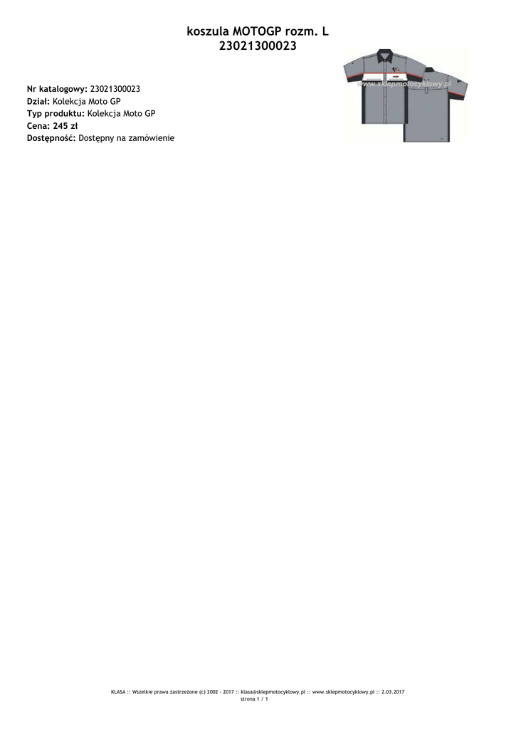 koszula MOTOGP rozm. L 23021300023 Nr katalogowy: 23021300023 Dział: Kolekcja Moto GP Typ produktu: Kolekcja Moto GP Cena: 245 zł Dostępność: Dostępny na zamówienie KLASA :: Wszelkie prawa zastrzeżone (c) 2002 - 2017 :: [email protected] :: www.sklepmotocyklowy.pl :: 2.03.2017 strona 1 / 1