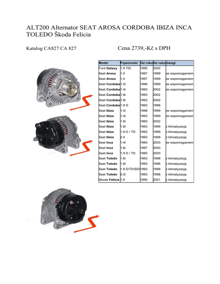 ALT200 Alternator SEAT AROSA CORDOBA IBIZA INCA TOLEDO Škoda Felicia Cena 2739,-Kč s DPH Katalog CA827 CA 827 Model Pojemność Od rokuDo rokuUwagi Ford Galaxy 1.9 TDi 1995 2000 Seat Arosa 1.0 1997 1999 ze wspomaganiem Seat Arosa 1.4 1997 1999 ze wspomaganiem Seat Cordoba1.0i 1996 1999 ze wspomaganiem Seat Cordoba1.4i 1993 2002 ze wspomaganiem Seat Cordoba1.6i 1993 2002 Seat Cordoba1.8i 1993 2002 Seat Cordoba1.9 D 1993 1996 Seat Ibiza 1.0i 1996 1999 ze wspomaganiem Seat Ibiza 1.4i 1993 1999 ze wspomaganiem Seat Ibiza 1.6i 1993 2002 Seat Ibiza 1.8i 1993 1999 z klimatyzacją Seat Ibiza 1.9 D / TD 1993 1999 z klimatyzacją Seat Ibiza 2.0 1993 1999 z klimatyzacją Seat Inca 1.4i 1995 2003 ze wspomaganiem Seat Inca 1.6i 1997 2000 Seat Inca 1.9 D / TD 1995 2000 Seat Toledo 1.6i 1993 1998 z klimatyzacją Seat Toledo 1.8i 1993 1996 z klimatyzacją Seat Toledo 1.9 D/TD/SDi1993 1999 z klimatyzacją Seat Toledo 2.0i 1993 1998 z klimatyzacją Skoda Felicia 1.6 1995 2001 z klimatyzacją