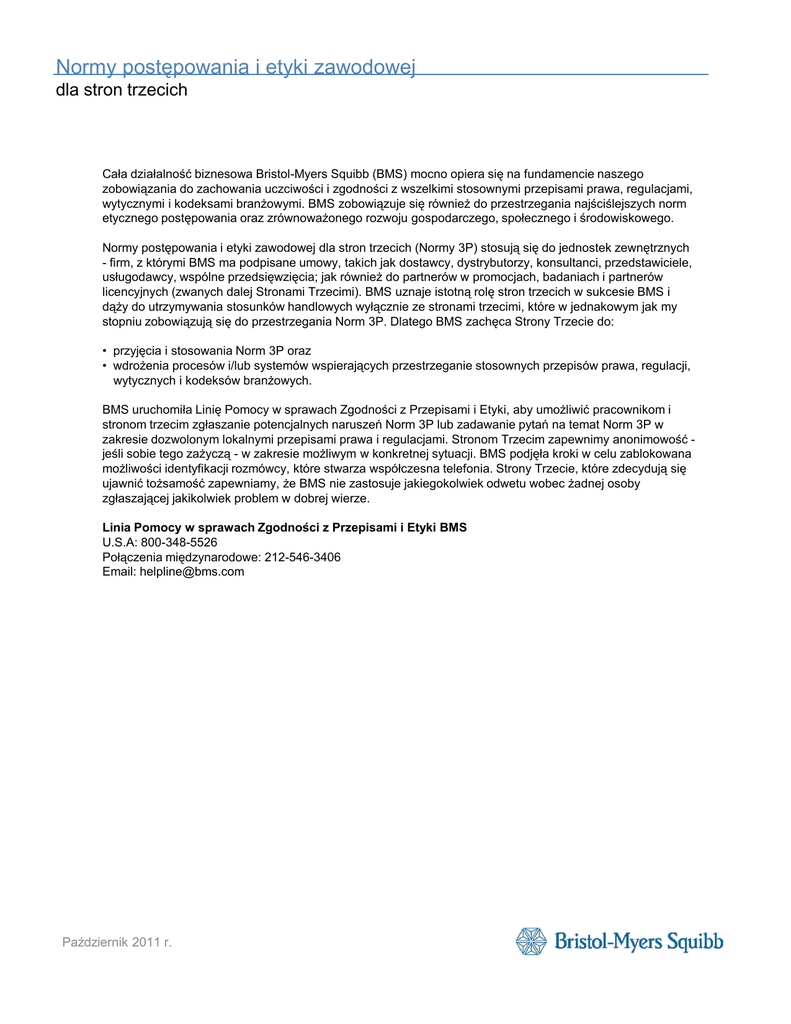 Normy postępowania i etyki zawodowej dla stron trzecich Cała działalność biznesowa Bristol-Myers Squibb (BMS) mocno opiera się na fundamencie naszego zobowiązania do zachowania uczciwości i zgodności z wszelkimi stosownymi przepisami prawa, regulacjami, wytycznymi i kodeksami branżowymi. BMS zobowiązuje się również do przestrzegania najściślejszych norm etycznego postępowania oraz zrównoważonego rozwoju gospodarczego, społecznego i środowiskowego. Normy postępowania i etyki zawodowej dla stron trzecich (Normy 3P) stosują się do jednostek zewnętrznych - firm, z którymi BMS ma podpisane umowy, takich jak dostawcy, dystrybutorzy, konsultanci, przedstawiciele, usługodawcy, wspólne przedsięwzięcia; jak również do partnerów w promocjach, badaniach i partnerów licencyjnych (zwanych dalej Stronami Trzecimi). BMS uznaje istotną rolę stron trzecich w sukcesie BMS i dąży do utrzymywania stosunków handlowych wyłącznie ze stronami trzecimi, które w jednakowym jak my stopniu zobowiązują się do przestrzegania Norm 3P. Dlatego BMS zachęca Strony Trzecie do: • przyjęcia i stosowania Norm 3P oraz • wdrożenia procesów i/lub systemów wspierających przestrzeganie stosownych przepisów prawa, regulacji, wytycznych i kodeksów branżowych. BMS uruchomiła Linię Pomocy w sprawach Zgodności z Przepisami i Etyki, aby umożliwić pracownikom i stronom trzecim zgłaszanie potencjalnych naruszeń Norm 3P lub zadawanie pytań na temat Norm 3P w zakresie dozwolonym lokalnymi przepisami prawa i regulacjami. Stronom Trzecim zapewnimy anonimowość jeśli sobie tego zażyczą - w zakresie możliwym w konkretnej sytuacji. BMS podjęła kroki w celu zablokowana możliwości identyfikacji rozmówcy, które stwarza współczesna telefonia. Strony Trzecie, które zdecydują się ujawnić tożsamość zapewniamy, że BMS nie zastosuje jakiegokolwiek odwetu wobec żadnej osoby zgłaszającej jakikolwiek problem w dobrej wierze. Linia Pomocy w sprawach Zgodności z Przepisami i Etyki BMS U.S.A: 800-348-5526 Połączenia międzynarodowe: 212-546-3406 Email: [email protected] Październik 2011 r. 1 Normy postępowania i etyki zawodowej dla stron trzecich I . Zgodność z przepisami i etyka Strony Trzecie powinny prowadzić działalność z zachowaniem zgodności z wszelkimi odnośnymi przepisami prawa, regulacjami, wytycznymi i kodeksami branżowymi, jak również w sposób etyczny, co obejmuje: 1. Uczciwość biznesową, uczciwą konkurencję i poufność Zabrania się korupcji, wyłudzeń i malwersacji. Stronom Trzecim nie wolno oferować ani przyjmować łapówek, ani stosować żadnych innych nielegalnych form wpływania na decyzje w relacjach handlowych oraz z przedstawicielami rządu. Strony Trzecie powinny prowadzić księgi i rejestry zgodnie z obowiązującymi międzynarodowymi zasadami księgowości. Strony Trzecie powinny prowadzić działalność z zachowaniem zgodności z wszelkimi stosownymi przepisami o uczciwej konkurencji, uczciwych praktykach handlowych i antytrustowymi. Stronom Trzecim nie wolno przekazywać na zewnątrz informacji na temat planów, wyników i zasad polityki wewnętrznej BMS, ani też ujawniać informacji poufnych, które mogłyby wpłynąć na cenę papierów wartościowych BMS. Stronom Trzecim nie wolno ujawniać publicznie żadnych informacji poufnych ani zastrzeżonych na temat jakiegokolwiek aspektu działalności BMS. 2. Praktyki marketingowe i promocyjne Wszelkie materiały i działania marketingowe oraz promocyjne powinny spełniać rygorystyczne normy etyczne, medyczne i naukowe i być zgodne z wszelkimi stosownymi przepisami prawa, regulacjami, wytycznymi i kodeksami branżowymi. 3. Relacje z przedstawicielami służby zdrowia i pacjentami Wszelkie relacje Stron Trzecich z przedstawicielami służby zdrowia lub pacjentami w imieniu BMS powinny odbywać się w sposób etyczny i z zachowaniem zgodności z wszelkimi odnośnymi przepisami prawa, regulacjami, wytycznymi i kodeksami branżowymi. 4. Prawo Farmaceutyczne Strony Trzecie muszą znać przepisy i regulacje obowiązujące w branży farmaceutycznej i ściśle przestrzegać ich. W szczególności Strony Trzecie powinny spełniać wymogi dobrej praktyki wytwarzania, dobrej praktyki klinicznej oraz dobrej praktyki laboratoryjnej obowiązujące w ich krajach. 5. Ochrona danych osobowych Strony Trzecie powinny chronić poufność i bezpieczeństwo danych osobowych swoich pracowników oraz wszelkich danych osobowych, do których uzyskają dostęp w wyniku współpracy z BMS, poprzez wdrożenie odpowiednich środków bezpieczeństwa zgodnych ze stosownymi przepisami. 6. Handel Strony Trzecie powinny przestrzegać wszelkich stosownych przepisów importowych, eksportowych, sankcji i innych przepisów handlowych krajów, w których dokonują transakcji. 7. Dobro zwierząt Zwierzęta należy traktować humanitarnie, oszczędzając im bólu i stresu. Badania na zwierzętach należy prowadzić dopiero po rozważeniu innych opcji, zmniejszać liczbę używanych zwierząt i rewidować procedury w celu zmniejszenia do minimum cierpienia. Alternatywy należy stosować zawsze, jeżeli nie wpłynie to na wartość naukową badań i akceptują to władze nadzorcze. Październik 2011 r. 2 Normy postępowania i etyki zawodowej dla stron trzecich II. Praca Strony Trzecie powinny przestrzegać praw człowieka w odniesieniu do pracowników i traktować ich z szacunkiem i godnością, co obejmuje: 1. Dobrowolny charakter zatrudnienia Stronom Trzecim nie wolno korzystać z pracy osób, wobec których zastosowano przymus, ograniczenie swobody, zniewolenie, z pracy najemnej za utrzymanie lub przymusowej pracy więźniów, ani też angażować się w przemyt ludzi. 2. Praca nieletnich Stronom Trzecim nie wolno zatrudniać dzieci. Młodociani pracownicy poniżej 18. roku życia mogą być zatrudnieni jedynie do pracy nie wiążącej się z niebezpieczeństwem. Wszycy pracownicy zatrudnieni przez Strony Trze