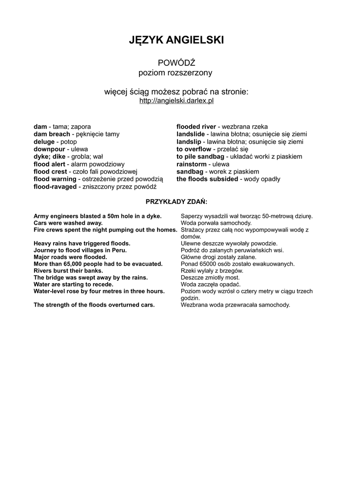 JĘZYK ANGIELSKI POWÓDŹ poziom rozszerzony więcej ściąg możesz pobrać na stronie: http://angielski.darlex.pl dam - tama; zapora dam breach - pęknięcie tamy deluge - potop downpour - ulewa dyke; dike - grobla; wał flood alert - alarm powodziowy flood crest - czoło fali powodziowej flood warning - ostrzeżenie przed powodzią flood-ravaged - zniszczony przez powódź flooded river - wezbrana rzeka landslide - lawina błotna; osunięcie się ziemi landslip - lawina błotna; osunięcie się ziemi to overflow - przelać się to pile sandbag - układać worki z piaskiem rainstorm - ulewa sandbag - worek z piaskiem the floods subsided - wody opadły PRZYKŁADY ZDAŃ: Army engineers blasted a 50m hole in a dyke. Saperzy wysadzili wał tworząc 50-metrową dziurę. Cars were washed away. Woda porwała samochody. Fire crews spent the night pumping out the homes. Strażacy przez całą noc wypompowywali wodę z domów. Heavy rains have triggered floods. Ulewne deszcze wywołały powodzie. Journey to flood villages in Peru. Podróż do zalanych peruwiańskich wsi. Major roads were flooded. Główne drogi zostały zalane. More than 65,000 people had to be evacuated. Ponad 65000 osób zostało ewakuowanych. Rivers burst their banks. Rzeki wylały z brzegów. The bridge was swept away by the rains. Deszcze zmiotły most. Water are starting to recede. Woda zaczęła opadać. Water-level rose by four metres in three hours. Poziom wody wzrósł o cztery metry w ciągu trzech godzin. The strength of the floods overturned cars. Wezbrana woda przewracała samochody.