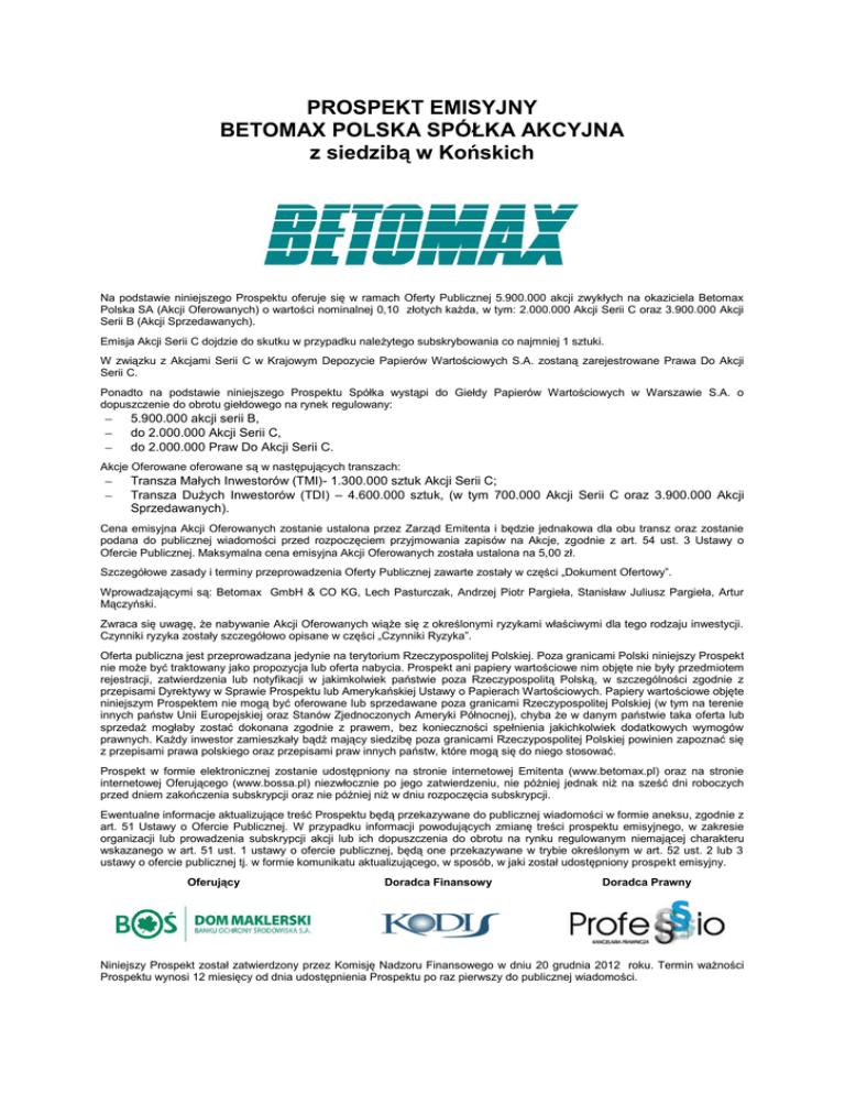 Okładka PROSPEKT EMISYJNY BETOMAX POLSKA SPÓŁKA AKCYJNA z siedzibą w Końskich Na podstawie niniejszego Prospektu oferuje się w ramach Oferty Publicznej 5.900.000 akcji zwykłych na okaziciela Betomax Polska SA (Akcji Oferowanych) o wartości nominalnej 0,10 złotych każda, w tym: 2.000.000 Akcji Serii C oraz 3.900.000 Akcji Serii B (Akcji Sprzedawanych). Emisja Akcji Serii C dojdzie do skutku w przypadku należytego subskrybowania co najmniej 1 sztuki. W związku z Akcjami Serii C w Krajowym Depozycie Papierów Wartościowych S.A. zostaną zarejestrowane Prawa Do Akcji Serii C. Ponadto na podstawie niniejszego Prospektu Spółka wystąpi do Giełdy Papierów Wartościowych w Warszawie S.A. o dopuszczenie do obrotu giełdowego na rynek regulowany: 5.900.000 akcji serii B, do 2.000.000 Akcji Serii C, do 2.000.000 Praw Do Akcji Serii C. Akcje Oferowane oferowane są w następujących transzach: Transza Małych Inwestorów (TMI)- 1.300.000 sztuk Akcji Serii C; Transza Dużych Inwestorów (TDI) – 4.600.000 sztuk, (w tym 700.000 Akcji Serii C oraz 3.900.000 Akcji Sprzedawanych). Cena emisyjna Akcji Oferowanych zostanie ustalona przez Zarząd Emitenta i będzie jednakowa dla obu transz oraz zostanie podana do publicznej wiadomości przed rozpoczęciem przyjmowania zapisów na Akcje, zgodnie z art. 54 ust. 3 Ustawy o Ofercie Publicznej. Maksymalna cena emisyjna Akcji Oferowanych została ustalona na 5,00 zł. Szczegółowe zasady i terminy przeprowadzenia Oferty Publicznej zawarte zostały w części „Dokument Ofertowy”. Wprowadzającymi są: Betomax GmbH & CO KG, Lech Pasturczak, Andrzej Piotr Pargieła, Stanisław Juliusz Pargieła, Artur Mączyński. Zwraca się uwagę, że nabywanie Akcji Oferowanych wiąże się z określonymi ryzykami właściwymi dla tego rodzaju inwestycji. Czynniki ryzyka zostały szczegółowo opisane w części „Czynniki Ryzyka”. Oferta publiczna jest przeprowadzana jedynie na terytorium Rzeczypospolitej Polskiej. Poza granicami Polski niniejszy Prospekt nie może być traktowany jako propozycja lub oferta nabycia. Prospekt ani papiery wartościowe nim objęte nie były przedmiotem rejestracji, zatwierdzenia lub notyfikacji w jakimkolwiek państwie poza Rzeczypospolitą Polską, w szczególności zgodnie z przepisami Dyrektywy w Sprawie Prospektu lub Amerykańskiej Ustawy o Papierach Wartościowych. Papiery wartościowe objęte niniejszym Prospektem nie mogą być oferowane lub sprzedawane poza granicami Rzeczypospolitej Polskiej (w tym na terenie innych państw Unii Europejskiej oraz Stanów Zjednoczonych Ameryki Północnej), chyba że w danym państwie taka oferta lub sprzedaż mogłaby zostać dokonana zgodnie z prawem, bez konieczności spełnienia jakichkolwiek dodatkowych wymogów prawnych. Każdy inwestor zamieszkały bądź mający siedzibę poza granicami Rzeczypospolitej Polskiej powinien zapoznać się z przepisami prawa polskiego oraz przepisami praw innych państw, które mogą się do niego stosować. Prospekt w formie elektronicznej zostanie udostępniony na stronie internetowej Emitenta (www.betomax.pl) oraz na stronie internetowej Oferującego (www.bossa.pl) niezwłocznie po jego zatwierdzeniu, nie później jednak niż na sześć dni roboczych przed dniem zakończenia subskrypcji oraz nie później niż w dniu rozpoczęcia subskrypcji. Ewentualne informacje aktualizujące treść Prospektu będą przekazywane do publicznej wiadomości w formie aneksu, zgodnie z art. 51 Ustawy o Ofercie Publicznej. W przypadku informacji powodujących zmianę treści prospektu emisyjnego, w zakresie organizacji lub prowadzenia subskrypcji akcji lub ich dopuszczenia do obrotu na rynku regulowanym niemającej charakteru wskazanego w art. 51 ust. 1 ustawy o ofercie publicznej, będą one przekazywane w trybie określonym w art. 52 ust. 2 lub 3 ustawy o ofercie publicznej tj. w formie komunikatu aktualizującego, w sposób, w jaki został udostępniony prospekt emisyjny. Oferujący Doradca Finansowy Doradca Prawny Niniejszy Prospekt został zatwierdzony przez Komisję Nadzoru Finansowego w dniu 20 grudnia 2012 roku. Termin ważności Prospektu wynosi 12 miesięcy od dnia udostępnienia Prospektu po raz pierwszy do publicznej wiadomości. Spis Treści Prospekt Betomax Polska S.A. Spis treści PODSUMOWANIE .................................................................................................................................. 8 Dział A – Wstęp i ostrzeżenia ............................................................................................................................. 8 Dział B - Emitent ..................................................................................................................................................8 Dział C – Papiery wartościowe ......................................................................................................................... 14 Dział D - Ryzyko ................................................................................................................................................ 17 Dział E - Oferta .................................................................................................................................................. 18 CZYNNIKI RYZYKA .............................................................................................................................. 25 1. Czynniki ryzyka związane z otoczeniem, w jakim Emitent prowadzi działalność ................................... 25 1.1. Ryzyko związane z sytuacją makroekonomiczną .................................................................................... 25 1.2. Ryzyko walutowe ..................................................................................................................................... 25 1.3. Ryzyko związane z brakiem stabilności systemu podatkowego .............................................................. 25 1.4. Ryzyko związane z braki