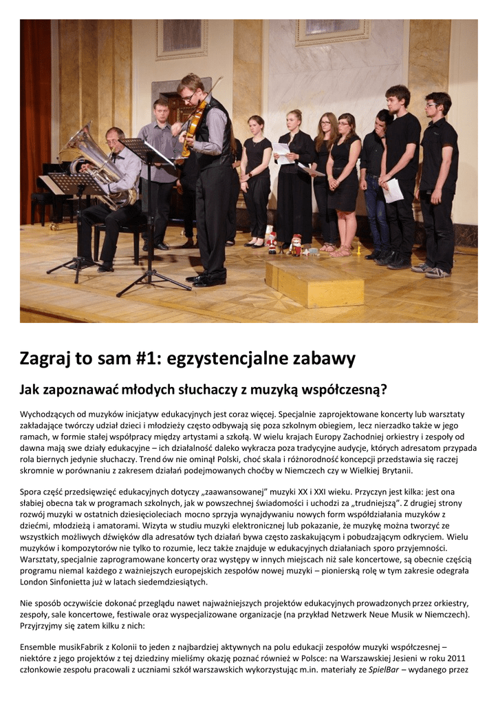 Zagraj to sam #1: egzystencjalne zabawy Jak zapoznawać młodych słuchaczy z muzyką współczesną? Wychodzących od muzyków inicjatyw edukacyjnych jest coraz więcej. Specjalnie zaprojektowane koncerty lub warsztaty zakładające twórczy udział dzieci i młodzieży często odbywają się poza szkolnym obiegiem, lecz nierzadko także w jego ramach, w formie stałej współpracy między artystami a szkołą. W wielu krajach Europy Zachodniej orkiestry i zespoły od dawna mają swe działy edukacyjne – ich działalność daleko wykracza poza tradycyjne audycje, których adresatom przypada rola biernych jedynie słuchaczy. Trend ów nie ominął Polski, choć skala i różnorodność koncepcji przedstawia się raczej skromnie w porównaniu z zakresem działań podejmowanych choćby w Niemczech czy w Wielkiej Brytanii. Spora część przedsięwzięć edukacyjnych dotyczy „zaawansowanej” muzyki XX i XXI wieku. Przyczyn jest kilka: jest ona słabiej obecna tak w programach szkolnych, jak w powszechnej świadomości i uchodzi za „trudniejszą”. Z drugiej strony rozwój muzyki w ostatnich dziesięcioleciach mocno sprzyja wynajdywaniu nowych form współdziałania muzyków z dziećmi, młodzieżą i amatorami. Wizyta w studiu muzyki elektronicznej lub pokazanie, że muzykę można tworzyć ze wszystkich możliwych dźwięków dla adresatów tych działań bywa często zaskakującym i pobudzającym odkryciem. Wielu muzyków i kompozytorów nie tylko to rozumie, lecz także znajduje w edukacyjnych działaniach sporo przyjemności. Warsztaty, specjalnie zaprogramowane koncerty oraz występy w innych miejscach niż sale koncertowe, są obecnie częścią programu niemal każdego z ważniejszych europejskich zespołów nowej muzyki – pionierską rolę w tym zakresie odegrała London Sinfonietta już w latach siedemdziesiątych. Nie sposób oczywiście dokonać przeglądu nawet najważniejszych projektów edukacyjnych prowadzonych przez orkiestry, zespoły, sale koncertowe, festiwale oraz wyspecjalizowane organizacje (na przykład Netzwerk Neue Musik w Niemczech). Przyjrzyjmy się zatem kilku z nich: Ensemble musikFabrik z Kolonii to jeden z najbardziej aktywnych na polu edukacji zespołów muzyki współczesnej – niektóre z jego projektów z tej dziedziny mieliśmy okazję poznać również w Polsce: na Warszawskiej Jesieni w roku 2011 członkowie zespołu pracowali z uczniami szkół warszawskich wykorzystując m.in. materiały ze SpielBar – wydanego przez zespół kompendium pomysłów wykorzystania konkretnych technik i współczesnych utworów w pracy z dziećmi i z młodzieżą. W roku 2012, z uczniami szkół krakowskich, członkowie musikFabrik zrealizowali projekt nawiązujący częściowo do ich wcześniejszego przedsięwzięcia wokół cyklu Stücke der Windrose Mauricio Kagela. Zrealizowany w roku 2002 na większą skalę w Kolonii projekt miał charakter poniekąd dziennikarski: dzieci w wieku od lat siedmiu do trzynastu miały dowiedzieć się jak najwięcej o utworze. Przeznaczona na „orkiestrę salonową” kompozycja Kagela jest muzycznym zapisem myśli, jakie w jej twórcy budzą geograficzne pojęcia „północ”, „wschód” itp., rozpatrywane z perspektywy niekoniecznie europejskiej. Trzeba było porozmawiać o niej z żyjącym jeszcze wtedy kompozytorem, z wykonawcami, słuchaczami, a uzyskane wiadomości przedstawić w najrozmaitszych formach, m.in. prawdziwej audycji radiowej. Od tego czasu zespół musikFabrik rozwinął wiele form edukacyjnej działalności, m.in. we współpracy z Uniwersytetem w Kolonii prowadzi Uniwersytet Dziecięcy – jego słuchacze słuchają wykładów, przygotowują własne wystąpienia, odwiedzają próby zespołu, a po kilku miesiącach otrzymują dyplom uniwersytetu i odpowiedni „stopień naukowy”. Edukacyjne akcje musikFabrik są częścią przedsięwzięć ON Neue Musik Köln – zrzeszenia ponad 30 instytucji muzycznych z regionu, która z kolei dziła w ramach wspomnianej Netzwerk Neue Musik, ogólnokrajowej sieci edukacyjnej zajmującej się muzyką współczesną. Obcowanie z konkretnym dziełem może też przybrać formę działań plastycznych, teatralnych, a także, na przykład, prowadzić do wizyty w studiu muzyki elektroakustycznej i własnych prób obróbki dźwięku (jak choćby przy okazji wykonania Hymnen Stockhausena na kolońskim MusikTriennale w roku 2010). Dla kolońskich muzyków rezultat w postaci polubienia arcydzieła nie zawsze musi być na pierwszym planie – widać to choćby w dokumentacji projektu wokół Stücke der Windrose: jego inicjatorzy w pełni zdawali sobie sprawę, że upodobania dzieci w wieku od jedenastu do trzynastu lat prawie całkowicie kształtowane są przez muzykę popularną i nie próbowali ani z tym walczyć, ani cenzurować sceptycyzmu wobec utworu Kagela, widocznego w niektórych „dziennikarskich” sprawozdaniach. Ważne, że doświadczenia związane z poznawaniem kompozycji i całej jej „otoczki” (biograficzne i kulturowe treści, próby, zachowania słuchaczy, rytuał koncertowy) nie były nudne, lecz pobudzające. W roku 2012 eksperci przyznający co kwartał Nagrodę Płytową Niemieckiej Krytyki Muzycznej podjęli decyzje dość zaskakującą: w kategorii muzyki współczesnej przypadła ona albumowi zatytułowanemu Haltbar gemacht, z utworami skomponowanymi przez dzieci w wieku 10–14 lat. Od roku 1999 kierowany przez perkusistę Matthiasa Kaula i flecistkę Astrid Schmeling zespół L’art por l’art prowadzi w Winsen (Dolna Saksonia) klasę kompozycji dla dzieci i młodzieży w wieku od 7 do 19 lat. Kursy trwają 6 miesięcy, ich inspiracją i punktem wyjścia są dźwięki otoczenia, lecz dźwiękowe fantazje uczestników realizowane są także przy pomocy tradycyjnych instrumentów obsługiwanych przez członków zespołu. Uczestnicząc w niekonwencjonalnym procesie nauczania młodzi kompozytorzy zdobywają zatem umiejętności należące do t