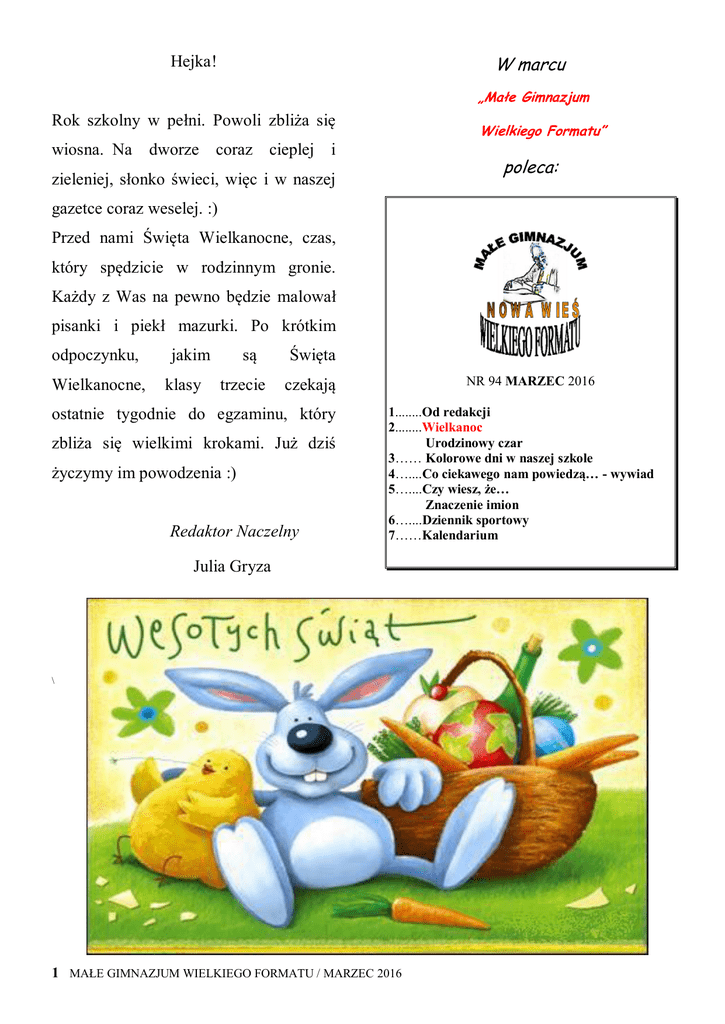 W marcu Hejka! „Małe Gimnazjum Rok szkolny w pełni. Powoli zbliża się wiosna. Na dworze Wielkiego Formatu” coraz cieplej i poleca: zieleniej, słonko świeci, więc i w naszej gazetce coraz weselej. :) Przed nami Święta Wielkanocne, czas, który spędzicie w rodzinnym gronie. Każdy z Was na pewno będzie malował pisanki i piekł mazurki. Po krótkim odpoczynku, Wielkanocne, jakim klasy są trzecie Święta czekają ostatnie tygodnie do egzaminu, który zbliża się wielkimi krokami. Już dziś życzymy im powodzenia :) Redaktor Naczelny NR 94 MARZEC 2016 1........Od redakcji 2........Wielkanoc Urodzinowy czar 3…… Kolorowe dni w naszej szkole 4…....Co ciekawego nam powiedzą… - wywiad 5…....Czy wiesz, że… Znaczenie imion 6…....Dziennik sportowy 7……Kalendarium Julia Gryza \ 1 MAŁE GIMNAZJUM WIELKIEGO FORMATU / MARZEC 2016