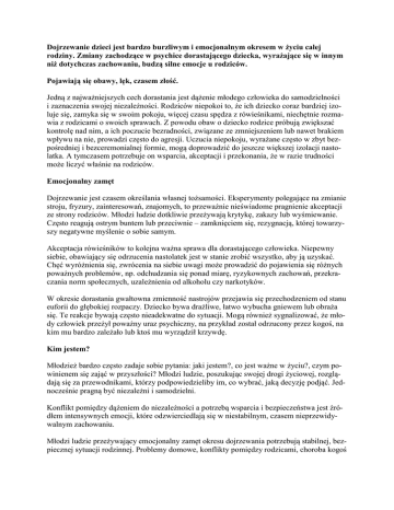 Dojrzewanie dzieci jest bardzo burzliwym i emocjonalnym okresem w życiu całej rodziny. Zmiany zachodzące w psychice dorastającego dziecka, wyrażające się w innym niż dotychczas zachowaniu, budzą silne emocje u rodziców. Pojawiają się obawy, lęk, czasem złość. Jedną z najważniejszych cech dorastania jest dążenie młodego człowieka do samodzielności i zaznaczenia swojej niezależności. Rodziców niepokoi to, że ich dziecko coraz bardziej izoluje się, zamyka się w swoim pokoju, więcej czasu spędza z rówieśnikami, niechętnie rozmawia z rodzicami o swoich sprawach. Z powodu obaw o dziecko rodzice próbują zwiększać kontrolę nad nim, a ich poczucie bezradności, związane ze zmniejszeniem lub nawet brakiem wpływu na nie, prowadzi często do agresji. Uczucia niepokoju, wyrażane często w zbyt bezpośredniej i bezceremonialnej formie, mogą doprowadzić do jeszcze większej izolacji nastolatka. A tymczasem potrzebuje on wsparcia, akceptacji i przekonania, że w razie trudności może liczyć właśnie na rodziców. Emocjonalny zamęt Dojrzewanie jest czasem określania własnej tożsamości. Eksperymenty polegające na zmianie stroju, fryzury, zainteresowań, znajomych, to przeważnie nieświadome pragnienie akceptacji ze strony rodziców. Młodzi ludzie dotkliwie przeżywają krytykę, zakazy lub wyśmiewanie. Często reagują ostrym buntem lub przeciwnie – zamknięciem się, rezygnacją, której towarzyszy negatywne myślenie o sobie samym. Akceptacja rówieśników to kolejna ważna sprawa dla dorastającego człowieka. Niepewny siebie, obawiający się odrzucenia nastolatek jest w stanie zrobić wszystko, aby ją uzyskać. Chęć wyróżnienia się, zwrócenia na siebie uwagi może prowadzić do pojawienia się różnych poważnych problemów, np. odchudzania się ponad miarę, ryzykownych zachowań, przekraczania norm społecznych, uzależnienia od alkoholu czy narkotyków. W okresie dorastania gwałtowna zmienność nastrojów przejawia się przechodzeniem od stanu euforii do głębokiej rozpaczy. Dziecko bywa drażliwe, łatwo wybucha gniewem lub obraża się. Te reakcje bywają często nieadekwatne do sytuacji. Mogą również sygnalizować, że młody człowiek przeżył poważny uraz psychiczny, na przykład został odrzucony przez kogoś, na kim mu bardzo zależało lub ktoś mu wyrządził krzywdę. Kim jestem? Młodzież bardzo często zadaje sobie pytania: jaki jestem?, co jest ważne w życiu?, czym powinienem się zająć w przyszłości? Młodzi ludzie, poszukując swojej drogi życiowej, rozglądają się za przewodnikami, którzy podpowiedzieliby im, co wybrać, jaką decyzję podjąć. Jednocześnie pragną być niezależni i samodzielni. Konflikt pomiędzy dążeniem do niezależności a potrzebą wsparcia i bezpieczeństwa jest źródłem intensywnych emocji, które odzwierciedlają się w niestabilnym, czasem nieprzewidywalnym zachowaniu. Młodzi ludzie przeżywający emocjonalny zamęt okresu dojrzewania potrzebują stabilnej, bezpiecznej sytuacji rodzinnej. Problemy domowe, konflikty pomiędzy rodzicami, choroba kogoś bliskiego, nagłe zmiany sytuacji rodzinnej pogłębiają zachwianie równowagi psychicznej i zwiększają poczucie osamotnienia i bezradności. Kliniczne zaburzenia Wrażliwość nastolatków, ich niepewność, strach przed negatywną oceną, krytycyzm w stosunku do siebie w połączeniu z realnymi problemami w życiu osobistym, rodzinie, szkole czy grupie rówieśniczej mogą być przyczyną poważnych trudności emocjonalnych i prowadzić do wystąpienia objawów klinicznych. Najczęstsze zaburzenia okresu dojrzewania to: anoreksja i bulimia psychiczna (głównie u dziewcząt), depresja (z myślami i czynnościami autoagresywnymi), zaburzenia zachowania (głównie u chłopców), zaburzenia lękowe. Ponad połowa nastolatków w okresie dojrzewania przeżywa poważny kryzys emocjonalny. Często konieczna jest pomoc psychologa, pedagoga, psychoterapeuty, czasem nawet psychiatry. Najistotniejszą sprawą, która może pomóc w pozytywnym rozwiązaniu problemów, jest zmiana relacji pomiędzy rodzicami i dorastającymi dziećmi. Dlatego też najczęściej proponowaną formą pomocy dla nastolatka jest terapia rodzinna. Złe i dobre słowa Bardzo często zdarza się, że rodzice powodowani lękiem lub złością wypowiadają słowa, które ranią dziecko i jeszcze bardziej utrudniają kontakt z nim. Poniżej wyszczególnione są słowa-zdania, które zamiast pomóc w rozwiązaniu problemu mogą go nasilić, wywołując u dziecka żal, poczucie winy, złość, lęk. Są również słowa-zdania, które wypowiedziane spokojnym tonem mogą być wstępem do bliskiej, serdecznej rozmowy, zmierzającej do rozwiązania problemu, albo przynajmniej do wsparcia dziecka w trudnej dla niego sytuacji. Szanujmy się Rodzice, niezależnie od wieku dziecka, powinni liczyć się z jego zdaniem i uczuciami. Dzięki temu mogą zyskać jego zaufanie i dowiedzieć się, z jakiego powodu jest smutne lub rozdrażnione. Kiedy nastolatek powie rodzicom o swoich problemach, nie należy ich bagatelizować ani wyśmiewać. Nie należy też zasypywać dziecka tzw. dobrymi radami. Czasem wystarczy tylko wysłuchać, niekiedy trzeba jeszcze przytulić lub pocieszyć. Zawsze warto zapytać: czy chcesz, żebym ci pomogła?, jak mógłbym ci pomóc?, chętnie ci pomogę, tylko powiedz, co chciałbyś, żebym dla ciebie zrobiła? Jeżeli w danym momencie dziecko nie ma ochoty na rozmowę, nie należy nalegać. Jeśli po godzinie lub dwóch zły nastrój dziecka nie mija, warto spróbować ponownie nawiązać kontakt, zaczynając od słów: widzę, że nadal jesteś w złym nastroju i martwię się o ciebie, powiedz o co chodzi, może będę mogła jakoś ci pomóc. Jeśli dziecko nie podejmie rozmowy, można powiedzieć: jak tylko będziesz miał ochotę porozmawiać, to przyjdź do mnie. Widząc szczere, autentyczne zainteresowanie rodziców oraz ich cier