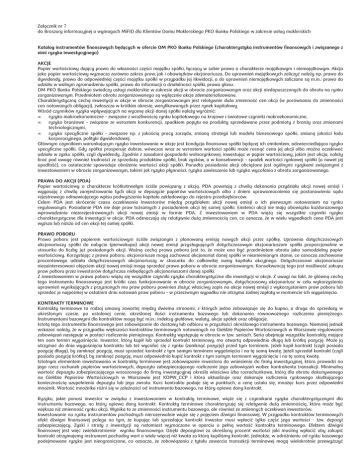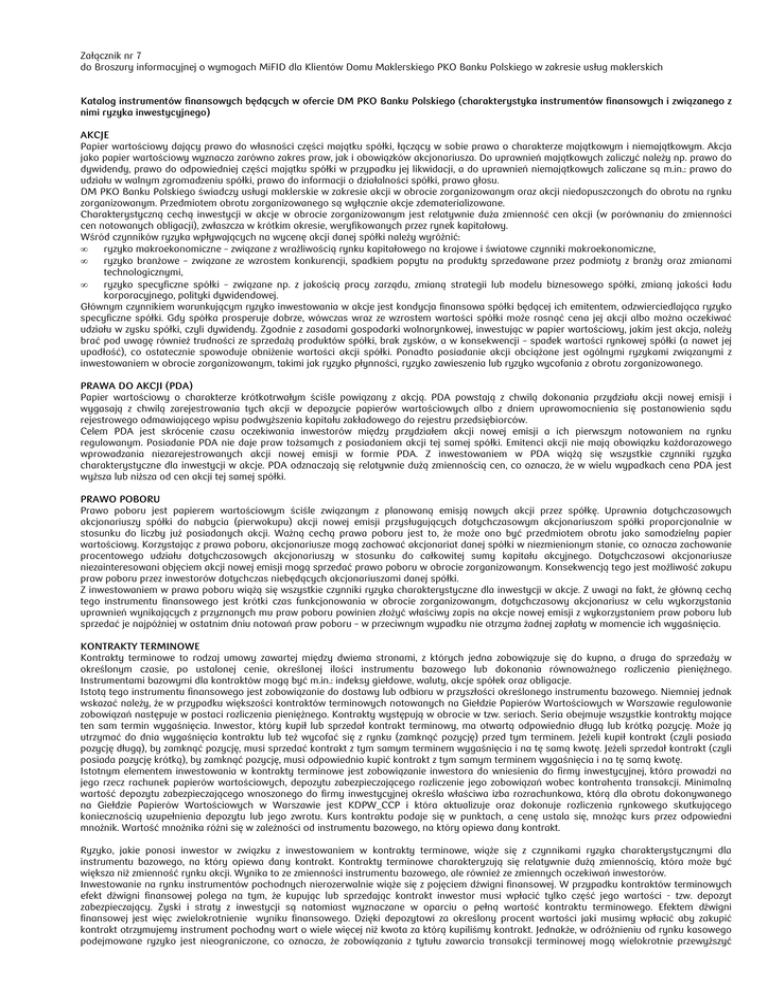 Załącznik nr 7 do Broszury informacyjnej o wymogach MiFID dla Klientów Domu Maklerskiego PKO Banku Polskiego w zakresie usług maklerskich Katalog instrumentów finansowych będących w ofercie DM PKO Banku Polskiego (charakterystyka instrumentów finansowych i związanego z nimi ryzyka inwestycyjnego) AKCJE Papier wartościowy dający prawo do własności części majątku spółki, łączący w sobie prawa o charakterze majątkowym i niemajątkowym. Akcja jako papier wartościowy wyznacza zarówno zakres praw, jak i obowiązków akcjonariusza. Do uprawnień majątkowych zaliczyć należy np. prawo do dywidendy, prawo do odpowiedniej części majątku spółki w przypadku jej likwidacji, a do uprawnień niemajątkowych zaliczane są m.in.: prawo do udziału w walnym zgromadzeniu spółki, prawo do informacji o działalności spółki, prawo głosu. DM PKO Banku Polskiego świadczy usługi maklerskie w zakresie akcji w obrocie zorganizowanym oraz akcji niedopuszczonych do obrotu na rynku zorganizowanym. Przedmiotem obrotu zorganizowanego są wyłącznie akcje zdematerializowane. Charakterystyczną cechą inwestycji w akcje w obrocie zorganizowanym jest relatywnie duża zmienność cen akcji (w porównaniu do zmienności cen notowanych obligacji), zwłaszcza w krótkim okresie, weryfikowanych przez rynek kapitałowy. Wśród czynników ryzyka wpływających na wycenę akcji danej spółki należy wyróżnić: • ryzyko makroekonomiczne – związane z wrażliwością rynku kapitałowego na krajowe i światowe czynniki makroekonomiczne, • ryzyko branżowe – związane ze wzrostem konkurencji, spadkiem popytu na produkty sprzedawane przez podmioty z branży oraz zmianami technologicznymi, • ryzyko specyficzne spółki – związane np. z jakością pracy zarządu, zmianą strategii lub modelu biznesowego spółki, zmianą jakości ładu korporacyjnego, polityki dywidendowej. Głównym czynnikiem warunkującym ryzyko inwestowania w akcje jest kondycja finansowa spółki będącej ich emitentem, odzwierciedlająca ryzyko specyficzne spółki. Gdy spółka prosperuje dobrze, wówczas wraz ze wzrostem wartości spółki może rosnąć cena jej akcji albo można oczekiwać udziału w zysku spółki, czyli dywidendy. Zgodnie z zasadami gospodarki wolnorynkowej, inwestując w papier wartościowy, jakim jest akcja, należy brać pod uwagę również trudności ze sprzedażą produktów spółki, brak zysków, a w konsekwencji – spadek wartości rynkowej spółki (a nawet jej upadłość), co ostatecznie spowoduje obniżenie wartości akcji spółki. Ponadto posiadanie akcji obciążone jest ogólnymi ryzykami związanymi z inwestowaniem w obrocie zorganizowanym, takimi jak ryzyko płynności, ryzyko zawieszenia lub ryzyko wycofania z obrotu zorganizowanego. PRAWA DO AKCJI (PDA) Papier wartościowy o charakterze krótkotrwałym ściśle powiązany z akcją. PDA powstają z chwilą dokonania przydziału akcji nowej emisji i wygasają z chwilą zarejestrowania tych akcji w depozycie papierów wartościowych albo z dniem uprawomocnienia się postanowienia sądu rejestrowego odmawiającego wpisu podwyższenia kapitału zakładowego do rejestru przedsiębiorców. Celem PDA jest skrócenie czasu oczekiwania inwestorów między przydziałem akcji nowej emisji a ich pierwszym notowaniem na rynku regulowanym. Posiadanie PDA nie daje praw tożsamych z posiadaniem akcji tej samej spółki. Emitenci akcji nie mają obowiązku każdorazowego wprowadzania niezarejestrowanych akcji nowej emisji w formie PDA. Z inwestowaniem w PDA wiążą się wszystkie czynniki ryzyka charakterystyczne dla inwestycji w akcje. PDA odznaczają się relatywnie dużą zmiennością cen, co oznacza, że w wielu wypadkach cena PDA jest wyższa lub niższa od cen akcji tej samej spółki. PRAWO POBORU Prawo poboru jest papierem wartościowym ściśle związanym z planowaną emisją nowych akcji przez spółkę. Uprawnia dotychczasowych akcjonariuszy spółki do nabycia (pierwokupu) akcji nowej emisji przysługujących dotychczasowym akcjonariuszom spółki proporcjonalnie w stosunku do liczby już posiadanych akcji. Ważną cechą prawa poboru jest to, że może ono być przedmiotem obrotu jako samodzielny papier wartościowy. Korzystając z prawa poboru, akcjonariusze mogą zachować akcjonariat danej spółki w niezmienionym stanie, co oznacza zachowanie procentowego udziału dotychczasowych akcjonariuszy w stosunku do całkowitej sumy kapitału akcyjnego. Dotychczasowi akcjonariusze niezainteresowani objęciem akcji nowej emisji mogą sprzedać prawo poboru w obrocie zorganizowanym. Konsekwencją tego jest możliwość zakupu praw poboru przez inwestorów dotychczas niebędących akcjonariuszami danej spółki. Z inwestowaniem w prawa poboru wiążą się wszystkie czynniki ryzyka charakterystyczne dla inwestycji w akcje. Z uwagi na fakt, że główną cechą tego instrumentu finansowego jest krótki czas funkcjonowania w obrocie zorganizowanym, dotychczasowy akcjonariusz w celu wykorzystania uprawnień wynikających z przyznanych mu praw poboru powinien złożyć właściwy zapis na akcje nowej emisji z wykorzystaniem praw poboru lub sprzedać je najpóźniej w ostatnim dniu notowań praw poboru – w przeciwnym wypadku nie otrzyma żadnej zapłaty w momencie ich wygaśnięcia. KONTRAKTY TERMINOWE Kontrakty terminowe to rodzaj umowy zawartej między dwiema stronami, z których jedna zobowiązuje się do kupna, a druga do sprzedaży w określonym czasie, po ustalonej cenie, określonej ilości instrumentu bazowego lub dokonania równoważnego rozliczenia pieniężnego. Instrumentami bazowymi dla kontraktów mogą być m.in.: indeksy giełdowe, waluty, akcje spółek oraz obligacje. Istotą tego instrumentu finansowego jest zobowiązanie do dostawy lub odbioru w przyszłości określonego instrumentu bazowego. Niemniej jednak wskazać należy, że w przypadku większości kontraktów terminowych notowanych na Giełdzie Papi