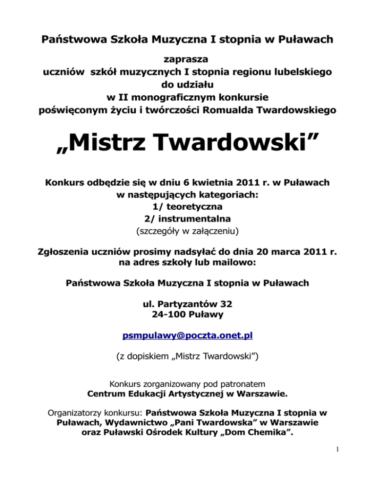 Państwowa Szkoła Muzyczna I stopnia w Puławach zaprasza uczniów szkół muzycznych I stopnia regionu lubelskiego do udziału w II monograficznym konkursie poświęconym życiu i twórczości Romualda Twardowskiego „Mistrz Twardowski” Konkurs odbędzie się w dniu 6 kwietnia 2011 r. w Puławach w następujących kategoriach: 1/ teoretyczna 2/ instrumentalna (szczegóły w załączeniu) Zgłoszenia uczniów prosimy nadsyłać do dnia 20 marca 2011 r. na adres szkoły lub mailowo: Państwowa Szkoła Muzyczna I stopnia w Puławach ul. Partyzantów 32 24-100 Puławy [email protected] (z dopiskiem „Mistrz Twardowski”) Konkurs zorganizowany pod patronatem Centrum Edukacji Artystycznej w Warszawie. Organizatorzy konkursu: Państwowa Szkoła Muzyczna I stopnia w Puławach, Wydawnictwo „Pani Twardowska” w Warszawie oraz Puławski Ośrodek Kultury „Dom Chemika”. 1 Załącznik nr 1 Regulamin konkursu Kategoria teoretyczna Informacje ogólne 1. Celem Konkursu jest: a/ poszerzenie wiedzy na temat życia i twórczości Romualda Twardowskiego wśród uczniów szkół muzycznych I stopnia regionu lubelskiego, b/ popularyzacja dokonań współczesnych kompozytorów polskich, c/ propagowanie wśród młodego pokolenia polskiej muzyki współczesnej, d/ integracja nauczycieli i uczniów szkół muzycznych regionu lubelskiego, e/ zainteresowanie nauczycieli polską muzyką współczesną. 2. Konkurs przeznaczony jest dla uczniów klas V i VI cyklu 6-letniego oraz III i IV cyklu 4-letniego szkół muzycznych I stopnia Regionu Lubelskiego. 3. Jury powołane zostanie przez CEA w Warszawie. 4. Decyzje Jury są ostateczne. 5. Konkurs odbędzie się 6 kwietnia 2011 r. w Państwowej Szkole Muzycznej I stopnia w Puławach, ul. Partyzantów 32. Początek Konkursu o godz. 9.30. 6. Prosimy o nadsyłanie zgłoszeń na kartach wg załączonego wzoru (załącznik nr 1 do regulaminu) na adres: Państwowa Szkoła Muzyczna I stopnia w Puławach, ul. Partyzantów 32, 24-100 Puławy lub mailem na adres: [email protected] z dopiskiem „Mistrz Twardowski” - do dnia 20 marca 2011 r. (regulamin i karta zgłoszenia dostępna jest także na stronie internetowej szkoły: www.szkolamuzycznapulawy.pl) 7. Warunkiem uczestnictwa w Konkursie jest opłacenie bezzwrotnego wpisowego w kwocie 35 zł od uczestnika (kwota ta zostanie przeznaczona na potrzeby organizacyjne konkursu). Wpłat należy dokonywać na konto Rady Rodziców przy Państwowej Szkole Muzycznej I stopnia w Puławach, nr konta: 93873600062001000294630001 najpóźniej do dnia 20 marca 2011 r. Prosimy o przesłanie xero dowodu wpłaty wraz ze zgłoszeniem. 8. Organizator nie zwraca kosztów podróży. 9. Istnieje możliwość rezerwacji obiadów. 10. Dla zwycięzców Konkursu przewidziano nagrody rzeczowe oraz dyplomy laureatów. 2 Pozostali uczniowie otrzymają dyplomy uczestnictwa. 11. Na zakończenie konkursu odbędzie się specjalny koncert, w którym wystąpią laureaci konkursu instrumentalnego oraz zaproszeni goście. Podczas koncertu przewidziano ceremonię wręczenia nagród i dyplomów. 12. Bliższych informacji na temat Konkursu udzielają: Sekretariat Szkoły: tel. 081/ 888 58 50 Beata Fabiańska: tel. 0 605 560 830 Przebieg konkursu Forma - Test jednokrotnego wyboru (każde pytanie zawiera cztery odpowiedzi, z których tylko jedna jest prawdziwa) – obejmuje część teoretyczną i słuchową. Za każdą dobrą odpowiedź uczestnik otrzymuje jeden punkt. Zwycięzcą jest osoba, która uzyskała największą ilość punktów. Czas trwania - 60 minut Wymagania: a/ znajomość wiedzy na temat życia i twórczości Romualda Twardowskiego w zakresie ujętym w podanej bibliografii oraz w materiałach przygotowanych przez Wydawnictwo „Pani Twardowska” (wszystkie materiały, w tym wyciągi z bibliografii, zostaną przesłane do szkół, które zgłoszą udział uczniów w konkursie). Książka „Było, nie minęło” jest również do nabycia w Wydawnictwie „Pani Twardowska” www.twardowska.com.pl b/ znajomość słuchowa wybranych utworów Romualda Twardowskiego w zakresie ujętym w podanej literaturze. Bibliografia: 1. Materiały biograficzne przygotowane przez Wydawnictwo „Pani Twardowska” (ksero wydruków komputerowych) 2. „Było, nie minęło” - Romuald Twardowski – Wspomnienia Kompozytora – Rozdział I-III tj. str. 3-40 (Wydanie pierwsze, Wydawnictwo „Pani Twardowska”, Warszawa 2000) 3. „Romuald Twardowski” - Kompozytor w zwierciadle krytyki – Rozdział „Listy” tj. str. 79-88 (Wydanie pierwsze, Wydawnictwo „Pani Twardowska”, Warszawa 2009). Literatura muzyczna: 1. Melodie Hebrajskie (1977) I. Cadenza I. Maestoso II. Marcato III. Andante IV. Allegretto 2. 3 fragmenty z baletu „Nagi Książe” (1960) 3 I. Taniec Błazna II. Krawcy II III. Marsz 3. Sonatina na dwoje skrzypiec (1993) I. Con moto II. Adagio III. Allegro giocoso 4. Canzona na wiolonczelę i fortepian (1962) 5. 3 etiudy-kaprysy na skrzypce solo (1993) I. Allegro II. Andante capricioso III. Allegro 6. Tango na wiolonczelę i fortepian (2004) 7. Tryptyk Mariacki (1973) I. The Manger in Bethlehem II. Dance I III. The Entombment IV. Dance II V. Ressurection 8. Koncert Staropolski (1988) I. Allegro marcato II. Pomposo III. Allegro giocoso 9. Serenada (2003) I. Allegro non troppo II. Andante espressivo III. Con brio 10. Oberek (1955) 11. Burleska (1990) 12. Capriccio in blue G. Gershwin in memoriam (1991) 13. Miniatury (1957) I. Burleska II. Intermezzo III. Mazurek 14. Mała sonata (1958) I. Veloce II. Toccata III. Arietta IV. Finale 15. Humoreska (2000) 4 „Mistrz Twardowski” II monograficzny konkurs poświęcony życiu i twórczości Romualda Twardowskiego Kategoria teoretyczna KARTA ZGŁOSZENIA 4. Imiona i nazwiska uczestników, klasa, nauczyciel …............................................................................................................................................ …...................................................