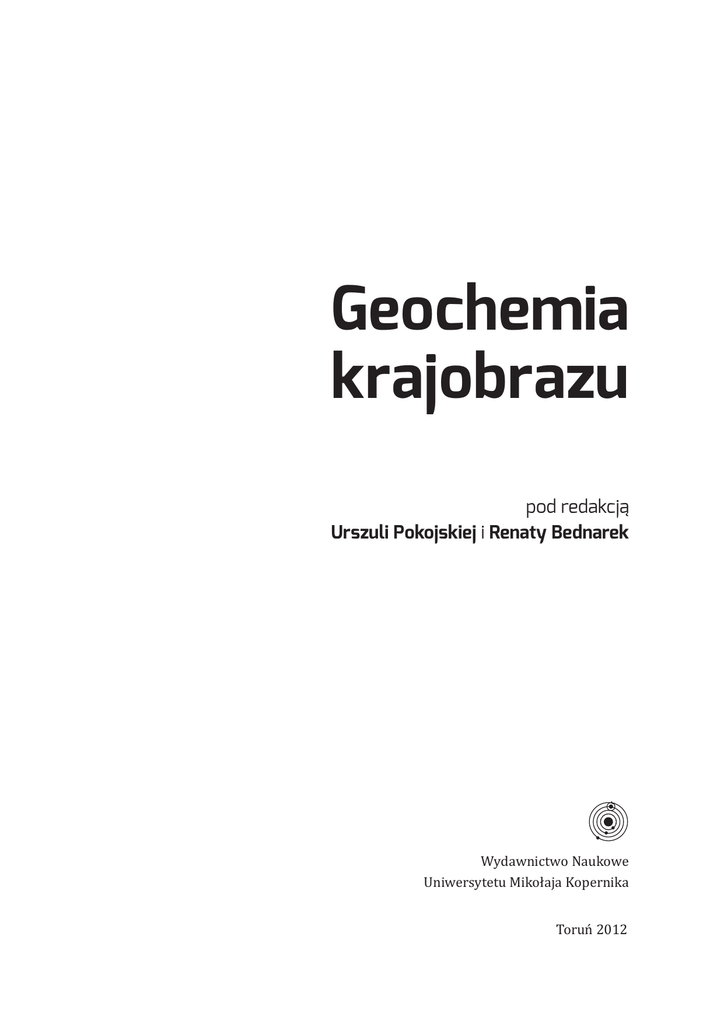 Geochemia krajobrazu pod redakcją Urszuli Pokojskiej i Renaty Bednarek Ï ÑʹͲͳʹ SPIS TREŚCI Spis treści Spis treści Przedmowa ..................................................................................................... 11 CZĘŚĆ 1. WIADOMOŚCI WPROWADZAJĄCE Rozdział I. Elementy chemii ogólnej (Urszula Pokojska) ................... 17 1. Chemiczne podstawy budowy materii.............................................. 17 2. Prawo okresowości i układ okresowy pierwiastków Mendelejewa ... 18 3. Budowa atomów ................................................................................ 19 4. Jednostka masy atomowej. Pojęcie mola i masy molowej ............... 22 5. Rozmieszczenie elektronów wokół jądra atomowego...................... 23 6. Współczesny układ okresowy pierwiastków .................................... 26 7. Elektrony walencyjne a wiązania chemiczne.................................... 7.1. Rodzaje wiązań chemicznych ............................................ 27 30 8. Oddziaływania międzycząsteczkowe ................................................ 34 9. Związki kompleksowe. Chelaty ......................................................... 36 10. Roztwory wodne ................................................................................ 10.1. Budowa cząsteczki H2O i właściwości wody ..................... 10.2. Mechanizmy rozpuszczania substancji stałych ................ 10.3. Dysocjacja elektrolitów. Elektrolity mocne i słabe ........... 10.4. Dysocjacja wody. Iloczyn jonowy wody............................. 10.5. Odczyn. Skala pH ............................................................... 10.6. Hydroliza soli ..................................................................... 10.7. Roztwory buforowe ............................................................ 10.8. Rozpuszczalność. Stężenie roztworów i sposoby jego wyrażania ........................................................................... 10.9. Roztwór idealny i rzeczywisty ........................................... 38 38 41 44 46 47 48 49 11. Układy koloidalne .............................................................................. 54 12. Utlenianie i redukcja .......................................................................... 12.1. Potencjały redoks ............................................................... 56 57 Literatura .................................................................................................. 60 50 53 6 · SPIS TREŚCI Rozdział II. Elementy krystalochemii (Urszula Pokojska) ................ 61 1. Stan krystaliczny materii, ciało krystaliczne, kryształ...................... 61 2. Związek krystalochemii z pokrewnymi dziedzinami nauki .............. 62 3. Budowa kryształów w świetle krystalografii strukturalnej i geometrycznej ................................................................................... 3.1. Typy komórek elementarnych i układy krystalograficzne................................................................ 63 64 4. Struktura kryształów w świetle krystalochemii ................................ 4.1. Typy kryształów a rodzaj wiązań chemicznych ................ 4.1.1. Kryształy jonowe .............................................. 4.1.2. Kryształy kowalencyjne.................................... 4.1.3. Kryształy o wiązaniach pośrednich jonowo-kowalencyjnych ............................................... 4.1.4. Kryształy o wiązaniach metalicznych i mieszanych...................................................... 4.2. Pokrewieństwo krystalochemiczne pierwiastków. Diadochia. Izomorfizm ...................................................... 4.2.1. Diadochia a współwystępowanie pierwiastków w minerałach ............................. 4.3. Polimorfizm ........................................................................ 67 69 69 70 77 78 Literatura .................................................................................................. 80 Rozdział III. Elementy geochemii (Urszula Pokojska) ........................ 81 1. Geochemia jako nauka ........................................................................ 81 2. Budowa Ziemi i podstawowe właściwości materii ziemskiej ............ 83 3. Stosunki ilościowe pierwiastków chemicznych w geosferach zewnętrznych ...................................................................................... 3.1. Skorupa ziemska ................................................................ 3.2. Hydrosfera .......................................................................... 3.3. Atmosfera ........................................................................... 3.4. Klarki pierwiastków ........................................................... 86 86 88 89 91 73 73 74 4. Procesy geologiczne kierujące rozmieszczeniem pierwiastków chemicznych w skorupie ziemskiej ..................................................... 93 4.1. Procesy magmowe .............................................................. 95 4.2. Procesy hipergeniczne ....................................................... 101 4.3. Procesy metamorficzne...................................................... 102 SPIS TREŚCI · 7 5. Stosunek geochemii krajobrazu do geochemii ................................... 103 Literatura .................................................................................................. 104 CZĘŚĆ 2. PODSTAWY GEOCHEMII KRAJOBRAZU Rozdział IV. Geochemia krajobrazu jako nauka (Katarzyna Ostaszewska) .................................................... 107 1. Pojęcie krajobrazu w naukach przyrodniczych .................................. 107 2. Miejsce geochemii krajobrazu w systemie nauk ................................ 109 3. Geochemia krajobrazu w tradycyjnym ujęciu szkoły rosyjskiej................................................................................... 110 3.1. Rys historyczny