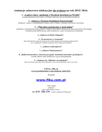 Animacje zabawowo-edukacyjne do wyboru na rok 2015/ 2016: 1. „Ludowe show- spotkanie z Wesołym Strachem na Wróble” (szereg humorystycznych zabaw w klimacie ludowym i gra na dźwiękowym płocie); 2. „Zabawa z Wesołym Wodnikiem Panem Kroplą” (konkursy i zabawy z mieszkańcami oceanów, jezior i kałuży z muzyką rozrywkową i poważną) 3. „Mini show perkusyjne w stylu latino” (spotkanie z instrumentami perkusyjnymi w klimacie latynoskim- okazja do gry gorących rytmów dla każdego w dodatku przed publicznością; tańce konkursowe, salsa, warsztaty gry na dłoniach); 4 .„Zabawa na Dzień Chłopaka” 5. „W powietrzu i w kosmosie” (jak zrobić dźwięk wiatru na maszynie do wiatru? poznawanie brzmień„pompowanych” oraz „wybijanych, zimnych i gorących; dzieci stają się kosmitami) 6. „Zabawa Andrzejkowa” 7. „Zabawa Walentynkowa” 8. „Balik Karnawałowy, taneczna przygoda- dyskoteka latynosko- przebojowa” (wesoła zabawa, tańce konkursowe i gra na instrumentach) 9. „ Radosny Św. Mikołaj w przedszkolu” (dzieci prezentują swoje talenty przed Mikołajem, a poza tym niespodzianki, zabawy oraz tańce) CENA: 350,-zł (co 4-te przedstawienie w roku szkolnym- rabat 50%) Kontakt: www.fiku.com.pl FIKU MIKU animator: mgr sztuki Tomasz Joniec tel: 515- 726-174 e-mail: [email protected]