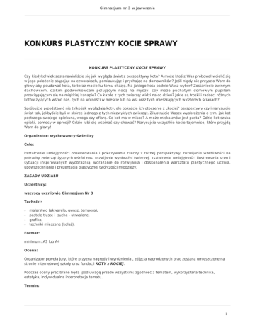 Gimnazjum nr 3 w Jaworznie KONKURS PLASTYCZNY KOCIE SPRAWY KONKURS PLASTYCZNY KOCIE SPRAWY Czy kiedykolwiek zastanawialiście się jak wygląda świat z perspektywy kota? A może ktoś z Was próbował wcielić się w jego położenie stąpając na czworakach, pomiaukując i prychając na domowników? Jeśli nigdy nie przyszło Wam do głowy aby poudawać kota, to teraz macie ku temu okazję. Na jakiego kota padnie Wasz wybór? Zostaniecie zwinnym dachowcem, dzikim podwórkowcem polującym nocą na myszy, czy może puchatym domowym pupilem przeciągającym się na miękkiej kanapie? Co każde z tych zwierząt widzi na co dzień? Jakie są troski i radości różnych kotów żyjących wśród nas, tych na wolności w mieście lub na wsi oraz tych mieszkających w czterech ścianach? Spróbujcie przedstawić nie tylko jak wyglądają koty, ale pokażcie ich otoczenie z „kociej” perspektywy czyli narysujcie świat tak, jakbyście byli w skórze jednego z tych niezwykłych zwierząt. Zilustrujcie Wasze wyobrażenia o tym, jak kot postrzega swojego opiekuna, wroga czy ofiarę. Co kot ma w misce? A może miska znów jest pusta? Gdzie kot szuka opieki, pomocy w opresji? Gdzie lubi się wspinać czy chować? Narysujcie wszystkie kocie tajemnice, które przyjdą Wam do głowy! Organizator: wychowawcy świetlicy Cele: kształcenie umiejętności obserwowania i pokazywania rzeczy z różnej perspektywy, rozwijanie wrażliwości na potrzeby zwierząt żyjących wśród nas, rozwijanie wyobraźni twórczej, kształcenie umiejętności ilustrowania scen i sytuacji inspirowanych wyobraźnią, wdrażanie do rozwijania i doskonalenia warsztatu plastycznego ucznia, upowszechnianie i prezentacja plastycznej twórczości młodzieży. ZASADY UDZIAŁU Uczestnicy: wszyscy uczniowie Gimnazjum Nr 3 Techniki: ❍ ❍ ❍ ❍ malarstwo (akwarela, gwasz, tempera), pastele tłuste i suche - utrwalone, grafika, techniki mieszane (kolaż), Format: minimum: A3 lub A4 Ocena: Organizator powoła jury, które przyzna nagrody i wyróżnienia , zdjęcia nagrodzonych prac zostaną umieszczone na stronie internetowej szkoły oraz fundacji KOTY z KOCIEJ. Podczas oceny prac brane będą pod uwagę przede wszystkim: zgodność z tematem, wykorzystana technika, estetyka, indywidualna interpretacja tematu. Termin: 1 Gimnazjum nr 3 w Jaworznie Prace wykonane zgodnie z regulaminem należy dostarczyć do świetlicy szkolnej do dn. 10.12.2016r. ZAPRASZAMY !!! NAGRODY CZEKAJĄ !!! 2