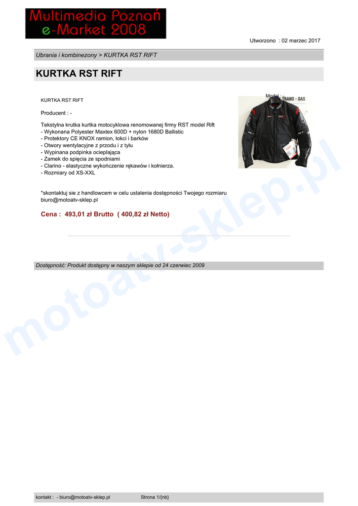 Utworzono : 02 marzec 2017 Ubrania i kombinezony > KURTKA RST RIFT KURTKA RST RIFT Model : - KURTKA RST RIFT Producent : Tekstylna krutka kurtka motocyklowa renomowanej firmy RST model Rift - Wykonana Polyester Maxtex 600D + nylon 1680D Ballistic - Protektory CE KNOX ramion, łokci i barków - Otwory wentylacyjne z przodu i z tyłu - Wypinana podpinka ocieplająca - Zamek do spięcia ze spodniami - Clarino - elastyczne wykończenie rękawów i kołnierza. - Rozmiary od XS-XXL *skontaktuj sie z handlowcem w celu ustalenia dostępności Twojego rozmiaru [email protected] v t a o t o Dostępność: Produkt dostępny w naszym sklepie od 24 czerwiec 2009 m kontakt : - [email protected] Strona 1/{nb} p le k -s Cena : 493,01 zł Brutto ( 400,82 zł Netto) l .p