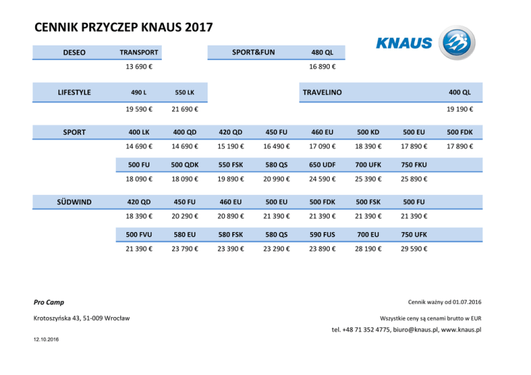 CENNIK PRZYCZEP KNAUS 2017 DESEO TRANSPORT LIFESTYLE 490 L SPORT 13 690 € 21 690 € 400 LK 400 QD 450 FU 460 EU 19 190 € 500 KD 500 EU 14 690 € 15 190 € 16 490 € 17 090 € 18 390 € 17 890 € 18 090 € 19 890 € 20 990 € 24 590 € 25 390 € 25 890 € 420 QD 450 FU 460 EU 500 EU 500 FDK 500 FSK 500 FU 550 FSK 580 QS 650 UDF 700 UFK 750 FKU 18 390 € 20 290 € 20 890 € 21 390 € 21 390 € 21 390 € 21 390 € 21 390 € 23 790 € 23 390 € 23 290 € 23 890 € 28 190 € 29 590 € Krotoszyńska 43, 51-009 Wrocław 12.10.2016 420 QD 400 QL 500 QDK 500 FVU Pro Camp 16 890 € 500 FU 18 090 € SÜDWIND 480 QL TRAVELINO 550 LK 19 590 € 14 690 € SPORT&FUN 580 EU 580 FSK 580 QS 590 FUS 700 EU 500 FDK 17 890 € 750 UFK Cennik ważny od 01.07.2016 Wszystkie ceny są cenami brutto w EUR tel. +48 71 352 4775, [email protected], www.knaus.pl PROMOCJA - WYPOSAŻENIE DODATKOWE GRATIS !!! Zamawając przyczepę otrzymują Państwo w cenie przyczepy bogate wyposażenie dodatkowe. Lista wyposażenia dodatkowego wg poszczególnych serii przyczep. SPORT- wyposażenie o wartości do 3830 EUR zestaw naprawczy do kół stabilne nogi wsporcze SÜDWIND - wyposażenie o wartości około 4 150 EUR przykrycie dyszla rozbudowany prysznic (wylewka prysznicowa, zasłonka+szyna prysznicowa) rozbudowany prysznic (wylewka prysznicowa, zasłonka+szyna prysznicowa) zbiornik na wodę brudną 25l, w skrzyni gazowej okno dachowe 28 x 28 cm w toalecie (w zależności od modelu) kanapy z możliwością przebudowy na łóżka (w zależności od modelu) duża lodówka automatyczna, 189 litrów (zależnie od modelu) kanapy z możliwością przebudowy na łóżka (w zależności od modelu) okno na ścianie przedniej panoramiczne okno dachowe Heki II moskitiera na całe drzwi oświetlenie Ambiente nakładka nad kuchnią z 2 punktami świetlnymi SÜDWIND SILVER SELECTION EDITION gładkie sciany boczne i dekoracja Silver Edition imitująca szczotkowane srebro felgi aluminiowe panoramiczne okno dachowe HEKI II moskitiera na całe drzwi wejściowe stabilne nogi wsporcze okno na ścianie przedniej (oprócz modelu EU) przykrycie dyszla gniazdo zewnętrzne (prąd + TV), wysięgnik na TV (w zależności od modelu) 2 x gniazdo USB duża lodówka automatyczna, 189 litrów (zależnie od modelu) wyciąg kuchenny materace sprężynowe + narzuta na łóżka stałe okno na ścianie przedniej zestaw naprawczy do kół panoramiczne okno dachowe Heki II moskitiera na całe drzwi wejściowe stabilne nogi wsporcze oświetlenie Ambiente LIFESTYLE - wyposażenie o wartości 1348 EUR Zestaw naprawczy do kół (Terra S) Stabilne nogi wsporcze Rozbudowa prysznica: wyciągana wylewka prysznicowa z uchwytem , zasłonka prysznicowa Panoramiczne okno dachowe HEKI II Moskitiera drzwiowa na całe drzwi łączenie łóżek oddzielnych (zależnie od modelu) poszerzenie łóżka składanego w kanapie (zależnie od modelu) Wszystkie ceny są cenami brutto w EUR duża lodówka automatyczna, 189 litrów (zależnie od modelu) PRO CAMP Krotoszyńska 43, 51-009 Wrocław oświetlenie Ambiente Zastrzega się prawo do zmian. komfortowe materace KNAUS (sprężynowe), pakiet dekoracyjny (narzuta, 4 poduszki, obrusy) rozbudowany prysznic (wylewka prysznicowa, zasłonka+szyna prysznicowa) tapicerka: Machart tel. +48 71 352 4775, [email protected], www.knaus.pl