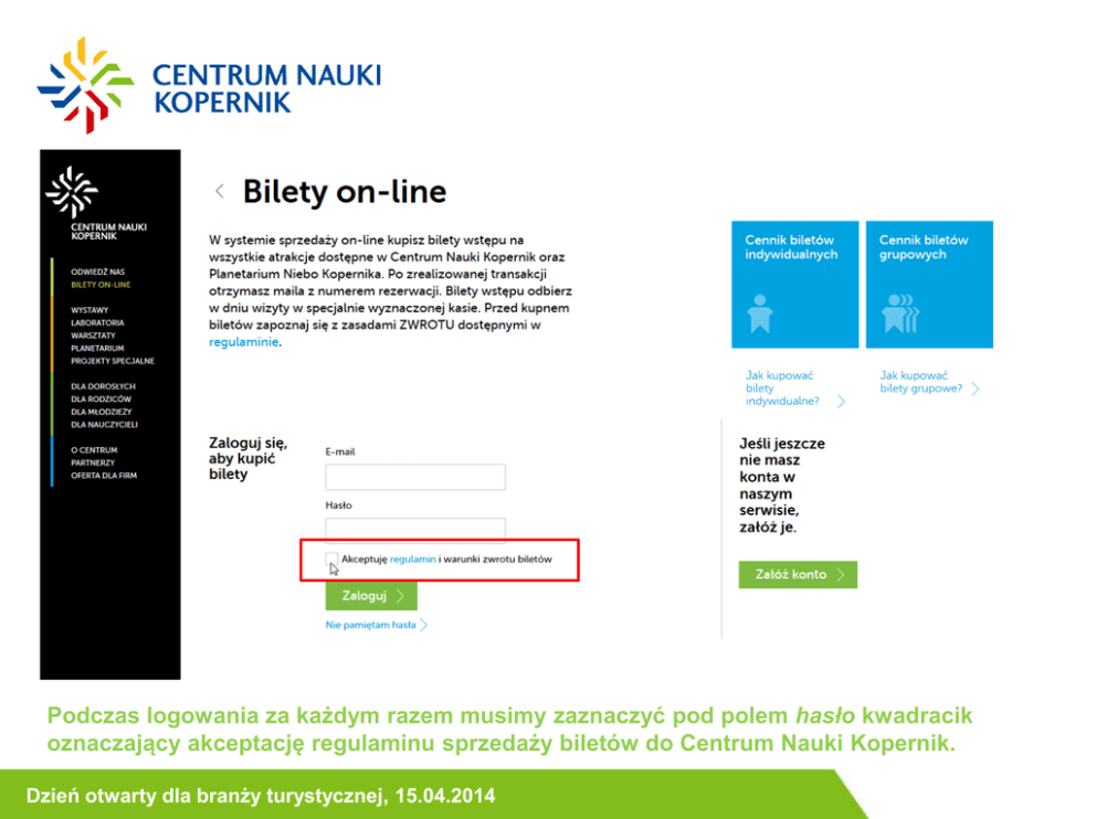 Podczas logowania za każdym razem musimy zaznaczyć pod polem hasło kwadracik oznaczający akceptację regulaminu sprzedaży biletów do Centrum Nauki Kopernik. Dzień otwarty dla branży turystycznej, 15.04.2014 Po kliknięciu w pole z liczbą biletów możemy zmienić jego wartość za pomocą znaków + i –. Możemy też wpisać liczbę na klawiaturze. Dzień otwarty dla branży turystycznej, 15.04.2014 tytuł tekst Po wybraniu liczby biletów, aby zatwierdzić wybór klikamy w przycisk OK. Dzień otwarty dla branży turystycznej, 15.04.2014 tytuł tekst Na kolejnym ekranie podsumowania możemy zmienić liczbę biletów lub przejść do wyboru terminu naszej wizyty. Dzień otwarty dla branży turystycznej, 15.04.2014 tytuł tekst Na kolejnym ekranie wybieramy termin wizyty, a następnie zatwierdzamy to za pomocą przycisku Wybieram ten termin. Dni zaznaczone na szaro są nieaktywne. W tych dniach nie ma biletów do sprzedaży. Dzień otwarty dla branży turystycznej, 15.04.2014 tytuł tekst Po wybraniu dnia wizyty pozostaje nam wybranie godziny rozpoczęcia wizyty w Centrum Nauki Kopernik. Dzień otwarty dla branży turystycznej, 15.04.2014 tytuł tekst Na ostatnim ekranie podsumowania nie mamy już możliwości edycji zamówienia. Aby przejść do płatności trzeba kliknąć przycisk Dane i płatność. Dzień otwarty dla branży turystycznej, 15.04.2014 Na ekranie podsumowania płatności możemy poprosić o wystawienie e-faktury (zostanie wysłana na adres e-mail podany przy rejestracji). Aby dokonać płatności musimy kliknąć w przycisk Płatności PayU. …………………….. …………………….. Dzień otwarty dla branży turystycznej, 15.04.2014 tytuł tekst Po wybraniu metody płatności, należy potwierdzić to kliknięciem w przycisk Przejdź do płatności. Dzień otwarty dla branży turystycznej, 15.04.2014 Do przejścia na stronę internetową wybranej metody płatności wymagana jest akceptacja regulaminu płatności PayU. Dzień otwarty dla branży turystycznej, 15.04.2014 Po akceptacji regulaminu PayU jesteśmy przekierowani do strony internetowej wybranej przez nas metody płatności. Wszystkie dane do przelewu są uzupełnianie automatycznie. Musimy jedynie zaakceptować płatność. Dzień otwarty dla branży turystycznej, 15.04.2014 tytuł …………………….. tekst Po zleceniu płatności system PayU wysyła do nas (na adres e-mail podany w trakcie rejestracji) e-mail z podsumowaniem transakcji. Jest to tylko potwierdzenie zlecenia a nie dowód wpłaty. Dzień otwarty dla branży turystycznej, 15.04.2014