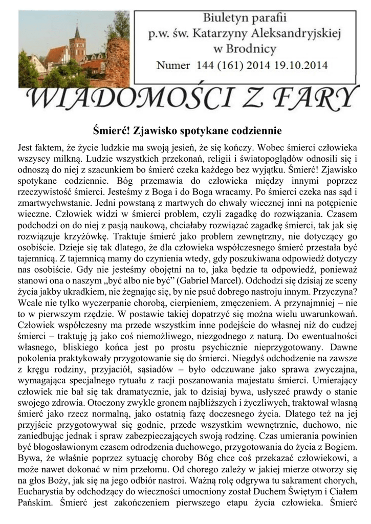 Śmierć! Zjawisko spotykane codziennie Jest faktem, że życie ludzkie ma swoją jesień, że się kończy. Wobec śmierci człowieka wszyscy milkną. Ludzie wszystkich przekonań, religii i światopoglądów odnosili się i odnoszą do niej z szacunkiem bo śmierć czeka każdego bez wyjątku. Śmierć! Zjawisko spotykane codziennie. Bóg przemawia do człowieka między innymi poprzez rzeczywistość śmierci. Jesteśmy z Boga i do Boga wracamy. Po śmierci czeka nas sąd i zmartwychwstanie. Jedni powstaną z martwych do chwały wiecznej inni na potępienie wieczne. Człowiek widzi w śmierci problem, czyli zagadkę do rozwiązania. Czasem podchodzi on do niej z pasją naukową, chciałaby rozwiązać zagadkę śmierci, tak jak się rozwiązuje krzyżówkę. Traktuje śmierć jako problem zewnętrzny, nie dotyczący go osobiście. Dzieje się tak dlatego, że dla człowieka współczesnego śmierć przestała być tajemnicą. Z tajemnicą mamy do czynienia wtedy, gdy poszukiwana odpowiedź dotyczy nas osobiście. Gdy nie jesteśmy obojętni na to, jaka będzie ta odpowiedź, ponieważ stanowi ona o naszym „być albo nie być” (Gabriel Marcel). Odchodzi się dzisiaj ze sceny życia jakby ukradkiem, nie żegnając się, by nie psuć dobrego nastroju innym. Przyczyna? Wcale nie tylko wyczerpanie chorobą, cierpieniem, zmęczeniem. A przynajmniej – nie to w pierwszym rzędzie. W postawie takiej dopatrzyć się można wielu uwarunkowań. Człowiek współczesny ma przede wszystkim inne podejście do własnej niż do cudzej śmierci – traktuję ją jako coś niemożliwego, niezgodnego z naturą. Do ewentualności własnego, bliskiego końca jest po prostu psychicznie nieprzygotowany. Dawne pokolenia praktykowały przygotowanie się do śmierci. Niegdyś odchodzenie na zawsze z kręgu rodziny, przyjaciół, sąsiadów – było odczuwane jako sprawa zwyczajna, wymagająca specjalnego rytuału z racji poszanowania majestatu śmierci. Umierający człowiek nie bał się tak dramatycznie, jak to dzisiaj bywa, usłyszeć prawdy o stanie swojego zdrowia. Otoczony zwykle gronem najbliższych i życzliwych, traktował własną śmierć jako rzecz normalną, jako ostatnią fazę doczesnego życia. Dlatego też na jej przyjście przygotowywał się godnie, przede wszystkim wewnętrznie, duchowo, nie zaniedbując jednak i spraw zabezpieczających swoją rodzinę. Czas umierania powinien być błogosławionym czasem odrodzenia duchowego, przygotowania do życia z Bogiem. Bywa, że właśnie poprzez sytuację choroby Bóg chce coś przekazać człowiekowi, a może nawet dokonać w nim przełomu. Od chorego zależy w jakiej mierze otworzy się na głos Boży, jak się na jego odbiór nastroi. Ważną rolę odgrywa tu sakrament chorych, Eucharystia by odchodzący do wieczności umocniony został Duchem Świętym i Ciałem Pańskim. Śmierć jest zakończeniem pierwszego etapu życia człowieka. Śmierć ostatecznie zatwierdza to, co było w ludzkim życiu, utrwala wszystkie życiowe wybory. Z chwilą śmierci kończy się możliwość moralnego zasługiwania. Dlatego tak wielką rolę odgrywa ziemskie życie ze swoimi możliwościami wyboru i decyzji. Nie ma wędrówki dusz, w której dusza zjawiałaby się parokrotnie w coraz to innych formach cielesnych. Każdy człowiek stanowi absolutne jednorazowe zjawisko w historii. Zjawia się w chwili poczęcia w łonie matki, a jego ostatnie pełne wykończenie dokona się wraz z całym wszechświatem przeistoczonym w Bogu w dniu ostatecznym. Pismo Święte mówi o umieraniu w Panu (Ap 14, 13). jednak umieranie to nie jest właściwą śmiercią. Jezus powiedział przecież: Każdy kto żyje i wierzy we Mnie, nie umrze na wieki (J 11, 26). Jest to więc umieranie z Chrystusem, przynoszące życie! „Zmarli w Chrystusie” to nie tylko ci, którzy z Chrystusem żyli, to również ci wszyscy, których śmierć dokonała się w Chrystusie. Chrystus sprawił, że śmierć stała się szansą. Dał człowiekowi ogromną możliwość współdziałania zarówno w życiu, jak i w śmierci. Jezus nadał nieprzemijający sens życiu i śmierci. Szansą śmierci stała się możliwość wewnętrznej na nią zgody. Świadome i chętne włączenie swojej śmierci w Chrystusową, wspólne, chętne ofiarowanie jej Ojcu: W ręce Twoje, Ojcze, powierzam ducha mojego. Śmierć jest koniecznością, jest faktem, z którym każdy rozsądny człowiek się liczy i w stosunku do którego winien zająć odpowiednie stanowisko. Śmierć jest tajemnicą, w której trzeba dostrzec głębszą, wewnętrzną treść i powiedzieć jej swoje „tak”. Trzeba zaufać Bogu Ojcu, który swemu dziecku nie zrobi krzywdy, trzeba powiedzieć mu: Bądź wola Twoja. Będzie to nasz gest ufności wobec Stwórcy, kiedy przekraczając ostatni próg ziemski, człowiek ujrzy Miłość najdoskonalszą, w domu Ojca, do którego wędrował przez całe życie. Jan Uryga OGŁOSZENIA PARAFIALNE XXIX Niedziela Zwykła 19. Października 2014 1. Dziś rozpoczyna się Światowy Tydzień Misyjny pod hasłem: „Z Ewangelią do narodów”. Pamiętajmy w naszych modlitwach o wszystkich misjonarzach: duchownych i świeckich, którzy głoszą Chrystusa „aż po krańce ziemi”. W przyszłą niedzielę kolekta przeznaczona zostanie na cele misyjne. 2. Czcicieli Miłosierdzia Bożego zapraszamy na godz. 17.00 do Kaplicy Krzyża Świętego na spotkanie modlitewne przed obrazem JEZU UFAM TOBIE. 3. W liturgii wspominać będziemy: w poniedziałek 20. października św. Jana Kantego, bpa - patrona uczelni katolickich, we wtorek 21. października bł. Jakuba Strzemię, bpa; w środę 22. października św. Jana Pawła II. Tego dnia uroczyście zostanie wniesiony i poświęcony obraz naszego Świętego Rodaka, który przez blisko 27 lat zasiadał na Tronie Piotrowym. Uczynimy to podczas Mszy św. wieczornej poprzedzonej nabożeństwem różańcowym i nowenną do MBNP. Obraz zostanie umieszczony na lewym filarze prezbi