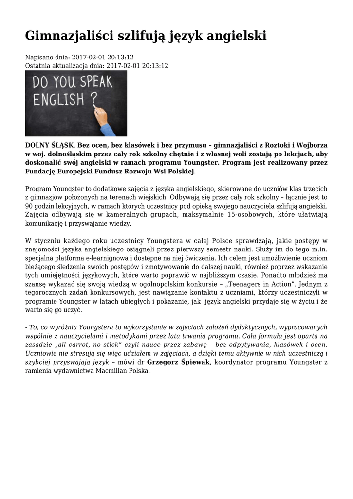 Gimnazjaliści szlifują język angielski Napisano dnia: 2017-02-01 20:13:12 Ostatnia aktualizacja dnia: 2017-02-01 20:13:12 DOLNY ŚLĄSK. Bez ocen, bez klasówek i bez przymusu – gimnazjaliści z Roztoki i Wojborza w woj. dolnośląskim przez cały rok szkolny chętnie i z własnej woli zostają po lekcjach, aby doskonalić swój angielski w ramach programu Youngster. Program jest realizowany przez Fundację Europejski Fundusz Rozwoju Wsi Polskiej. Program Youngster to dodatkowe zajęcia z języka angielskiego, skierowane do uczniów klas trzecich z gimnazjów położonych na terenach wiejskich. Odbywają się przez cały rok szkolny – łącznie jest to 90 godzin lekcyjnych, w ramach których uczestnicy pod opieką swojego nauczyciela szlifują angielski. Zajęcia odbywają się w kameralnych grupach, maksymalnie 15-osobowych, które ułatwiają komunikację i przyswajanie wiedzy. W styczniu każdego roku uczestnicy Youngstera w całej Polsce sprawdzają, jakie postępy w znajomości języka angielskiego osiągnęli przez pierwszy semestr nauki. Służy im do tego m.in. specjalna platforma e-learnignowa i dostępne na niej ćwiczenia. Ich celem jest umożliwienie uczniom bieżącego śledzenia swoich postępów i zmotywowanie do dalszej nauki, również poprzez wskazanie tych umiejętności językowych, które warto poprawić w najbliższym czasie. Ponadto młodzież ma szansę wykazać się swoją wiedzą w ogólnopolskim konkursie – „Teenagers in Action”. Jednym z tegorocznych zadań konkursowych, jest nawiązanie kontaktu z uczniami, którzy uczestniczyli w programie Youngster w latach ubiegłych i pokazanie, jak język angielski przydaje się w życiu i że warto się go uczyć. - To, co wyróżnia Youngstera to wykorzystanie w zajęciach założeń dydaktycznych, wypracowanych wspólnie z nauczycielami i metodykami przez lata trwania programu. Cała formuła jest oparta na zasadzie „all carrot, no stick” czyli nauce przez zabawę – bez odpytywania, klasówek i ocen. Uczniowie nie stresują się więc udziałem w zajęciach, a dzięki temu aktywnie w nich uczestniczą i szybciej przyswajają język – mówi dr Grzegorz Śpiewak, koordynator programu Youngster z ramienia wydawnictwa Macmillan Polska. Jakie są efekty programu? Młodzież znacząco poprawia swoje kompetencje językowe, co skutkuje wyższymi wynikami na egzaminie gimnazjalnym z języka angielskiego. Uzyskane dobre rezultaty wpływają z kolei na wzrost poczucia własnej wartości i pewności siebie, rzutując niejednokrotnie na ich decyzje dotyczące dalszej edukacji oraz w dłuższej perspektywie zmiany ich postaw życiowych. - Głównym założeniem programu Youngster jest umożliwienie uczniom z obszarów wiejskich rozwoju umiejętności językowych, które wpływają na osiągane przez nich wyniki w kolejnych etapach edukacji. Dzięki temu zyskują szersze perspektywy podczas wyboru ścieżki kariery zawodowej i pewniejszym krokiem wkraczają w dorosłe życie. Takie efekty obserwujemy już wśród uczestników poprzednich edycji programu, którzy język angielski z powodzeniem wykorzystuj, np. podczas studiów na zagranicznych uczelniach – mówi Krzysztof Podhajski, prezes zarządu Fundacji Europejski Fundusz Rozwoju Wsi Polskiej. W tym roku szkolnym realizowana jest X edycja Programu Youngster. Do tej pory skorzystało z niego ponad 28 tysięcy uczniów z ponad 360 gimnazjów wiejskich z całej Polski. Beneficjentami programu było także prawie 400 nauczycieli objętych kompleksowym wsparciem merytorycznym, w tym m.in. szkoleniami metodycznymi. Gmina Dobromierz Kłodzko Nazwa szkoły Gimnazjum Gminne w Zespole Szkół im. H. Sienkiewicza w Roztoce Gimnazjum Publiczne w Zespole Szkół w Wojborzu Miejscowość gimnazjum Roztoka Wojbórz *** YOUNGSTER to ogólnopolski program wyrównywania szans edukacyjnych młodzieży wiejskiej poprzez dodatkowe zajęcia z języka angielskiego. Zajęcia uczniów trzecich klas gimnazjum prowadzone są w oparciu o nowatorską koncepcję nauczania opracowaną przez wydawnictwo Macmillan. Fundacja Europejski Fundusz Rozwoju Wsi Polskiej jest organizacją pozarządową, działającą na rzecz rozwoju polskiej wsi. Od ponad 25 lat pomaga zmieniać jej wizerunek oraz aktywnie wspiera rozwój społeczno-gospodarczy lokalnych społeczności na terenach wiejskich. Działania EFRWP skupiają się przede wszystkim na wsparciu inwestycji z zakresu infrastruktury technicznej, rozwoju lokalnych przedsiębiorstw oraz działaniach edukacyjnych i społecznych skierowanych do osób zamieszkujących obszary wiejskie. MACMILLAN POLSKA jest częścią jednej z największych grup wydawniczych na świecie. GRUPA MACMILLAN jest obecna na światowym rynku wydawniczym od ponad 150 lat. (abc)