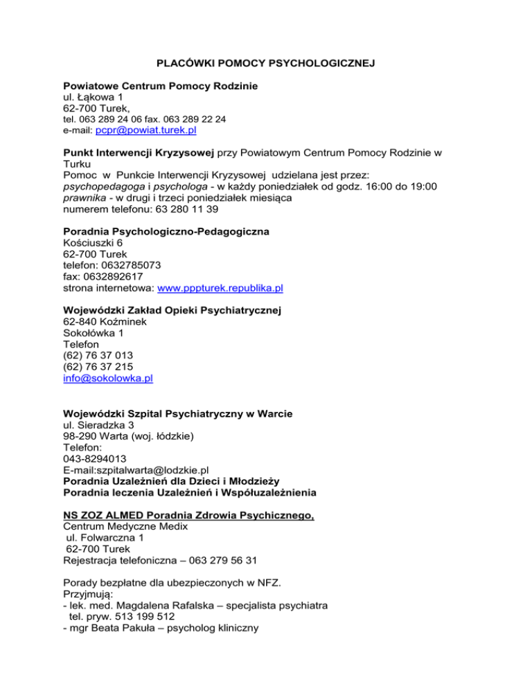 PLACÓWKI POMOCY PSYCHOLOGICZNEJ Powiatowe Centrum Pomocy Rodzinie ul. Łąkowa 1 62-700 Turek, tel. 063 289 24 06 fax. 063 289 22 24 e-mail: [email protected] Punkt Interwencji Kryzysowej przy Powiatowym Centrum Pomocy Rodzinie w Turku Pomoc w Punkcie Interwencji Kryzysowej udzielana jest przez: psychopedagoga i psychologa - w każdy poniedziałek od godz. 16:00 do 19:00 prawnika - w drugi i trzeci poniedziałek miesiąca numerem telefonu: 63 280 11 39 Poradnia Psychologiczno-Pedagogiczna Kościuszki 6 62-700 Turek telefon: 0632785073 fax: 0632892617 strona internetowa: www.pppturek.republika.pl Wojewódzki Zakład Opieki Psychiatrycznej 62-840 Koźminek Sokołówka 1 Telefon (62) 76 37 013 (62) 76 37 215 [email protected] Wojewódzki Szpital Psychiatryczny w Warcie ul. Sieradzka 3 98-290 Warta (woj. łódzkie) Telefon: 043-8294013 E-mail:[email protected] Poradnia Uzależnień dla Dzieci i Młodzieży Poradnia leczenia Uzależnień i Współuzależnienia NS ZOZ ALMED Poradnia Zdrowia Psychicznego, Centrum Medyczne Medix ul. Folwarczna 1 62-700 Turek Rejestracja telefoniczna – 063 279 56 31 Porady bezpłatne dla ubezpieczonych w NFZ. Przyjmują: - lek. med. Magdalena Rafalska – specjalista psychiatra tel. pryw. 513 199 512 - mgr Beata Pakuła – psycholog kliniczny Centrum Zdrowia Psychicznego w Turku ul. Poduchowne 1, 62-700 Turek tel. (0-63) 280-20-10 Godz. pracy: poniedziałek - czwartek 8.00-13.00, 15.00-20.00 Wizyty prywatne piątek, sobota 9.00-13.00 www.psychiatria.turek.net.pl Terminy i godziny przyjęć uzgadnia się telefonicznie! Poradnia Leczenia Uzależnień w Kaliszu ul. Lipowa 5, 62-800 Kalisz tel. (0-62) 767-20-57 Godz. pracy: Terapeuci poniedziałek - piątek 8.00-19.00 Rejestracja poniedziałek - piątek 8.00-15.30, czwartek 12.00-16.00 Zakład Opieki Zdrowotnej MULTIMED s.c. ul. Wojska Polskiego 33 (na wprost giełdy/stadionu) 62-500 Konin Fax. 063-244-43-95 Rejestracja: Tel. 063-244-43-95 Rejestracja do Poradni Leczenia Uzależnień: Tel. 063-243-67-67 Osobista lub telefoniczna. godz. pracy: poniedziałek – piątek od 7.00 do 20.00 www.multimed.konin.pl Przychodnia Leczenia Uzależnień i Współuzależnień w Kole ul. PCK 8, 62-600 Koło tel. (0-63) 261-07-07 Godz. pracy: poniedziałek - piątek 8.00-20.00 Ośrodek Wsparcia dla Osób z Problemami Uzależnień Adres: Konińska 4, 62-700 Turek Telefon:63 289 19 87 Polskie Towarzystwo Zapobiegania Narkomanii w Turku ul Konińska 4, 62-700 Turek (63) 289 19 87 / [email protected] PRYZMAT Centrum Leczenia Uzależnień ul. Dąbrowskiego 7 62-700 Turek (w siedzibie poradni "MEDICUS") tel. (63) 289 84 75 668 467 484 501 628 226 [email protected]