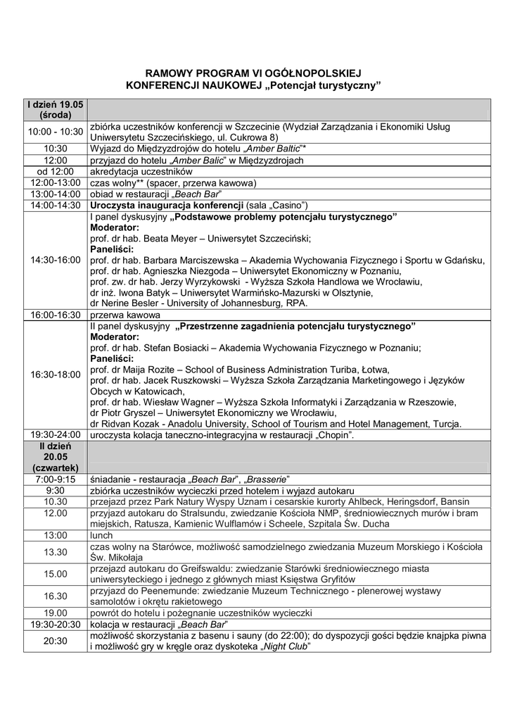 RAMOWY PROGRAM VI OGÓ NOPOLSKIEJ KONFERENCJI NAUKOWEJ „Potencja turystyczny” I dzie 19.05 roda) 10:00 - 10:30 10:30 12:00 od 12:00 12:00-13:00 13:00-14:00 14:00-14:30 14:30-16:00 16:00-16:30 16:30-18:00 19:30-24:00 II dzie 20.05 (czwartek) 7:00-9:15 9:30 10.30 12.00 13:00 13.30 15.00 16.30 19.00 19:30-20:30 20:30 zbiórka uczestników konferencji w Szczecinie (Wydzia Zarz dzania i Ekonomiki Us ug Uniwersytetu Szczeci skiego, ul. Cukrowa 8) Wyjazd do Mi dzyzdrojów do hotelu „Amber Baltic”* przyjazd do hotelu „Amber Balic” w Mi dzyzdrojach akredytacja uczestników czas wolny** (spacer, przerwa kawowa) obiad w restauracji „Beach Bar” Uroczysta inauguracja konferencji (sala „Casino”) I panel dyskusyjny „Podstawowe problemy potencja u turystycznego” Moderator: prof. dr hab. Beata Meyer – Uniwersytet Szczeci ski; Paneli ci: prof. dr hab. Barbara Marciszewska – Akademia Wychowania Fizycznego i Sportu w Gda sku, prof. dr hab. Agnieszka Niezgoda – Uniwersytet Ekonomiczny w Poznaniu, prof. zw. dr hab. Jerzy Wyrzykowski - Wy sza Szko a Handlowa we Wroc awiu, dr in . Iwona Batyk – Uniwersytet Warmi sko-Mazurski w Olsztynie, dr Nerine Besler - University of Johannesburg, RPA. przerwa kawowa II panel dyskusyjny „Przestrzenne zagadnienia potencja u turystycznego” Moderator: prof. dr hab. Stefan Bosiacki – Akademia Wychowania Fizycznego w Poznaniu; Paneli ci: prof. dr Maija Rozite – School of Business Administration Turiba, otwa, prof. dr hab. Jacek Ruszkowski – Wy sza Szko a Zarz dzania Marketingowego i J zyków Obcych w Katowicach, prof. dr hab. Wies aw Wagner – Wy sza Szko a Informatyki i Zarz dzania w Rzeszowie, dr Piotr Gryszel – Uniwersytet Ekonomiczny we Wroc awiu, dr Ridvan Kozak - Anadolu University, School of Tourism and Hotel Management, Turcja. uroczysta kolacja taneczno-integracyjna w restauracji „Chopin”. niadanie - restauracja „Beach Bar”, „Brasserie” zbiórka uczestników wycieczki przed hotelem i wyjazd autokaru przejazd przez Park Natury Wyspy Uznam i cesarskie kurorty Ahlbeck, Heringsdorf, Bansin przyjazd autokaru do Stralsundu, zwiedzanie Ko cio a NMP, redniowiecznych murów i bram miejskich, Ratusza, Kamienic Wulflamów i Scheele, Szpitala w. Ducha lunch czas wolny na Starówce, mo liwo samodzielnego zwiedzania Muzeum Morskiego i Ko cio a w. Miko aja przejazd autokaru do Greifswaldu: zwiedzanie Starówki redniowiecznego miasta uniwersyteckiego i jednego z g ównych miast Ksi stwa Gryfitów przyjazd do Peenemunde: zwiedzanie Muzeum Technicznego - plenerowej wystawy samolotów i okr tu rakietowego powrót do hotelu i po egnanie uczestników wycieczki kolacja w restauracji „Beach Bar” mo liwo skorzystania z basenu i sauny (do 22:00); do dyspozycji go ci b dzie knajpka piwna i mo liwo gry w kr gle oraz dyskoteka „Night Club” III dzie 21.05 (pi tek) 8:00-9:00 9:00-10:30 10:30-11:00 11:00-12:30 12:30-13:00 13:00-14:00 niadanie - restauracja „Beach Bar”, „Brasserie” III panel dyskusyjny „Rola podmiotów gospodarczych w tworzeniu potencja u turystycznego” Moderator: prof. dr hab. Andrzej Rapacz – Uniwersytet Ekonomiczny we Wroc awiu; Paneli ci: prof. dr hab. Jan Sikora – Uniwersytet Ekonomiczny w Poznaniu, dr Kreshnik Bello – Univeristy of Vlore, Albania, dr Jerzy Gospodarek – Szko a G ówna Handlowa w Warszawie, dr Andrzej Hadzik – Akademia Wychowania Fizycznego w Katowicach. dr Ireneusz Marganiec – Prezes Amadeus Polska mgr Karolina Muszy ska – Uniwersytet Szczeci ski przerwa kawowa (do godziny 12:00 wymeldowanie go ci z pokoi**) IV panel dyskusyjny „Regionalne zagadnienia potencja u turystycznego” Moderator: prof. dr hab. Aleksander Panasiuk – Uniwersytet Szczeci ski; Paneli ci: prof. dr hab. Edyta Jakubowicz – Akademia Wychowania Fizycznego we Wroc awiu, prof. dr hab. Bogus aw Sawicki – Uniwersytet Przyrodniczy w Lublinie, prof. dr hab. Wojciech Wiesner – Akademia Wychowania Fizycznego we Wroc awiu, dr Adam Pawlicz – Uniwersytet Szczeci ski, dr Marzena Wanagos – Akademia Morska w Gdyni, dr Micha em a – Górno ska Wy sza Szko a Handlowa w Katowicach, mgr Andris Klepers – School of Business Administration Turiba, otwa. podsumowanie konferencji obiad i wyjazd uczestników autobusem do Szczecina pod Wydzia Zarz dzania i Ekonomiki Us ug (przez Dworzec G ówny w Szczecinie, oko o godz. 16.00) Organizatorzy zastrzegaj sobie prawo do zmiany harmonogramu imprezy. Informacje organizacyjne W pierwszy dzie konferencji pokoje hotelowe b do dyspozycji uczestników od godziny 15:00. W trzeci dzie konferencji pokoje hotelowe nale y zwolni do godziny 12:00. * dla osób jad cych w asnymi samochodami bezpo rednio do Mi dzyzdrojów hotel oferuje p atny parking w cenie 29 z za dob (hotel prosi o wcze niejsz rezerwacj miejsca – kontakt: Joanna Wi niewska, tel. +48 91 322 8755, [email protected]). * * istnieje mo liwo pozostawienia baga u pod opiek organizatorów.