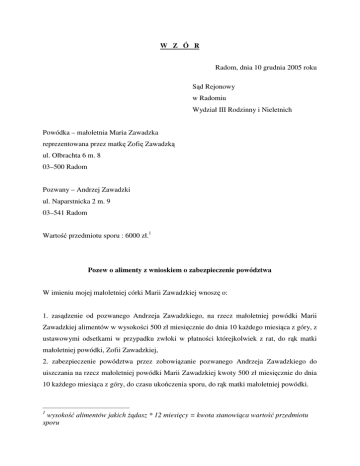 W Z Ó R Radom, dnia 10 grudnia 2005 roku Sąd Rejonowy w Radomiu Wydział III Rodzinny i Nieletnich Powódka – małoletnia Maria Zawadzka reprezentowana przez matkę Zofię Zawadzką ul. Olbrachta 6 m. 8 03–500 Radom Pozwany – Andrzej Zawadzki ul. Naparstnicka 2 m. 9 03–541 Radom Wartość przedmiotu sporu : 6000 zł.1 Pozew o alimenty z wnioskiem o zabezpieczenie powództwa W imieniu mojej małoletniej córki Marii Zawadzkiej wnoszę o: 1. zasądzenie od pozwanego Andrzeja Zawadzkiego, na rzecz małoletniej powódki Marii Zawadzkiej alimentów w wysokości 500 zł miesięcznie do dnia 10 każdego miesiąca z góry, z ustawowymi odsetkami w przypadku zwłoki w płatności którejkolwiek z rat, do rąk matki małoletniej powódki, Zofii Zawadzkiej, 2. zabezpieczenie powództwa przez zobowiązanie pozwanego Andrzeja Zawadzkiego do uiszczania na rzecz małoletniej powódki Marii Zawadzkiej kwoty 500 zł miesięcznie do dnia 10 każdego miesiąca z góry, do czasu ukończenia sporu, do rąk matki małoletniej powódki. 1 wysokość alimentów jakich żądasz * 12 miesięcy = kwota stanowiąca wartość przedmiotu sporu Uzasadnienie Małoletnia powódka Maria Zawadzka urodziła się dnia 3 marca 2002 roku w Radomiu. Jest córką pozwanego i reprezentującej powódkę, Zofii Zawadzkiej. Pozwany i matka powódki pozostają w związku małżeńskim od dnia 12 czerwca 2000 roku do chwili obecnej. Dowód: skrócony odpis aktu małżeństwa; skrócony odpis aktu urodzenia Marii Zawadzkiej. W lipcu tego roku pozwany wyprowadził się z domu i zamieszkał z inną kobietą. Od tego czasu nie łoży na utrzymanie dziecka. Dowód: list Andrzeja Zawadzkiego do Zofii Zawadzkiej. Małoletnia powódka jest obecnie tylko na moim utrzymaniu. W sierpniu b.r. zostałam zwolniona z pracy i do dziś nie znalazłam nowej. W tej chwili utrzymuję nas z pieniędzy pożyczonych od moich rodziców. Dowód: zaświadczenie z Urzędu Pracy. Pozwany jest mechanikiem samochodowym, jego miesięczny dochód wynosi około 1800 zł brutto miesięcznie. Pieniądze potrzebne na zaspokojenie usprawiedliwionych potrzeb powódki wynoszą około 800 zł. miesięcznie. Opłata za przedszkole dziecka wynosi miesięcznie 300 zł. Około 600 zł miesięcznie wydaję na jej codzienne potrzeby (opisać wydatki na dziecko). Małoletnia Maria Zawadzka jest pod stałą opieką lekarza, gdyż od urodzenia choruje na astmę. Miesięczny koszt zakupu leków wynosi 150 zł. Dowód: zaświadczenie lekarza o stanie zdrowia powódki; rachunki za leki; potwierdzenie opłaty za przedszkole; inne rachunki (wymienić rachunki potwierdzające wydatki na dziecko). Wobec powyższego żądanie wyrażone w pozwie, jak i wniosek o zabezpieczenie powództwa, są w pełni uzasadnione. Zofia Zawadzka Załączniki : 1. skrócony odpis aktu urodzenia dziecka 2. odpis skrócony aktu zawarcia małżeństwa 3. list powoda do powódki 4. zaświadczenie lekarza o stanie zdrowia małoletniej powódki 5. rachunki za leki Marii Zawadzkiej 6. potwierdzenie opłat za przedszkole 7. inne rachunki dotyczące utrzymania dziecka (wpisać jakie) 8. zaświadczenie z urzędu pracy 9. odpis pozwu 10. kserokopie załączników.