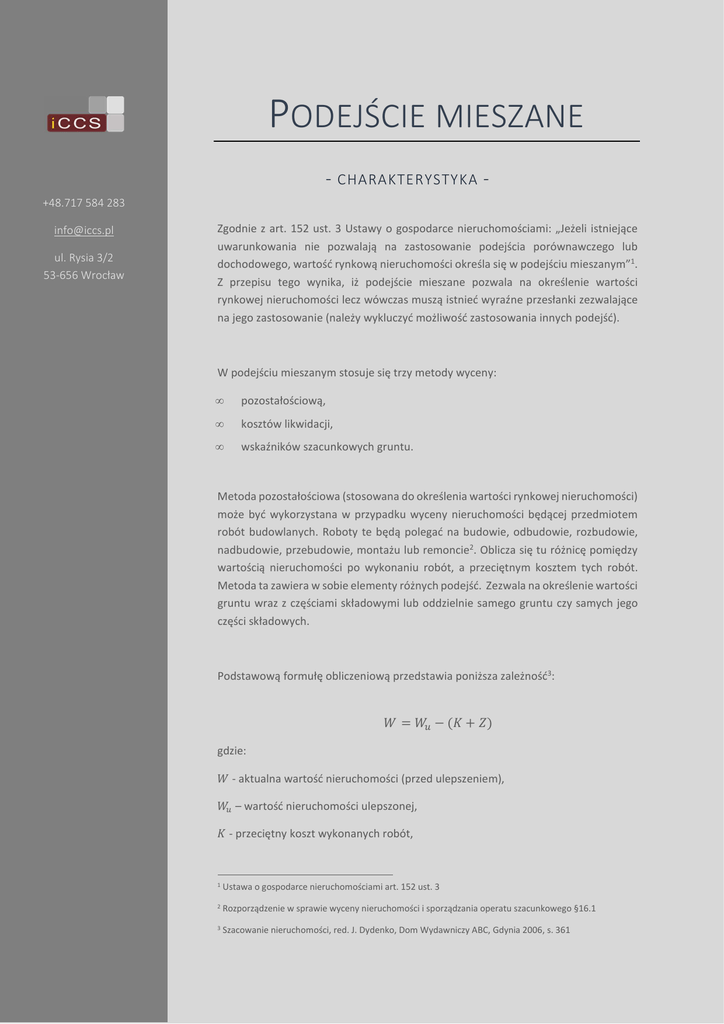 PODEJŚCIE MIESZANE - CHARAKTERYSTYKA +48.717 584 283 [email protected] ul. Rysia 3/2 53-656 Wrocław Zgodnie z art. 152 ust. 3 Ustawy o gospodarce nieruchomościami: „Jeżeli istniejące uwarunkowania nie pozwalają na zastosowanie podejścia porównawczego lub dochodowego, wartość rynkową nieruchomości określa się w podejściu mieszanym”1. Z przepisu tego wynika, iż podejście mieszane pozwala na określenie wartości rynkowej nieruchomości lecz wówczas muszą istnieć wyraźne przesłanki zezwalające na jego zastosowanie (należy wykluczyć możliwość zastosowania innych podejść). W podejściu mieszanym stosuje się trzy metody wyceny: • pozostałościową, • kosztów likwidacji, • wskaźników szacunkowych gruntu. Metoda pozostałościowa (stosowana do określenia wartości rynkowej nieruchomości) może być wykorzystana w przypadku wyceny nieruchomości będącej przedmiotem robót budowlanych. Roboty te będą polegać na budowie, odbudowie, rozbudowie, nadbudowie, przebudowie, montażu lub remoncie2. Oblicza się tu różnicę pomiędzy wartością nieruchomości po wykonaniu robót, a przeciętnym kosztem tych robót. Metoda ta zawiera w sobie elementy różnych podejść. Zezwala na określenie wartości gruntu wraz z częściami składowymi lub oddzielnie samego gruntu czy samych jego części składowych. Podstawową formułę obliczeniową przedstawia poniższa zależność3: gdzie: - aktualna wartość nieruchomości (przed ulepszeniem), – wartość nieruchomości ulepszonej, - przeciętny koszt wykonanych robót, 1 Ustawa o gospodarce nieruchomościami art. 152 ust. 3 2 Rozporządzenie w sprawie wyceny nieruchomości i sporządzania operatu szacunkowego §16.1 3 Szacowanie nieruchomości, red. J. Dydenko, Dom Wydawniczy ABC, Gdynia 2006, s. 361 - zysk inwestora. Zysk inwestora jest zyskiem możliwym do uzyskania z danej nieruchomości na rynku nieruchomości podobnych. Jak wynika z przedstawionej formuły, może okazać się, iż wartość nieruchomości będzie liczbą ujemną. Taka sytuacja jest prawnie dozwolona, co prezentuje Rozporządzenie w sprawie wyceny nieruchomości i sporządzania operatu szacunkowego. W art. 24 tego dokumentu czytamy, iż „W przypadku konieczności poniesienia nakładów na przywrócenie nieruchomości do stanu umożliwiającego korzystanie zgodne z jej przeznaczeniem, przekraczających wartość, jaką nieruchomość miałaby, gdyby te nakłady nie były konieczne, wartość tej nieruchomości może być wyrażona liczbą ujemną” 4 . W dalszej części cytowanego artykułu zwraca się jednakże uwagę na fakt, iż ujemna wartość nieruchomości musi być zawsze bardzo szczegółowo uzasadniona w operacie szacunkowym. Metoda kosztów likwidacji stosowana jest w przypadku, gdy części składowe gruntu są przeznaczone do rozbiórki5. Wartość nieruchomości stanowi tu różnica pomiędzy kosztami nabycia gruntu (wartość gruntu) a kosztami likwidacji jego części składowych. Materiały pozostałe po rozbiórce, a posiadające jakąś wartość mogą dodatkowo zwiększyć wynik wyceny. Wykorzystywana tu zależność przedstawia się więc następująco6: gdzie: - wartość nieruchomości, - koszt nabycia gruntu, - koszt likwidacji (rozbiórki) części składowych gruntu, - wartość materiałów z odzysku. Dodatkowo7: 1 4 Rozporządzenie w sprawie wyceny nieruchomości i sporządzania operatu szacunkowego §24 5 Szacowanie nieruchomości, red. J. Dydenko, Dom Wydawniczy ABC, Gdynia 2006, s. 297 6 Szacowanie nieruchomości, red. J. Dydenko, Dom Wydawniczy ABC, Gdynia 2006, s. 363 7 Szacowanie nieruchomości, red. J. Dydenko, Dom Wydawniczy ABC, Gdynia 2006, s. 363 gdzie: - wartość odzyskanego materiału z prac porozbiórkowych , przyjęta jak dla materiałów w stanie nowym, oraz ∗ ∗ - stopień zużycia -tego materiału, - ilość materiału -tego w stanie nowym, - cena jednostkowa -tego materiału w stanie nowym, - wskaźnik odzysku -tego materiału. Do kosztów likwidacji części składowych gruntu zalicza się nie tylko koszty samej rozbiórki ale również koszty pośrednie z tą rozbiórką związane, jak na przykład uprzątnięcia terenu czy transportu materiałów pozostałych po rozbiórce. Wartość ich można ustalić przy wykorzystaniu jednej z technik podejścia kosztowego a więc: szczegółowej, elementów scalonych lub wskaźnikowej. Metoda wskaźników szacunkowych gruntu jest wykorzystywana przy wycenie nieruchomości przeznaczonych na cele rolne lub leśne. W przypadku takich obiektów często trudno znaleźć na rynku transakcje nieruchomościami podobnymi. Stąd metodę tą można stosować gdy brakuje odpowiedniej bazy transakcji rynkowych. Zgodnie z §18.2 rozporządzenia w sprawie wyceny nieruchomości i sporządzania operatu szacunkowego „wartość gruntu określa się jako iloczyn wskaźnika szacunkowego 1 ha gruntu i ceny 1 decytony ziarna żyta albo ceny 1 m3 drewna”8. Podstawowa formuła przy wykorzystaniu metody wskaźników szacunkowych gruntu dla wyceny nieruchomości przeznaczonej na cele rolne przedstawia się następująco9: ∗ ! ∗ ż ∗ # gdzie: - powierzchnia użytków rolnych, ! 8 9 - wskaźnik szacunkowy gruntu, Rozporządzenie w sprawie wyceny nieruchomości i sporządzania operatu szacunkowego §18.2 R. Cymerman, A. Hopfer, System, zasady i procedury wyceny nieruchomości, Polska Federacja Stowarzyszeń Rzeczoznawców Majątkowych, Warszawa 2008, s. 24 ż - cena 1 decytony żyta, # - współczynniki korygujące. Cena ziarna żyta pochodzi z rynku lokalnego. Cena drewna dodatkowo powinna uwzględniać koszty jego pozyskania i transportu. Ta wartość również może pochodzić z rynku lokalnego lub (częściej) z nadleśnictwa właściwego dla miejsca położenia nieruchomości czy nadleśnictw sąsiednich. Dla określenia klasy gruntu wykorzystuje się dane pochodzące z katastru nieruchomości. Typy siedliskowe lasów są zdefiniowane w planie urządzen