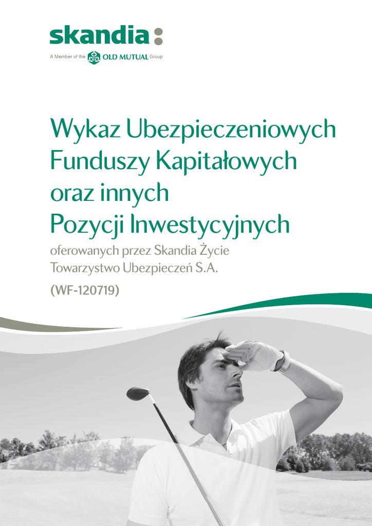 Wykaz Ubezpieczeniowych Funduszy Kapitałowych oraz innych Pozycji Inwestycyjnych oferowanych przez Skandia Życie Towarzystwo Ubezpieczeń S.A. (WF-120719) Fundusze akcyjne Fundusze aktywnej alokacji/absolutnej stopy zwrotu Fundusze d∏u˝ne Ubezpieczeniowy Fundusz Kapita∏owy: Skandia Allianz subfundusz Allianz Akcji Skandia Allianz subfundusz Allianz Akcji Małych i Ârednich Spółek Skandia Arka BZ WBK Subfundusz Arka BZ WBK Akcji Skandia Arka BZ WBK Subfundusz Arka BZ WBK Akcji Ârodkowej i Wschodniej Europy Skandia Aviva Investors Subfundusz Aviva Investors Małych Spółek Skandia Aviva Investors Subfundusz Aviva Investors Polskich Akcji Skandia Investor Akcji Du˝ych Spółek Skandia ING Parasol ING Subfundusz Akcji Skandia ING Parasol ING Subfundusz Rosja EUR Skandia Legg Mason Akcji Skandia Noble Funds subfundusz Noble Fund Africa Skandia Noble Funds subfundusz Noble Fund Akcji Skandia Noble Funds subfundusz Noble Fund Akcji Małych i Ârednich Spółek Skandia Quercus Parasolowy Subfundusz Quercus Agresywny Skandia Quercus Parasolowy Subfundusz Quercus lev Skandia Quercus Parasolowy Subfundusz Quercus short Skandia Novo Subfundusz Novo Akcji Skandia Skarbiec Subfundusz Akcji Skarbiec-Akcja Skandia UniFundusze subfundusz UniAkcje Małych i Ârednich Spółek Skandia UniFundusze subfundusz UniKorona Akcje Skandia BGF Global Opportunities Fund Skandia BGF US Basic Value Fund Skandia BGF Japan Small & MidCap Opportunities Fund Skandia BGF World Gold Fund Skandia BGF World Mining Fund Skandia BGF Latin American Fund Skandia Pacific Equity Fund Skandia US All Cap Value Fund Skandia Templeton Emerging Markets Fund Skandia Templeton Asian Growth Fund Skandia Templeton BRIC Fund Skandia Templeton Frontier Markets Fund Skandia Schroder ISF Emerging Markets Skandia Schroder ISF Japanese Equity Skandia HSBC GIF Chinese Equity Skandia HSBC GIF Global Emerging Markets Equity Skandia HSBC GIF Indian Equity Skandia HSBC GIF Euroland Equity Smaller Companies Skandia JPMorgan Funds – Europe Equity Fund Skandia JPMorgan Funds – Europe Dynamic Fund Skandia Julius Baer Multistock – Europe Small & Mid Cap Stock Fund Skandia BGF Emerging Europe Fund Skandia Schroder ISF Global Property Securities Skandia European Best Ideas Fund Skandia Templeton Growth (Euro) Fund Waluta: PLN PLN PLN PLN PLN PLN PLN PLN PLN PLN PLN PLN PLN PLN PLN PLN PLN PLN PLN PLN USD USD USD USD USD USD USD USD USD USD USD USD USD USD USD USD USD EUR EUR EUR EUR EUR EUR EUR EUR Kod ALL3 ALL1 ARKA3 ARKA1 CU1 CU3 DWS3 ING3 ING5 KAHA2 NB6 NB3 NB4 QUE1 QUE2 QUE3 SEB3 SKAR3 UNK6 UNK3 ML1 ML2 ML4 ML5 ML6 ML7 SKAN4 SKAN5 TEMP1 TEMP3 TEMP4 TEMP7 SCH3 SCH4 HSBC1 HSBC3 HSBC4 HSBC2 JPM1 JPM2 JB2 ML3 SCH2 SKAN7 TEMP2 Ubezpieczeniowy Fundusz Kapita∏owy: Skandia BPH Total Profit Skandia ING Parasol ING Subfundusz Selektywny Skandia Novo Subfundusz Novo Aktywnej Alokacji Skandia UniFundusze Subfundusz UniTotal Trend Waluta PLN PLN PLN PLN Kod BPH7 ING6 NOVO4 UNK7 Ubezpieczeniowy Fundusz Kapita∏owy: Skandia Arka BZ WBK Subfundusz Arka BZ WBK Obligacji Skandia BPH Subfundusz Obligacji 2 Skandia Aviva Investors Subfundusz Aviva Investors Obligacji Skandia ING Parasol ING Subfundusz Gotówkowy Skandia Legg Mason Pieni´˝ny Skandia Noble Funds subfundusz Noble Fund Skarbowy Skandia Novo Subfundusz Novo Obligacji Przedsi´biorstw Skandia Pioneer Subfundusz Pioneer Obligacji Plus Skandia Pioneer Subfundusz Pioneer Pieni´˝ny Skandia Skarbiec Subfundusz Pieni´˝ny Skarbiec-Kasa Skandia UniFundusze subfundusz UniKorona Obligacje Skandia UniFundusze subfundusz UniKorona Pieni´˝ny Skandia UniFundusze subfundusz UniWIBID Skandia Schroder ISF Emerging Markets Debt Absolute Return Waluta PLN PLN PLN PLN PLN PLN PLN PLN PLN PLN PLN PLN PLN PLN Kod ARKA2 BPH1 CU2 ING4 KAHA4 NB2 SEB2 PIO2 PIO6 SKAR4 UNK2 UNK4 UNK5 SCH5 Skandia Templeton Global Total Return Fund Skandia Templeton European Total Return Fund Skandia Julius Baer Multibond - Dollar Bond Fund Skandia Total Return USD Bond Fund Skandia Emerging Market Debt Fund PLN EUR USD USD USD TEMP6 TEMP5 JB1 SKAN2 SKAN3 Ubezpieczeniowy Fundusz Kapita∏owy: Skandia JPMorgan Investment Funds – Highbridge Statistical Market Neutral Fund Waluta USD Kod JPM3 Fundusze hedgingowe Ubezpieczeniowy Fundusz Kapita∏owy: Skandia BPH Subfundusz Globalny ˚ywnoÊci i Surowców Skandia Investor Parasol Subfundusz Investor Gold Otwarty Waluta PLN PLN Kod BPH6 DWS5 Fundusze surowcowe Ubezpieczeniowy Fundusz Kapita∏owy: Skandia Alternative Investments Fund Waluta USD Kod SKAN6 Fundusze alternatywne Ubezpieczeniowy Fundusz Kapita∏owy: Skandia Superfund Trend Bis Powiàzany Waluta PLN Kod SF1 Fundusze managed futures (inwestycje zarzàdzane automatycznie) Ubezpieczeniowy Fundusz Kapita∏owy: Skandia Noble Funds subfundusz Noble Fund Global Return Waluta PLN Kod NB5 Fundusze globalne Ubezpieczeniowy Fundusz Kapita∏owy: Skandia Euro Gwarantowany 20201 Skandia Euro Gwarantowany 20212 Skandia Euro Gwarantowany 20223 Skandia Euro Gwarantowany 20234 Skandia Euro Gwarantowany 20245 Skandia Euro Gwarantowany 20256 Skandia Euro Gwarantowany 20267 Skandia Euro Gwarantowany 20278 Waluta EUR EUR EUR EUR EUR EUR EUR EUR Kod SEG2020 SEG2021 SEG2022 SEG2023 SEG2024 SEG2025 SEG2026 SEG2027 Fundusze gwarantowane Portfele modelowe Nazwa portfela Portfel Modelowy Zrównowa˝ony Portfel Modelowy Stabilnego Wzrostu Portfel Modelowy Akcyjny Portfel Modelowy Aktywnej Alokacji Kod PM1 PM2 PM3 PM4 Us∏ugi dodatkowe Nazwa us∏ugi Program zindywidualizowanych Portfeli „Multinavigator” Program „Rebalancing” Kod ALM REB Niniejszy Wykaz został zatwierdzony Uchwałà Nr 60/2012 Zarzàdu Skandia ˚ycie Towarzystwo Ubezpieczeƒ S.A. z dnia 18 lipca 2012 roku, która wchodzi w ˝ycie z dniem 19 lipca 2012 roku. Paweł Ziemba Prezes Zarzàdu 1 2 3 4 5 6 7 8 Witold Czechowski Członek Zarzàdu Ubezpieczeniowy Fundusz Kapitałowy przeznaczony jest dla Umów z Datà Do˝ycia po dniu 24 stycznia 2020 r. Ubezpieczeniowy Fundusz Ka