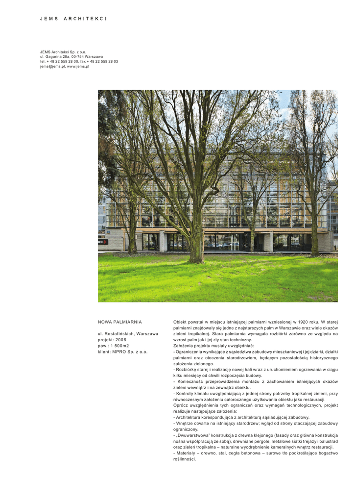 JEMS Architekci Sp. z o.o. ul. Gagarina 28a, 00-754 Warszawa tel. + 48 22 559 28 00, fax + 48 22 559 28 03 [email protected], www.jems.pl Nowa Palmiarnia ul. Rostafińskich, Warszawa projekt: 200 6 pow.: 1 500m2 klient: MPRO Sp. z o.o. Obiekt powstał w miejscu istniejącej palmiarni wzniesionej w 1920 roku. W starej palmiarni znajdowały się jedne z najstarszych palm w Warszawie oraz wiele okazów zieleni tropikalnej. Stara palmiarnia wymagała rozbiórki zarówno ze względu na wzrost palm jak i jej zły stan techniczny. Założenia projektu musiały uwzględniać: - Ograniczenia wynikające z sąsiedztwa zabudowy mieszkaniowej i jej działki, działki palmiarni oraz otoczenia starodrzewiem, będącym pozostałością historycznego założenia zielonego. - Rozbiórkę starej i realizację nowej hali wraz z uruchomieniem ogrzewania w ciągu kilku miesięcy od chwili rozpoczęcia budowy. - Konieczność przeprowadzenia montażu z zachowaniem istniejących okazów zieleni wewnątrz i na zewnątrz obiektu. - Kontrolę klimatu uwzględniającą z jednej strony potrzeby tropikalnej zieleni, przy równoczesnym założeniu całorocznego użytkowania obiektu jako restauracji. Oprócz uwzględnienia tych ograniczeń oraz wymagań technologicznych, projekt realizuje następujące założenia: - Architektura korespondująca z architekturą sąsiadującej zabudowy. - Wnętrze otwarte na istniejący starodrzew; wgląd od strony otaczającej zabudowy ograniczony. - „Dwuwarstwowa” konstrukcja z drewna klejonego (fasady oraz główna konstrukcja nośna współpracują ze sobą), drewniane pergole, metalowe siatki trejaży i balustrad oraz zieleń tropikalna – naturalne wyodrębnienie kameralnych wnętrz restauracji. - Materiały – drewno, stal, cegła betonowa – surowe tło podkreślające bogactwo roślinności. New Palm House Rostafinskich St., Warsaw project: 200 6 area.: 1 500m2 client: MPRO Sp. z o.o. The building was erected on the site of the existing Palm House built in 1920. The old Palm House contained the oldest palm trees in Warsaw and many specimens of tropical vegetation. The old Palm House had to be demolished both because of the growth of the palms and because of its poor state of repair. The design assumptions were expected to provide for: - Constraints resulting from the neighbouring residential development and the related plot of land, the Palm House plot and old trees growing in area, a remnant of historic landscaping. - Demolition of the old building and erection of a new one, including putting the heating system into operation, within a few months of the start of construction work. - The need to perform assembly work preserving the existing vegetation specimens inside and outside the facility. - Climate control catering for the needs of tropical greenery,, but also taking into account the intended all-year-round use of the facility as a restaurant. In addition to those technological constraints and requirements, the design provides for the following assumptions: - Architecture corresponding with the architecture of the neighbouring development. - Interior open to the existing old trees; limited insight from the surrounding buildings. - “Double-layer” structure of glued laminated wood (the façades and the main load-carrying structure are integrated with each other), wooden pergolas, metal mesh of trellises and balustrades, and tropical greenery - natural separation of intimate restaurant interiors. - Materials - wood, steel, concrete brick - a raw background emphasising the abundance of vegetation. JEMS Architekci Sp. z o.o. ul. Gagarina 28a, 00-754 Warszawa tel. + 48 22 559 28 00, fax + 48 22 559 28 03 [email protected], www.jems.pl