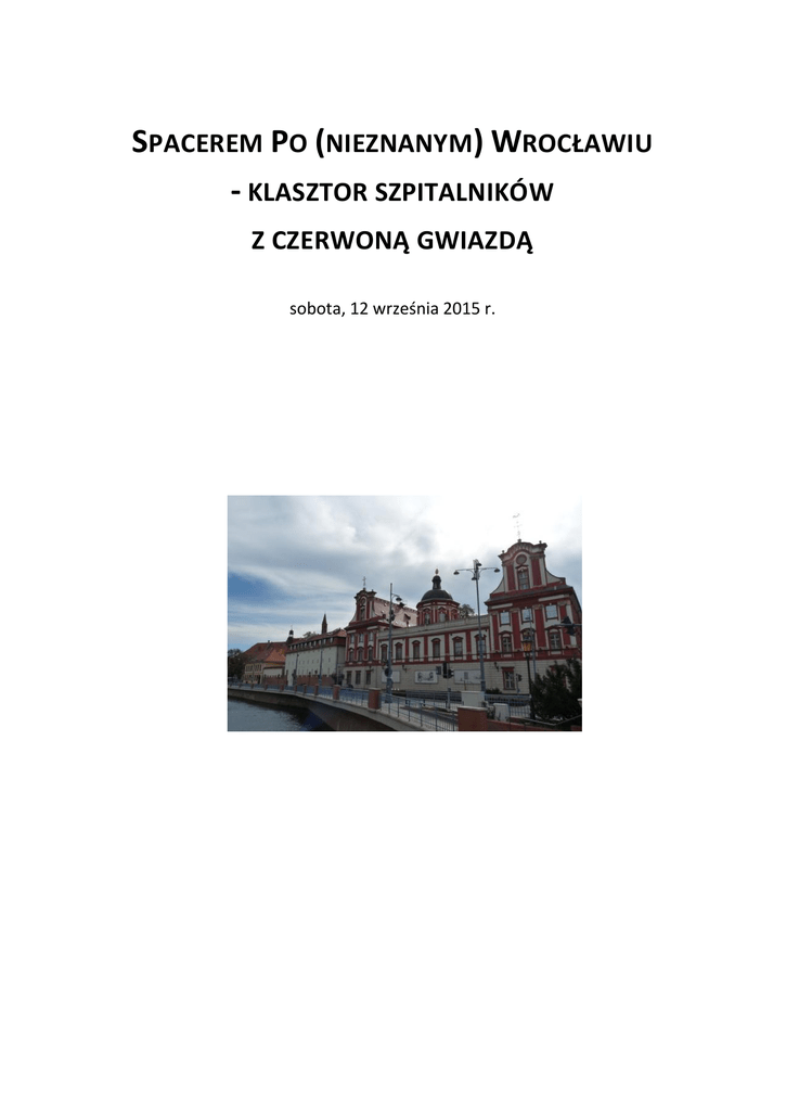 SPACEREM PO (NIEZNANYM) WROCŁAWIU - KLASZTOR SZPITALNIKÓW Z CZERWONĄ GWIAZDĄ sobota, 12 września 2015 r. W 1231 r. przy zespole klasztornym św. Franciszka w Pradze (założonym przez córkę króla czeskiego, Agnieszkę) powstał szpital. Ponad 20 lat później zakon przyjął herb w formie czerwonego krzyża i sześcioramiennej gwiazdy na czarnym polu. Początkowo funkcjonowało jako laicki zakon szpitalny, dopiero później nabrało charakteru duchownego. Do Polski zakon szpitalników sprowadziła siostra Agnieszki, księżna Anna, żona Henryka Pobożnego. Szpital, który przekazano zakonowi, znajdował się na terenie dworu książęcego, obejmującego również murowaną kaplicę dworską św. Macieja oraz rezydencję władcy (w której do śmierci mieszkała księżna Anna). Oficjalny dokument przekazania szpitala i kościoła krzyżowcom pochodzi z 26 II 1253 r. Przez cały okres funkcjonowania szpital pełnił rolę nie tylko leczniczą, ale także opiekuńczą. Przebywały tu głównie osoby starsze, biedne oraz dzieci, wydawano również posiłki dla ubogich. Szpital dysponował 80 łóżkami, ponadto chorzy mogli korzystać z kaplicy. Od 1506 r. działał także sierociniec. Co ciekawe, chorzy, ubodzy i zakonnicy mieszkali i jadali wspólnie, nosili identyczne ubrania, a chorzy wybierali swojego tzw. mistrza, który uczestniczył w zarządzaniu klasztorem. Cały kompleks klasztorny obejmował ok. 15 budynków, które były ze sobą połączone. Po północnej stronie znajdowały się najprawdopodobniej m.in. kuchnia, jadalnia, biblioteka, spiżarnia, stajnia, browar i piekarnia. Klasztor funkcjonował z mniejszymi lub większymi problemami, wynikającymi m.in. z niegospodarności, wojen husyckich czy reformacji. W XVIII w. władze pruskie w ramach akcji industrializacji, zmusiły klasztor do założenia magazynów i fabryki tytoniu. W 1804 r. w Prusach pojawił się zamiar konfiskaty dóbr klasztornych z wyłączeniem tych zakonów, które prowadziły działalność użyteczną społecznie. Nie uchroniło to szpitalników, którzy na podstawie edyktu sekularyzacyjnego z 1810 r. stracili swoje dobra. W wyniku "odwołania", szpital przeniesiono do budynku przy Zaułku Kapitulnym na Ostrowie Tumskim, a zakonnicy zamieszkali w budynku szkoły przy pl. Nankera. W budynku klasztoru działało od tej pory gimnazjum św. Macieja, w którym kształcili się m.in. Józef von Eichendorff, poeta okresu romantyzmu, Jan Dzierżon, znawca i hodowca pszczół, czy Franciszek Idzikowski, historyk Opolszczyzny. Uczniowie mogli korzystać z biblioteki, gabinetów przyrodniczych, sal: gimnastycznej, rysunkowej i muzycznej. Po zakończeniu II wojny światowej budynek nie posiadał części dachu, sklepienia ani szyb w oknach. Pieniądze na przebudowę zgromadzono już w październiku 1946 r., a prace rozpoczęto rok później. Prowizoryczna czytelnia z 32 miejscami działała już od 1 I 1947 r. W jeszcze częściowo zniszczonym budynku dawnego klasztoru umiejscowiono Zakład Archeologii i Historii Sztuki lwowskiego uniwersytetu. Już 18 VII 1946 r. przyjechał tu pierwszy transport z lwowskiego Zakładu Narodowego im. Ossolińskich. Trzon kolekcji Ossolineum stanowiła biblioteka - gł. rękopisy i druki. Ponadto obejmowała ona także ryciny, mapy, medale, obrazy i posągi. Początek kościołowi krzyżowców dała wzniesiona w 1. poł. XIII w. kaplica dworska pw. św. Macieja. Po otrzymaniu jej na własność (1253 r.), zakonnicy przystąpili do przebudowy, a właściwie do wzniesienia zupełnie nowej świątyni z zachowanym do dziś w południowej ścianie kamiennym portalem. Wzorem dla nowego kościoła stał się najprawdopodobniej rozbudowywany wówczas kościół św. Krzyża. Wieża powstała pod koniec XV w. i początkowo zakończona była smukłym gotyckim hełmem. W czasie kolejnej przebudowy hełm zmieniono na barokowy - niższy i cebulasty. W XVII w. wzniesiono - przylegający od północnej strony do prezbiterium - budynek mieszczący zakrystię i kaplicę św. Krzyża. Na ołtarzu kaplicy umieszczono przywiezione z Rzymu relikwie 10 męczenników i męczenniczek. W 1705 r. rozbudowano krypty grobowe, które znajdują się w zasadzie pod całą podłogą kościoła. W 1945 r., podczas oblężenia Wrocławia, spłonął dach i hełm wieży, stopiły się dzwony. Dodatkowo w 1958 r. -w czasie wichury - zawalił się fragment sklepienia w miejscu, w którym styka się prezbiterium i północny transept, niszcząc przy tym renesansową ambonę. Odbudowa świątyni prowadzona była w latach 1959-1966. Na fasadzie od strony zachodniej znajduje się fragment gotyckiej, marmurowej płyty nagrobnej pochodzącej z cmentarza św. Agnieszki (znajdującego się po przeciwnej stronie ul. Szewskiej). W chodniku przed wejściem do wieży od strony południowej leży granitowa płyta z kolistymi otworami. Pozostała ona po drugim cmentarzu, przykościelnym. Nawiązuje ona do średniowiecznego kultu zmarłych - otwory wypełniano olejem, łojem bądź woskiem i zapalano w nich światło. Po stronie południowej stoi również pomnik św. Jana Nepomucena z 1723 r. Pierwotnie znajdował się w murze otaczającym cmentarz - w roku ul. Szewskiej i pl. Nankera. Autorem pomnika był Jan Jerzy Urbański, jeden z najlepszych śląskich artystów barokowych. Św. Nepomucen został przedstawiony jako adorujący krucyfiks, natomiast w reliefie umieszczono scenę zrzucenia go z mostu praskiego do Wełtawy. Nad reliefem usytuowano głęboki otwór, wcześniej zamykany kutą kratą (skradziona w 1995 r.), w którym wystawiano światło. STOWARZYSZENIE ANIMACJI I ROZWOJU LOKALNEGO Istnieje od lipca 2015 r. Cel statutowy to aktywizonowanie społeczności lokalnych oraz działanie na rzecz rozwoju lokalnego przy wykorzystaniu innowacyjnych form współpracy. Zajmuje się organizacją spacerów tematycznych, opracowywaniem dokumentów strategicznych dla samorządów oraz organizacją szkoleń i warsztatów. www.