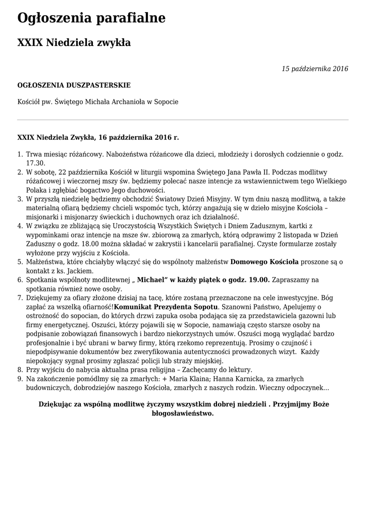 Ogłoszenia parafialne XXIX Niedziela zwykła 15 października 2016 OGŁOSZENIA DUSZPASTERSKIE Kościół pw. Świętego Michała Archanioła w Sopocie XXIX Niedziela Zwykła, 16 października 2016 r. 1. Trwa miesiąc różańcowy. Nabożeństwa różańcowe dla dzieci, młodzieży i dorosłych codziennie o godz. 17.30. 2. W sobotę, 22 października Kościół w liturgii wspomina Świętego Jana Pawła II. Podczas modlitwy różańcowej i wieczornej mszy św. będziemy polecać nasze intencje za wstawiennictwem tego Wielkiego Polaka i zgłębiać bogactwo Jego duchowości. 3. W przyszłą niedzielę będziemy obchodzić Światowy Dzień Misyjny. W tym dniu naszą modlitwą, a także materialną ofiarą będziemy chcieli wspomóc tych, którzy angażują się w dzieło misyjne Kościoła – misjonarki i misjonarzy świeckich i duchownych oraz ich działalność. 4. W związku ze zbliżającą się Uroczystością Wszystkich Świętych i Dniem Zadusznym, kartki z wypominkami oraz intencje na msze św. zbiorową za zmarłych, którą odprawimy 2 listopada w Dzień Zaduszny o godz. 18.00 można składać w zakrystii i kancelarii parafialnej. Czyste formularze zostały wyłożone przy wyjściu z Kościoła. 5. Małżeństwa, które chciałyby włączyć się do wspólnoty małżeństw Domowego Kościoła proszone są o kontakt z ks. Jackiem. 6. Spotkania wspólnoty modlitewnej „ Michael” w każdy piątek o godz. 19.00. Zapraszamy na spotkania również nowe osoby. 7. Dziękujemy za ofiary złożone dzisiaj na tacę, które zostaną przeznaczone na cele inwestycyjne. Bóg zapłać za wszelką ofiarność!Komunikat Prezydenta Sopotu. Szanowni Państwo, Apelujemy o ostrożność do sopocian, do których drzwi zapuka osoba podająca się za przedstawiciela gazowni lub firmy energetycznej. Oszuści, którzy pojawili się w Sopocie, namawiają często starsze osoby na podpisanie zobowiązań finansowych i bardzo niekorzystnych umów. Oszuści mogą wyglądać bardzo profesjonalnie i być ubrani w barwy firmy, którą rzekomo reprezentują. Prosimy o czujność i niepodpisywanie dokumentów bez zweryfikowania autentyczności prowadzonych wizyt. Każdy niepokojący sygnał prosimy zgłaszać policji lub straży miejskiej. 8. Przy wyjściu do nabycia aktualna prasa religijna – Zachęcamy do lektury. 9. Na zakończenie pomódlmy się za zmarłych: + Maria Klaina; Hanna Karnicka, za zmarłych budowniczych, dobrodziejów naszego Kościoła, zmarłych z naszych rodzin. Wieczny odpoczynek… Dziękując za wspólną modlitwę życzymy wszystkim dobrej niedzieli . Przyjmijmy Boże błogosławieństwo.