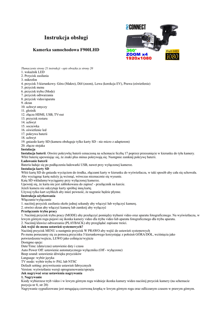 Instrukcja obsługi Kamerka samochodowa F900LHD Tłumaczenie strony 21 instrukcji - opis obrazka ze strony 20 1. wskaźnik LED 2. Przycisk zasilania 3. mikrofon 4. przycisk 5-kierunkowy. Góra (Makro), Dół (zoom), Lewa (korekcja EV), Prawa (oświetlenie) 5. przycisk menu 6. przycisk trybu (Mode) 7. przycisk odtwarzania 8. przycisk video/aparatu 9. ekran 10. uchwyt smyczy 11. głośnik 12. złącza HDMI, USB, TV-out 13. przycisk restaru 14. uchwyt 15. soczewka 16. oświetlenie led 17. pokrywa baterii 18. uchwyt 19. gniazdo karty SD (kamera obsługuje tylko karty SD - nie micro z adapterem) 20. złącze stojaka Instalacja Instalacja baterii. Otwórz pokrywkę baterii oznaczoną na schemacie liczbą 17 poprzez przesunięcie w kierunku do tyłu kamery. Włóż baterię upewniając się, że znaki plus minus pokrywają się. Następnie zamknij pokrywę baterii. Ładowanie baterii Bateria ładuje się po podłączeniu ładowarki USB, nawet przy wyłączonej kamerze. Instalacja karty SD Włóż kartę SD do gniazda wycięciem do środka, złączami karty w kierunku do wyświetlacza, w taki sposób aby cała się schowała. Aby wyciągnąc kartę należy ją wcisnąć, wówczas nieznacznie się wysunie. Katę SD wkładamy/wyciągamy przy wyłączonej kamerze. Upewnij się, że karta nie jest zablokowana do zapisu! - przełącznik na karcie. Jeżeli kamera nie odczytuje karty spróbuj inną kartę. Używaj tylko kart szybkich aby mieć pewność, że nagranie będzie płynne. Instrukcja użytkowania Włączanie/wyłączanie 1. naciśnij przycisk zasilania około jednej sekundy aby włączyć lub wyłączyć kamerę. 2. otwórz ekran aby włączyć kamerę lub zamknij aby wyłączyć Przełączanie trybu pracy 1. Naciśnij przycisk trybu pracy (MODE) aby przełączyć pomiędzy trybami video oraz aparatu fotograficznego. Na wyświetlaczu, w lewym górnym rogu pojawi się ikonka kamery video dla trybu video lub aparatu fotograficznego dla trybu aparatu. 2. Naciśnij klawisz odtwarzania (PLAYBACK) aby przeglądać zapisane treści. Jak wejść do menu ustawień systemowych? Naciśnij przycisk MENU a następnie przycisk W PRAWO aby wejść do ustawień systemowych Po menu poruszamy się za pomocą przycisku 5 kierunkowego korzystając z położeń GÓRA/DÓŁ, wciśnięcia jako potwierdzenie/wejście, LEWO jako cofnięcie/wyjście Dostępne opcje: Date/Time: (data/czas) ustawienie daty i czasu Auto Power Off: ustawienie automatycznego wyłącznika (Off - wyłączone) Beep sound: ustawienie dźwięku przycisków Language: wybór języka TV mode: wybór trybu tv PAL lub NTSC Default setting: przywrócenie ustawień fabrycznych Version: wyświetlanie wersji oprogramowania/sprzętu Jak nagrywać oraz ustawienia nagrywania 1. Nagrywanie Kiedy wybierzesz tryb video i w lewym górnym rogu widnieje ikonka kamery wideo naciśnij przycisk kamery (na schemacie pozycja nr 8, str 20) Nagrywanie sygnalizowane jest mrugającą czerwoną kropką w lewym górnym rogu oraz odliczanym czasem w prawym górnym. 2. Używanie diody led do podświetlenia Podczas nagrywania możesz załączyć diodę led poprzez przyciśnięcie PRAWO na przycisku pięciokierunkowym. Aby wyłączyć diodę powtórz procedurę. 3. Ustawienia nagrywania Naciśnij przycisk MENU aby wejść w ustawienia nagrywania. Menu dostępne tylko przy wyłączonym nagrywaniu. Dostępne opcje: Resolution: (rozdzielczość) Loop recording: (nagrywanie w pętli) Off - wyłączone (po zapełnieniu karty nagrywanie zatrzyma się), 5/10/15min - nagrywanie w pętli, długość plików po 5/10/15min. Po zapełnieniu karty najstarsze pliki będą nadpisywane. Motion detection: (detekcja ruchu) On - włączona, Off - wyłączona Kamera nagrywa tylko po wykryciu ruchu. Konieczne załącznie nagrywania! Record audio: (nagrywanie dźwięku) On - włączone, Off - wyłączone Date stamp: (dodawanie do zapisu stopki z czasem) On - włączone, Off - wyłączone Aby wyjść z menu naciśnij klawisz MENU Jak robić zdjęcia oraz ustawienia aparatu fotograficznego. 1. Wybierz tryb aparatu fotograficznego przyciskiem MODE. W lewym górnym rogu pojawi się ikonka aparatu fotograficznego. 2. Nakieruj kamerę na obiekt który chcesz sfotografować i poczekaj aż będzie wyraźny. 3. Naciśnij przycisk kamery/aparatu (na schemacie pozycja nr 8, str 20) 4. Samo wyzwalacz - ustaw w menu samowyzwalacz na odpowiadający Ci czas. Naciśnij przycisk wyzwalacza. Aparat zrobi zdjęcie po upływie określonego czasu. 5. Ustawienia aparatu fotograficznego. Aby wejść do ustawień naciśnij przycisk MENU. Dostępne opcje: Capture mode: (tryb robienia zdjęć) singla shot (zdjęcie po naciśnięciu klawisza kamery/aparatu), two sec (samowyzwalacz z opóźnieniem 2 sek), five sec ((samowyzwalacz z opóźnieniem 5 sek), ten sec (samowyzwalacz z opóźnieniem 10 sek), sequence (tryb zdjęć seryjnych) Resolution: (rozdzielczość w megapixelach) 12/8/5/3M Quality: (ustawienia jakości zdjęć/komprecji) super fine (najlepsza), fine (średnia), normal (najsłabsza) Sharpness: (ustawienia ostrości) strong (silna), normal (normalna), soft (miękka) White balance: (ustawienia balansu bieli) Auto (automatyczna), daylight (światło dzienne), cloudy (pochmurno), tungsten (sztuczne), fluorescent (fluoroscencyjne) Color: (wybór trybu koloru) normal (zdjcia kolorowe), sepia (kolory sepii), black-white (czarno białe) ISO: (ustawienia czułości ISO) auto/100/200/400 Exposure: (ustawienie korekcji ekspozycji w stopniach EV) Face detection: (wykrywanie twarzy) Off (wyłączone), Face detection (wykrywanie twarzy), Smile detection (wykrywanie uśmiechu) Anti-shaking: (ustawienia redukcji wstrząsów) on (włączone), off (wyłączone) Quick review: (podgląd zrobionego zdjęcia) Off (wyłączone) 2s, 5s Date stamp: (ustawienie dołanczania stopki z czasem) W trybie fotograficznym możesz szybko korygować ekspozycję poprzez naciśnięcie przycisku LEWO oraz doświetlić obraz diodą led po naciśnięc