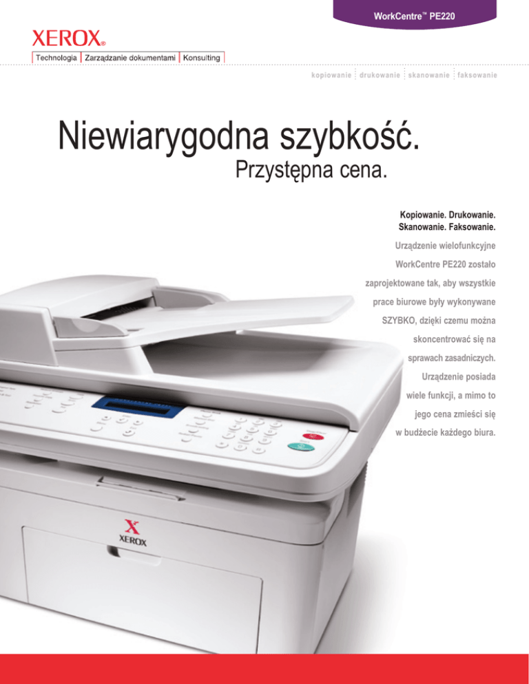 WorkCentre™ PE220 kopiowanie drukowanie skanowanie faksowanie Niewiarygodna szybkość. Przystępna cena. Kopiowanie. Drukowanie. Skanowanie. Faksowanie. Urządzenie wielofunkcyjne WorkCentre PE220 zostało zaprojektowane tak, aby wszystkie prace biurowe były wykonywane SZYBKO, dzięki czemu można skoncentrować się na sprawach zasadniczych. Urządzenie posiada wiele funkcji, a mimo to jego cena zmieści się w budżecie każdego biura. WorkCentre™ PE220 Aby uzyskać więcej informacji, skontaktuj się z lokalnym przedstawicielem firmy XEROX lub odwiedź naszą witrynę internetową www.xerox.pl Kopiowanie. Drukowanie. Skanowanie. Faksowanie. Urządzenie wielofunkcyjne WorkCentre™PE220 KONFIGURACJA Szybkość Cykl roboczy Obsługa papieru Pojemność wejściowa Automatyczny podajnik dokumentów Wyjście papieru Kopiowanie Czas kopiowania pierwszej strony Rozdzielczość Funkcje kopiowania Rozdzielczość wydruku Procesor / PDL Łączność Rozdzielczość skanowania Szybkość faksowania Rozdzielczość Gwarancja Do 20 stron na minutę Do 5 000 stron/miesiąc 150-arkuszowy podajnik główny, 1-arkuszowy podajnik boczny 30 arkuszy 50 arkuszy, zadrukowaną stroną do dołu Około 11 s 600 x 600 dpi powiększenie x 2 i 4, sortowanie, autodopasowanie, powtarzanie obrazu, plakaty, wielokrotne kopie, kopiowanie kart identyfikacyjnych 600 x 600 dpi GDI USB 1.1 (zgodność z USB 2.0), port równoległy IEEE 1284 600 x 600 dpi, do 4800 x 4800 dpi tryb ulepszony Szybkość transmisji 3 s przy 33,6 Kbps 203 x 98 dpi (standard), 203 x 196 (wysoka/zdjęcia), 300 x 300 (najwyższa), 200 x 200 dpi (kolor) 24 miesiące z naprawą w miejscu instalacji SPECYFIKACJE Kopiowanie Szybkość: Do 20 stron na minutę A4 Rozdzielczość: 600 x 600 dpi Czas kopiowania pierwszej strony: Około 11 s Drukowanie Technologia: Laser czarno biały Szybkość: 20 stron na minutę A4 Rozdzielczość: 600 x 600 dpi Czas drukowania pierwszej strony: Około 11 s Języki opisu strony (PDL): GDI Pamięć: 10 MB Sterowniki druku: Windows 98, ME, 2K, XP, Mac OS 10.3, Linux Interfejsy: USB 1.1 (zgodność z USB 2.0), port równoległy IEEE 1284 Skanowanie Zgodność: Standard TWAIN (Windows 98, ME, 2K, Mac, Linux), standard WIA (Windows XP) Rozdzielczość skanowania Optyczna: 600 x 600 dpi Rozszerzona: Do 4800 dpi Głębokość Kolor: 24 bit Mono: Tryb 1-bitowy dla obrazu kreskowego, półtonowanie Tryb 8-bitowy dla skali szarości Pakiet oprogramowania skanującego PaperPort® SE 10.0 ABBYY® FineReader® 6.0 Sprint Plus Faksowanie Zgodność: ITU-T Group 3, ECM Szybkość transmisji: Ok. 3 s na stronę przy 33,6 Kbps Szybkość modemu: 33 Kbps Kompresja danych: MH/MR/MMR, JPEG (kolor) Pamięć: 2 MB (160 stron)* Rozdzielczości Standardowa (203 x 98 dpi) Podwyższona (203 x 196 dpi) Najwyższa (300 x 300 dpi) Fotografia (203 x 196 dpi) Kolor (200 x 200 dpi) Obsługa nośników Pojemność podajników wejściowych Taca główna: 150 arkuszy Minimalny rozmiar: 76 x 127 mm Maksymalny rozmiar: 216 x 356 mm Gramatura papieru 60 do 90 g/m2 Zasobnik obejścia: 1 arkusz Minimalny rozmiar: 76 x 127 mm Maksymalny rozmiar: 216 x 356 mm Gramatura papieru 60 do 165 g/m2 Program do obsługi dokumentów: 30 arkuszy Szerokość: 142 - 216 mm Długość: 148 - 356 mm Gramatura papieru 60 do 90 g/m2 Wydajność kopiowania: 50 arkuszy (zadrukowaną stroną do dołu) Typy materiałów: Papier zwykły, koperty, etykiety, pocztówki, folie Gabaryty (WxDxH) 438 x 374 x 368 mm Waga: 10,4 kg Środowisko Temperatura Maksymalny zakres: 10° – 32° C Zalecany zakres: 16° – 30° C Wilgotność Maksymalny zakres: 20 - 80% Zalecany zakres: 30 - 70% Elektryczność Zasilanie: 220-240 VAC, 50 / 60 Hz, 2.5 A Maksymalne zużycie energii: 350 wat zgodność z ENERGY STAR® Specyfikacje ogólne Pamięć: 16 MB Zarządzanie urządzeniem: ControlCentre™ 5.0 Uniwersalna kaseta: Zestawy inteligentne® Kaseta z tonerem 3k przy 5% ISO19752 Cykl roboczy: 5,000 (maksimum) Zalecany średni miesięczny wolumen: Do 750 stron Aprobaty Agencji Bezpieczeństwa: UL Safety ETL Semko Wszystko załatwione. Szybkość. Zaprojektowane, aby działać szybko. • Szybkość drukowania i kopiowania do 20 stron na minutę • Szybki czas nagrzewania i krótki czas potrzebny na uzyskanie pierwszej kopii sprawiają, że nie trzeba czekać. • Faksowanie w błyskawicznym tempie 3 sekund na stronę. Prostota. Prosty w użyciu interfejs z podstawowymi funkcjami sprawia, że obsługa jest łatwa. • Małe rozmiary - możesz ją postawić na biurku i mieć zawsze pod ręką • Prosta instalacja typu “plug & play” • Skanowanie kolorowe przez port USB Przystępna cena. Otrzymujesz potężny zestaw funkcji drukarki, kopiarki, skanera i faksu w jednym urządzeniu, i to wszystko w przystępnej cenie. • Dzięki jednemu wspaniałemu urządzeniu oszczędzasz miejsce, czas i pieniądze • Cena została ustalona na takim poziomie, aby każdy użytkownik mógł sobie na nie pozwolić • Najlepszy stosunek wydanej złotówki do otrzymanych za nią funkcji *W oparciu o schemat nr 1 CCIT przy standardowej rozdzielczości. © 2005 Xerox Corporation. Wszelkie prawa zastrzeżone. XEROX® i WorkCentre™ są znakami towarowymi Xerox Corporation. Energy Star ® jest znakiem towarowym zarejestrowanym w USA. Jako partner Energy Star®, firma Xerox Corporation stwierdziła, że te produkty są zgodne z wytycznymi Energy Star® dotyczącymi efektywności wykorzystania energii. Informacje o produktach oraz ich specyfikacje mogą ulec zmianie bez uprzedzenia. 11/05 610P724480 P22BR-01JA