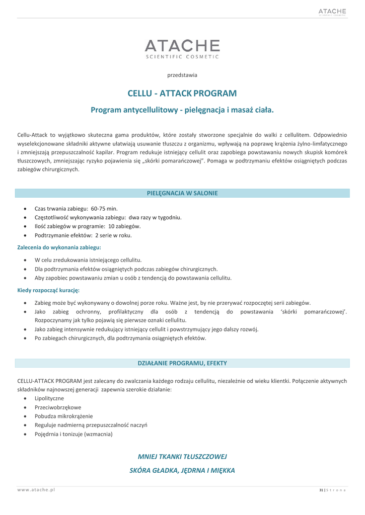 przedstawia CELLU - ATTACK PROGRAM Program antycellulitowy - pielęgnacja i masaż ciała. Cellu-Attack to wyjątkowo skuteczna gama produktów, które zostały stworzone specjalnie do walki z cellulitem. Odpowiednio wyselekcjonowane składniki aktywne ułatwiają usuwanie tłuszczu z organizmu, wpływają na poprawę krążenia żylno-limfatycznego i zmniejszają przepuszczalnośd kapilar. Program redukuje istniejący cellulit oraz zapobiega powstawaniu nowych skupisk komórek tłuszczowych, zmniejszając ryzyko pojawienia się „skórki pomaraoczowej”. Pomaga w podtrzymaniu efektów osiągniętych podczas zabiegów chirurgicznych. PIELĘGNACJA W SALONIE Czas trwania zabiegu: 60-75 min. Częstotliwośd wykonywania zabiegu: dwa razy w tygodniu. Ilośd zabiegów w programie: 10 zabiegów. Podtrzymanie efektów: 2 serie w roku. Zalecenia do wykonania zabiegu: W celu zredukowania istniejącego cellulitu. Dla podtrzymania efektów osiągniętych podczas zabiegów chirurgicznych. Aby zapobiec powstawaniu zmian u osób z tendencją do powstawania cellulitu. Kiedy rozpocząd kurację: Zabieg może byd wykonywany o dowolnej porze roku. Ważne jest, by nie przerywad rozpoczętej serii zabiegów. Jako zabieg ochronny, profilaktyczny dla osób z tendencją do powstawania ‘skórki pomaraoczowej’. Rozpoczynamy jak tylko pojawią się pierwsze oznaki cellulitu. Jako zabieg intensywnie redukujący istniejący cellulit i powstrzymujący jego dalszy rozwój. Po zabiegach chirurgicznych, dla podtrzymania osiągniętych efektów. DZIAŁANIE PROGRAMU, EFEKTY CELLU-ATTACK PROGRAM jest zalecany do zwalczania każdego rodzaju cellulitu, niezależnie od wieku klientki. Połączenie aktywnych składników najnowszej generacji zapewnia szerokie działanie: Lipolityczne Przeciwobrzękowe Pobudza mikrokrążenie Reguluje nadmierną przepuszczalnośd naczyo Pojędrnia i tonizuje (wzmacnia) MNIEJ TKANKI TŁUSZCZOWEJ SKÓRA GŁADKA, JĘDRNA I MIĘKKA www.atache.pl 31 | S t r o n a AKTYWNE SKŁADNIKI Ekstrakty z wodorostów (Morszczyn pęcherzykowaty, Laminaria digitata): charakteryzują się dużą zawartością jodu organicznego, który zapobiega gromadzeniu się tkanki tłuszczowej oraz wspomaga rozkład i wydalanie tłuszczu. Ponadto zawierają kwas alginowy o działaniu nawilżającym i stymulującym przemianę materii. Są również bogatym źródłem witamin i mikroelementów. L-karnityna: substancja aktywna biologicznie, której działanie polega na przekształcaniu cząsteczek tłuszczu w energię, czyli spalaniu tkanki tłuszczowej, co daje widoczne efekty wyszczuplające. L-karnityna dostarczona skórze zapobiega również odkładaniu się tkanki tłuszczowej. Kofeina: silne właściwości hamujące odkładanie tłuszczu w tkankach, mocne działanie lipolityczne. Stymuluje przemianę materii i poprawia mikrokrążenie krwi w tkankach skóry, wspomaga wydalanie złogów tłuszczu i toksyn z organizmu. Guarana (Paullinia cupana): nasiona tej rośliny zawierają kofeinę oraz witaminę B3, składniki, które wykazują działanie pobudzające, drenujące oraz wspomagające proces oczyszczania ciała z toksyn. Dobrze wpływa na zwiotczałą skórę. Bluszcz pospolity (Hedera helix L.): ekstrakt z liści działa przeciwobrzękowo i przeciwzapalnie. Łatwo przenika w głąb skóry. Zawiera cenne flawonoidy (zwiększają zapotrzebowanie na energię, czyli spalają nadmiar tłuszczu) i saponiny triterpenowe (przyspieszają usuwanie tłuszczu i toksyn nagromadzonych w tkance skórnej). Poprawia wchłanianie innych aktywnych składników. Ruszczyk kolczasty (Ruscus aculeatus): wyciąg z korzenia zawiera saponiny sterydowe (m.in. ruscynę), które wzmacniają i uszczelniają naczynia krwionośne. Ekstrakt zapobiega zastojom limfy i krążenia żylnego oraz eliminuje podrażnienia i zaczerwienienia. Chłodzi i działa przeciwzapalnie. Bioflawonoidy cytrusowe (Citrus aurantium L., Citrus limonum): flawonoidy zawarte w gorzkiej pomaraoczy i cytrynie zmniejszają nadmierną przepuszczalnośd naczyo krwionośnych poprzez ich uszczelnienie. Hamują procesy zapalne w skórze oraz przyspieszają gojenie i regenerację skóry. Ostropest plamisty (Silybum marianum) - wyciąg o udowodnionym działaniu ujędrniającym dzięki hamowaniu enzymu elastazy. Wzmacnia naczynia krwionośne zapobiegając powstawaniu obrzęków i wysięków okołonaczyniowych. Doskonale odtruwa organizm z wszelkich trucizn. Wszystko to dzięki trzem substancjom nazywanym sylimaryną. Przywrotnik pospolity (Alchemilla vulgaris) - surowcem o właściwościach leczniczych jest ziele przywrotnika. Zawiera duże ilości garbników. Związki te charakteryzują się działaniem ściągającym i przeciwzapalnym. Pomocny w chorobach skórnych (świąd skóry, trudno gojące się rany). Skrzyp polny (Equisetum arvense) - działa przeciwbakteryjnie, remineralizująco i regenerująco. Ziele jest cennym źródłem saponin, flawonoidów, potasu i krzemu, którego duże ilości niezbędne są w prawidłowym funkcjonowaniu tkanek. Krzem zmniejsza przepuszczalnośd naczyo krwionośnych (tkanki łącznej) oraz utrzymuje prawidłową elastycznośd skóry. Soja zwyczajna (Glycine soya) - zawiera izoflawony, nienasycone kwasy tłuszczowe, witaminy A, E, K oraz B, sole mineralne. Oprócz aktywności proestrogennej ekstrakty z soi wykazują działanie nawilżające, odżywcze i regenerujące. Olejki eteryczne: Rozmaryn (Rosmarinus officinalis), Cyprys (Cupressus sempervirens), Czystek ladanowy (Cistus L.), Mięta (Mentha arvensis), Mięta pieprzowa (Mentha piperita) Lawenda ( Lavandula hybryda oil), Cytryna (Citrus limonum) doskonale tonizują skórę, oczyszczają i wygładzają. Ekstrakty (inne): Nagietek lekarski (Calendula officinalis), korzeo rzodkwi (Raphanus sativus), Pszenica zwyczajna (Triticum vulgare), Lucerna siewna (Medicago sativa). Ekstrakty tworzą kompleks ujędrniający, stymulujący produkcję elastyny, stabilizują i wzmacniają glikozaminoglikany tkanki