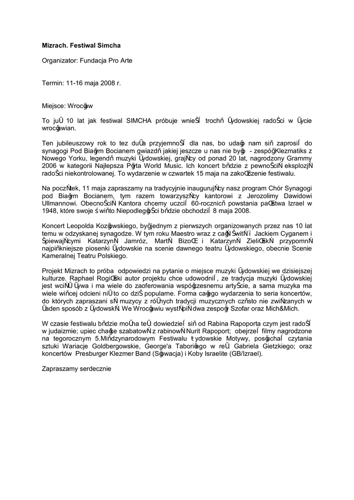 Mizrach. Festiwal Simcha Organizator: Fundacja Pro Arte Termin: 11