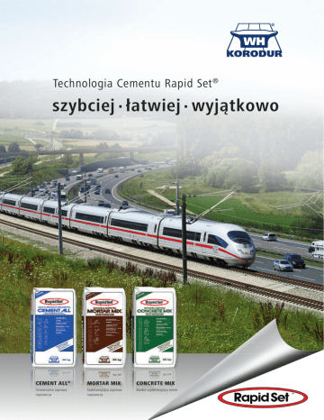 Technologia Cementu Rapid Set® szybciej łatwiej wyjątkowo CEMENT ALL® MORTAR MIX CONCRETE MIX Uniwersalna zaprawa naprawcza Szybkowiążąca zaprawa naprawcza Bardzo szybkowiążący beton KORODUR i CTS Cement dwaj silni partnerzy Wyłączna licencja na Europę! KORODUR, lider światowego rynku posadzek Cement Rapid Set® nadaje zaprawom naprawczym Rapid przemysłowych z twardego kruszywa jest wyłącznym Set® doskonałą i niespotykaną sprawność: skrajnie wysoka licencjobiorcą lidera amerykańskiego rynku cementów wytrzymałość już po jednej godzinie! Przydatność do ruchu specjalnych CTS Cement I Rapid Set®. natychmiast po wykonaniu! Brak skurczu! Uniwersalność! Odporność na siarczany! Doskonała trwałość! Zredukowana Wyjątkowa technologia Rapid Set nowa w Europie, sprawdzona w USA emisja CO2 przy produkcji! ® Rapid Set® oznacza innowacje, wysokie parametry i uniwersalne właściwości! Amerykański producent i lider rynku cementów specjalnych CTS Cement rozwinął unikalną, zaawansowaną technologię Cement Rapid Set® przez ostatnie 25 lat stał się w USA cementu Rapid Set® wkraczając na nowy poziom technologii produktem najczęściej stosowanym przez wykonawców cementu i uzyskując rozwiązania dla istotnych problemów do szybkiego i wydajnego rozwiązywania problemów. przemysłu budowlanego. Cement Rapid Set® to ZIELONY produkt - przyjazny Technologia Rapid Set® opiera się na innowacyjnym, dla środowiska, trwały i zgodny z wymaganiami LEED. szybkim, bezskurczowym i hydraulicznym cemencie specjalnym “Rapid Set® Cement“. Ten specjalny cement CTS Cement jest członkiem uzyskuje swój wyjątkowy charakter poprzez Amerykańskiego Stowarzyszenia Budownictwa Ekologicznego U.S. zaawansowany i precyzyjny proces produkcji. Cement Rapid Set nie jest cementem portlandzkim. Nie zawiera ® chlorków ani przyspieszaczy. GREEN Green Building Council. Podczas CEMENT TM produkcji Rapid Set® Cement emisja CO2 jest mniejsza o 30 % w porównaniu, z produkcją cementu portlandzkiego. WYŻSZE PARAMETRY UNIWERSALNOŚĆ SZYBSZE WIĄZANIE MNIEJSZY SKURCZ WYŻSZA TRWAŁOŚĆ MNIEJSZA EMISJA CO2 Technologia Rapid Set® - sprawdzona przez lata w USA Pentagon, Zapora Hoovera Wysoko rozwinięta technologia Rapid Set® Przebieg reakcji: porównanie pomiędzy cementem portlandzkim i cementem Rapid Set® Przebieg reakcji chemicznej typowego cementu portlandzkiego różni się istotnie od reakcji cementu Rapid Set®. Cement Rapid Set® przy stosunku w/c = 0,45 wiąże chemicznie 100 % wody zarobowej. Składniki wyjściowe produkty reakcji cementu portlandzkiego produkty reakcji cementu Rapid Set® (max. stosunek związanej chem. wody do cementu = 0,25) (max. stosunek związanej chem. wody do cementu = 0,45) kruszywo cement woda powietrze Unikalne działanie cementu Rapid Set® Skurcz Rapid Set ca. 42 ca. 35 ca. 28 ca. 21 MI . CE mod ca. 14 ca. 7 0 2 4 6 8 10 CEM I 12 14 16 18 20 22 zmiana długości w % wytrzymałość na ściskanie N/mm² Wytrzymałość 0.00 Rapid Set -0.02 wymaganie dla spoiw bezskurczowych w USA -0.04 -0.06 CEM I -0.08 0 2 4 6 8 10 12 14 16 18 20 28 czas (dni) czas (godziny) mod. CEM I Rapid Set® - bardzo wysoka wytrzymałość Rapid Set® - znacznie mniejszy skurcz niż przy na koniec wiązania cemencie portlandzkim Wykres pokazuje, że narastanie wysokiej wytrzymałości Wykres pokazuje typowy przebieg skurczu zwykłych spoiw wczesnej zaprawy następuje znacznie szybciej na cemencie (na cemencie CEM I i CEM I modyfikowany) w porównaniu Rapid Set niż na cemencie CEM I lub modyfikowanym ze spoiwem na cemencie Rapid Set®. Maksymalny skurcz ® CEM I (z przyspieszaczem). Już po 1 godzinie od dopuszczalny w USA (US Army Corps of Engineers) dla zakończenia wiązania wytrzymałość na ściskanie spoiw bezskurczowych wynosi 0,05 %. Technologia przekracza 20 N/mm². Rapid Set® spełnia z zapasem to wymaganie. Unikalne produkty Rapid Set® Tylko oryginalne produkty Rapid Set® zawierają wyjątkowy i trwały, specjalny Rapid Set® Cement. ZASTOSOWANIE c GRUBOŚĆ WARSTWY hnellmörtel Naprawy betonu, reprofilacja, odlewy, kotwienie, iniekcja, podlewki, układanie w szalunkach, szpachlowanie, budownictwo przemysłowe, drogowe, lądowe i podziemne, przemysł prefabrykatów, do wewnątrz, na zewnątrz i do pomieszczeń wilgotnych CEMENT ALL® “0“ mm 100 mm 15 mm 150 mm 50 mm 600 mm Uniwersalna zaprawa naprawcza Naprawy betonu, reprofilacja, podkłady podłogowe, układanie w szalunkach, naprawy dróg, budownictwo przemysłowe i drogowe, lądowe i podziemne, przemysł prefabrykatów, do wewnątrz, na zewnątrz i do pomieszczeń wilgotnych MORTAR MIX Szybkowiążąca zaprawa naprawcza CONCRETE MIX Bardzo szybkowiążący beton Naprawy betonu, reprofilacja, budowa dróg i ścieżek, fundamenty do maszyn, kotwienie, betonowanie w szalunkach, budownictwo przemysłowe i autostradowe, lądowe i podziemne, przemysł prefabrykatów, do wewnątrz, na zewnątrz i do pomieszczeń wilgotnych 1) Dane techniczne w temperaturze + 20°C i wilgotności względnej 65% 2) NPD 2) 30.690 N/mm² > 41,0 N/mm² > 35,0 N/mm² > 25,0 N/mm² > 19,0 N/mm² po 60 min. po 15 min. NPD 2) 26.827 N/mm² > 48,0 N/mm² > 35,0 N/mm² > 28,0 N/mm² > 17,0 N/mm² po 60 min. po 15 min. 31.700 N/mm² > 62,0 N/mm² > 41,0 N/mm² > 31,0 N/mm² > 20,0 N/mm² po 60 min. po 15 min. pie RN , up łyn OŚ cze NA cze , op CI SZ OŚ CI PE NE TR AC YJN E IE YM ISK AN PIE 1) ŚC EM IA YS TO Ś nia ĘŻ ŚĆ CH AN óźn iac ze OD Ć PO N OD RN A SIA LA OŚĆ DZ RC AJĄ NA ZA CE MRÓ WŁ NY ZI AŚ S CIW OL E PO sza I PR ch ŁS ach DA ys T K OD prz DO uta ch dni nia min DU 28 7d 180 ch RU ĄZ ŁO NIE WI MA uta ZY min TR 60 MO po po po po WY ŻE ĄT EK CIĄ CZ OB PO CECHY SZCZEGÓLNE bezskurczowa szybsze wiązanie wyższa wytrzymałość bez mostka sczepnego grubość warstwy można ściągnąć prawie do zera bezskurczowa szybsze wiązanie wyższa wytrzymałość bez mostka sczepnego można aplikować nad gł