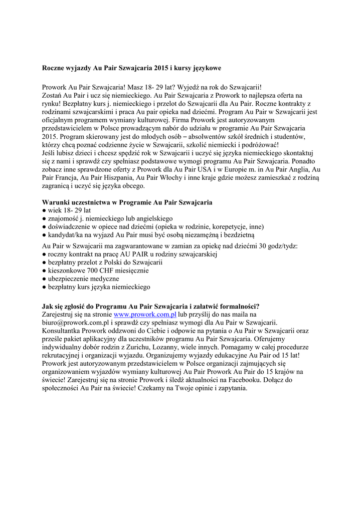 Roczne wyjazdy Au Pair Szwajcaria 2015 i kursy językowe Prowork Au Pair Szwajcaria! Masz 18- 29 lat? Wyjedź na rok do Szwajcarii! Zostań Au Pair i ucz się niemieckiego. Au Pair Szwajcaria z Prowork to najlepsza oferta na rynku! Bezpłatny kurs j. niemieckiego i przelot do Szwajcarii dla Au Pair. Roczne kontrakty z rodzinami szwajcarskimi i praca Au pair opieka nad dziećmi. Program Au Pair w Szwajcarii jest oficjalnym programem wymiany kulturowej. Firma Prowork jest autoryzowanym przedstawicielem w Polsce prowadzącym nabór do udziału w programie Au Pair Szwajcaria 2015. Program skierowany jest do młodych osób – absolwentów szkół średnich i studentów, którzy chcą poznać codzienne życie w Szwajcarii, szkolić niemiecki i podróżować! Jeśli lubisz dzieci i chcesz spędzić rok w Szwajcarii i uczyć się języka niemieckiego skontaktuj się z nami i sprawdź czy spełniasz podstawowe wymogi programu Au Pair Szwajcaria. Ponadto zobacz inne sprawdzone oferty z Prowork dla Au Pair USA i w Europie m. in Au Pair Anglia, Au Pair Francja, Au Pair Hiszpania, Au Pair Włochy i inne kraje gdzie możesz zamieszkać z rodziną zagranicą i uczyć się języka obcego. Warunki uczestnictwa w Programie Au Pair Szwajcaria ● wiek 18- 29 lat ● znajomość j. niemieckiego lub angielskiego ● doświadczenie w opiece nad dziećmi (opieka w rodzinie, korepetycje, inne) ● kandydat/ka na wyjazd Au Pair musi być osobą niezamężną i bezdzietną Au Pair w Szwajcarii ma zagwarantowane w zamian za opiekę nad dziećmi 30 godz/tydz: ● roczny kontrakt na pracę AU PAIR u rodziny szwajcarskiej ● bezpłatny przelot z Polski do Szwajcarii ● kieszonkowe 700 CHF miesięcznie ● ubezpieczenie medyczne ● bezpłatny kurs języka niemieckiego Jak się zgłosić do Programu Au Pair Szwajcaria i załatwić formalności? Zarejestruj się na stronie www.prowork.com.pl lub przyślij do nas maila na [email protected] i sprawdź czy spełniasz wymogi dla Au Pair w Szwajcarii. Konsultantka Prowork oddzwoni do Ciebie i odpowie na pytania o Au Pair w Szwajcarii oraz prześle pakiet aplikacyjny dla uczestników programu Au Pair Szwajcaria. Oferujemy indywidualny dobór rodzin z Zurichu, Lozanny, wiele innych. Pomagamy w całej procedurze rekrutacyjnej i organizacji wyjazdu. Organizujemy wyjazdy edukacyjne Au Pair od 15 lat! Prowork jest autoryzowanym przedstawicielem w Polsce organizacji zajmujących się organizowaniem wyjazdów wymiany kulturowej Au Pair Prowork Au Pair do 15 krajów na świecie! Zarejestruj się na stronie Prowork i śledź aktualności na Facebooku. Dołącz do społeczności Au Pair na świecie! Czekamy na Twoje opinie i zapytania.