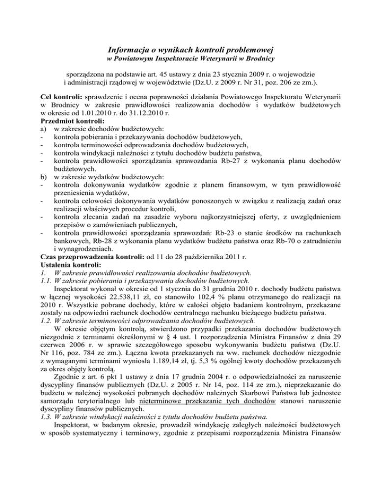 Informacja o wynikach kontroli problemowej w Powiatowym Inspektoracie Weterynarii w Brodnicy sporządzona na podstawie art. 45 ustawy z dnia 23 stycznia 2009 r. o wojewodzie i administracji rządowej w województwie (Dz.U. z 2009 r. Nr 31, poz. 206 ze zm.). Cel kontroli: sprawdzenie i ocena poprawności działania Powiatowego Inspektoratu Weterynarii w Brodnicy w zakresie prawidłowości realizowania dochodów i wydatków budżetowych w okresie od 1.01.2010 r. do 31.12.2010 r. Przedmiot kontroli: a) w zakresie dochodów budżetowych: - kontrola pobierania i przekazywania dochodów budżetowych, - kontrola terminowości odprowadzania dochodów budżetowych, - kontrola windykacji należności z tytułu dochodów budżetu państwa, - kontrola prawidłowości sporządzania sprawozdania Rb-27 z wykonania planu dochodów budżetowych. b) w zakresie wydatków budżetowych: - kontrola dokonywania wydatków zgodnie z planem finansowym, w tym prawidłowość przeniesienia wydatków, - kontrola celowości dokonywania wydatków ponoszonych w związku z realizacją zadań oraz realizacji właściwych procedur kontroli, - kontrola zlecania zadań na zasadzie wyboru najkorzystniejszej oferty, z uwzględnieniem przepisów o zamówieniach publicznych, - kontrola prawidłowości sporządzania sprawozdań: Rb-23 o stanie środków na rachunkach bankowych, Rb-28 z wykonania planu wydatków budżetu państwa oraz Rb-70 o zatrudnieniu i wynagrodzeniach. Czas przeprowadzenia kontroli: od 11 do 28 października 2011 r. Ustalenia kontroli: 1. W zakresie prawidłowości realizowania dochodów budżetowych. 1.1. W zakresie pobierania i przekazywania dochodów budżetowych. Inspektorat wykonał w okresie od 1 stycznia do 31 grudnia 2010 r. dochody budżetu państwa w łącznej wysokości 22.538,11 zł, co stanowiło 102,4 % planu otrzymanego do realizacji na 2010 r. Wszystkie pobrane dochody, które w całości objęto badaniem kontrolnym, przekazane zostały na odpowiedni rachunek dochodów centralnego rachunku bieżącego budżetu państwa. 1.2. W zakresie terminowości odprowadzania dochodów budżetowych. W okresie objętym kontrolą, stwierdzono przypadki przekazania dochodów budżetowych niezgodnie z terminami określonymi w § 4 ust. 1 rozporządzenia Ministra Finansów z dnia 29 czerwca 2006 r. w sprawie szczegółowego sposobu wykonywania budżetu państwa (Dz.U. Nr 116, poz. 784 ze zm.). Łączna kwota przekazanych na ww. rachunek dochodów niezgodnie z wymaganymi terminami wyniosła 1.189,14 zł, tj. 5,3 % ogólnej kwoty dochodów przekazanych za okres objęty kontrolą. Zgodnie z art. 6 pkt 1 ustawy z dnia 17 grudnia 2004 r. o odpowiedzialności za naruszenie dyscypliny finansów publicznych (Dz.U. z 2005 r. Nr 14, poz. 114 ze zm.), nieprzekazanie do budżetu w należnej wysokości pobranych dochodów należnych Skarbowi Państwa lub jednostce samorządu terytorialnego lub nieterminowe przekazanie tych dochodów stanowi naruszenie dyscypliny finansów publicznych. 1.3. W zakresie windykacji należności z tytułu dochodów budżetu państwa. Inspektorat, w badanym okresie, prowadził windykację zaległych należności budżetowych w sposób systematyczny i terminowy, zgodnie z przepisami rozporządzenia Ministra Finansów z dnia 22 listopada 2001 r. w sprawie wykonania niektórych przepisów ustawy o postępowaniu egzekucyjnym w administracji (Dz.U. Nr 137, poz. 1541 ze zm.). Jednocześnie stwierdzono, że upomnienia wysłane do dłużnika zostały wystawione bez naliczonych kosztów upomnień, tj. niezgodnie z art. 15 § 2 ustawy z dnia 17 czerwca 1966 r. o postępowaniu egzekucyjnym w administracji (t.j. Dz.U. z 2005 r. Nr 229, poz. 1954 ze zm.). Nieobciążanie dłużnika kosztami upomnień spowodowało nieustalenie i zaniżenie należności budżetu państwa na łączną kwotę 88 zł. Do dnia sporządzenia niniejszego wystąpienia pracownik Inspektoratu odpowiedzialny za wyrządzoną szkodę budżetowi państwa nie dokonał jej naprawy. Zgodnie z art. 5 ust. 1 pkt 1 ustawy z dnia 17 grudnia 2004 r. o odpowiedzialności za naruszenie dyscypliny finansów publicznych, nieustalenie należności Skarbu Państwa, jednostki samorządu terytorialnego lub innej jednostki sektora finansów publicznych albo ustalenie takiej należności w wysokości niższej niż wynikająca z prawidłowego obliczenia stanowi naruszenie dyscypliny finansów publicznych. Wymagalne należności na dzień 31.12.2010 r. wyniosły 1.600 zł i obejmowały w całości zadłużenie podmiotu postawionego w stan upadłości. 1.4. W zakresie prawidłowości sporządzania sprawozdania Rb-27 z wykonania planu dochodów budżetowych. Sprawozdanie Rb-27 (roczne) za okres od początku roku do dnia 31 grudnia 2010 r. zostało sporządzone zgodnie z danymi zawartymi w ewidencji księgowej. 2. W zakresie prawidłowości realizowania wydatków budżetowych. 2.1. W zakresie dokonywania wydatków zgodnie z planem finansowym, w tym prawidłowość przeniesienia wydatków. W okresie od 1 stycznia do 31 grudnia 2010 r. Inspektorat realizował wydatki budżetowe, w skontrolowanym rozdziale, w granicach kwot określonych w planie finansowym opracowanym na 2010 r. W okresie objętym kontrolą prawidłowo dokonano przeniesienia planowanych wydatków w obrębie jednego rozdziału klasyfikacji budżetowej, tj. zgodnie z otrzymanym upoważnieniem. 2.2. W zakresie celowości dokonywania wydatków budżetowych ponoszonych w związku z realizacją zadań oraz realizacji właściwych procedur kontroli. Na podstawie skontrolowanej dokumentacji księgowej, tj. ksiąg rachunkowych i dowodów księgowych stwierdzono, że Inspektorat w związku z realizacją zadań dokonywał wydatków w sposób celowy oraz ponosił niezbędne koszty na funkcjonowanie jednostki. W okresie poddanym kontroli stwierdzono przypadki niewłaściwego zaklasyfikowania poniesionych wydatków, w łącznej kwocie 266,31 zł, do odpowiednich paragrafów klasyfikacji budżetowej, co było nie