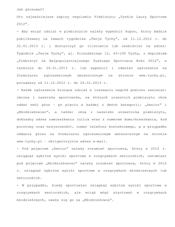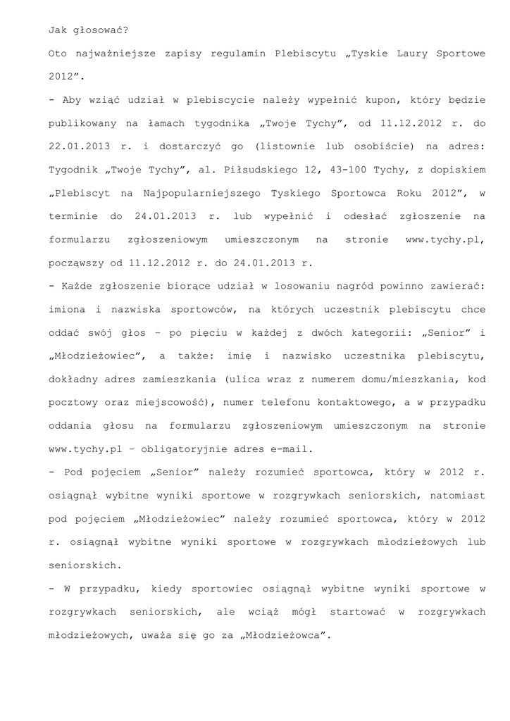 Jak głosować? Oto najważniejsze zapisy regulamin Plebiscytu „Tyskie Laury Sportowe 2012”. - Aby wziąć udział w plebiscycie należy wypełnić kupon, który będzie publikowany na łamach tygodnika „Twoje Tychy”, od 11.12.2012 r. do 22.01.2013 r. i dostarczyć go (listownie lub osobiście) na adres: Tygodnik „Twoje Tychy”, al. Piłsudskiego 12, 43-100 Tychy, z dopiskiem „Plebiscyt terminie na do formularzu Najpopularniejszego 24.01.2013 r. zgłoszeniowym lub Tyskiego wypełnić umieszczonym Sportowca i na odesłać Roku 2012”, zgłoszenie stronie w na www.tychy.pl, począwszy od 11.12.2012 r. do 24.01.2013 r. - Każde zgłoszenie biorące udział w losowaniu nagród powinno zawierać: imiona i nazwiska sportowców, na których uczestnik plebiscytu chce oddać swój głos – po pięciu w każdej z dwóch kategorii: „Senior” i „Młodzieżowiec”, a także: imię i nazwisko uczestnika plebiscytu, dokładny adres zamieszkania (ulica wraz z numerem domu/mieszkania, kod pocztowy oraz miejscowość), numer telefonu kontaktowego, a w przypadku oddania głosu na formularzu zgłoszeniowym umieszczonym na stronie www.tychy.pl – obligatoryjnie adres e-mail. - Pod pojęciem „Senior” należy rozumieć sportowca, który w 2012 r. osiągnął wybitne wyniki sportowe w rozgrywkach seniorskich, natomiast pod pojęciem „Młodzieżowiec” należy rozumieć sportowca, który w 2012 r. osiągnął wybitne wyniki sportowe w rozgrywkach młodzieżowych lub seniorskich. - W przypadku, kiedy sportowiec osiągnął wybitne wyniki sportowe w rozgrywkach seniorskich, ale wciąż mógł startować młodzieżowych, uważa się go za „Młodzieżowca”. w rozgrywkach - Uczestnik Plebiscytu może oddać swój głos na sportowców z listy nominowanych, która publikowana będzie w terminie od 11.12.2012 r. do 24.01.2013 r. internetowych: na łamach tygodnika www.mosir.tychy.pl i „Twoje Tychy” www.tychy.pl, jak oraz stronach również może zaproponować kandydaturę sportowca z poza listy. - Tylko kompletnie wypełnione zgłoszenie tzn. spełniające wymienione wyżej warunki będą uważane za ważne. - Jeden uczestnik plebiscytu może wypełnić i przysłać tylko jedno zgłoszenie. - Spośród uczestników plebiscytu, którzy dostarczą wypełnione zgłoszenia, zostaną rozlosowane nagrody. prawidłowo