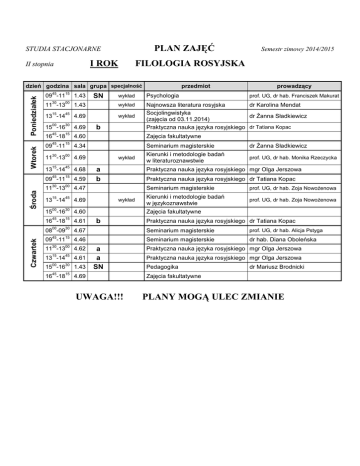 PLAN ZAJĘĆ STUDIA STACJONARNE I ROK II stopnia FILOLOGIA ROSYJSKA Czwartek Środa Wtorek Poniedziałek dzień godzina sala grupa specjalność 45 09 -11 15 1.43 30 11 -13 00 13 -14 15 SN Semestr zimowy 2014/2015 przedmiot prowadzący wykład Psychologia 1.43 wykład 45 4.69 wykład 15 -16 00 30 4.69 Najnowsza literatura rosyjska dr Karolina Mendat Socjolingwistyka dr Żanna Sładkiewicz (zajęcia od 03.11.2014) Praktyczna nauka języka rosyjskiego dr Tatiana Kopac 45 16 -18 15 4.60 Zajęcia fakultatywne 45 09 -11 15 4.34 Seminarium magisterskie dr Żanna Sładkiewicz 11 -13 30 00 4.69 Kierunki i metodologie badań w literaturoznawstwie prof. UG, dr hab. Monika Rzeczycka 13 -14 15 45 4.68 45 09 -11 15 4.59 30 11 -13 00 4.47 13 -14 15 45 4.69 15 -16 00 30 4.60 45 16 -18 15 4.61 00 08 -09 30 4.67 Seminarium magisterskie prof. UG, dr hab. Alicja Pstyga 45 09 -11 15 4.46 Seminarium magisterskie dr hab. Diana Oboleńska 30 11 -13 00 4.62 15 13 -14 45 4.61 00 15 -16 30 1.43 45 15 4.69 16 -18 b wykład a b prof. UG, dr hab. Franciszek Makurat Praktyczna nauka języka rosyjskiego mgr Olga Jerszowa Praktyczna nauka języka rosyjskiego dr Tatiana Kopac wykład Seminarium magisterskie prof. UG, dr hab. Zoja Nowożenowa Kierunki i metodologie badań w językoznawstwie prof. UG, dr hab. Zoja Nowożenowa Zajęcia fakultatywne b a a SN UWAGA!!! Praktyczna nauka języka rosyjskiego dr Tatiana Kopac Praktyczna nauka języka rosyjskiego mgr Olga Jerszowa Praktyczna nauka języka rosyjskiego mgr Olga Jerszowa Pedagogika dr Mariusz Brodnicki Zajęcia fakultatywne PLANY MOGĄ ULEC ZMIANIE PLAN ZAJĘĆ STUDIA STACJONARNE II ROK II stopnia dzień godzina FILOLOGIA ROSYJSKA sala grupa specjalność prowadzący Prawo oświatowe dr Anna Hau (zajęcia do 24.11.2014) Innowacje w leksyce współczesnego prof. UG, dr hab. Alicja Pstyga języka rosyjskiego (I i III tydzień) 00 30 4.69 09 -11 45 15 4.34 Seminarium magisterskie dr Żanna Sładkiewicz 45 09 -11 15 4.46 Seminarium magisterskie prof. UG, dr hab. Alicja Pstyga 45 09 -11 15 4.38 Seminarium magisterskie prof. UG, dr hab. Monika Rzeczycka 45 09 -11 15 4.47 Seminarium magisterskie prof. UG, dr hab. Zoja Nowożenowa 30 11 -13 00 4.62 Popkultura w komunikacji dr Żanna Sładkiewicz 15 13 -14 45 4.42 Seminarium magisterskie prof. UG, dr hab. Ludmiła Jankowska 00 15 -16 30 2.13 00 15 -16 30 4.61 00 08 -09 30 4.62 45 09 -11 15 4.67 a b b SN 09 -11 45 15 2007 WPiA SL 11 -13 30 00 1028 WPiA a 13 -14 15 45 4.60 15 45 4.61 SN ST Środa 08 -09 Czwartek SN przedmiot Piątek Pn. 1315-1445 4.60 Semestr zimowy 2014/2015 13 -14 SL UWAGA!!! Praktyczna nauka języka rosyjskiego dr Tatiana Kopac Praktyczna nauka języka rosyjskiego mgr Olga Jerszowa Praktyczna nauka języka rosyjskiego mgr Olga Jerszowa Metodyka nauczania języków obcych mgr Aneta Rejment Przekład tekstów medialnych i reklamowych mgr Kiriłł Dermanowski Praktyczna nauka języka rosyjskiego dr Tatiana Kopac Metodyka nauczania języków obcych dr Aleksandra Klimkiewicz Kontakty międzyjęzykowe dr hab. Katarzyna Wojan PLANY MOGĄ ULEC ZMIANIE