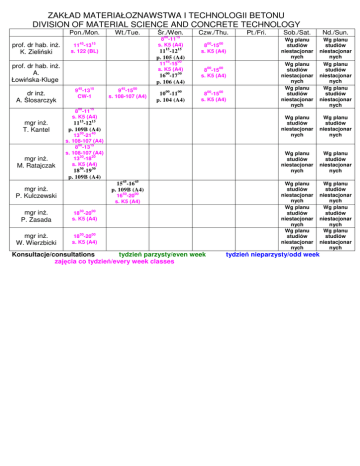 ZAKŁAD MATERIAŁOZNAWSTWA I TECHNOLOGII BETONU DIVISION OF MATERIAL SCIENCE AND CONCRETE TECHNOLOGY Pon./Mon. prof. dr hab. inż. K. Zieliński 45 Wt./Tue. 00 15 8 -11 s. K5 (A4) 15 11 -13 s. 122 (BL) 1115-1215 p. 105 (A4) 45 1600-1730 p. 106 (A4) 45 15 9 -13 CW-1 00 45 00 9 -15 s. 108-107 (A4) Czw./Thu. 1000-1100 p. 104 (A4) mgr inż. M. Ratajczak 13 -21 s. 108-107 (A4) 00 15 8 -13 s. 108-107 (A4) 30 20 13 -18 s. K5 (A4) 30 40 1830-1930 p. 109B (A4) 1545-1645 p. 109B (A4) mgr inż. P. Kulczewski 50 00 16 -20 s. K5 (A4) 30 00 30 00 mgr inż. P. Zasada 18 -20 s. K5 (A4) mgr inż. W. Wierzbicki 18 -20 s. K5 (A4) 00 00 00 00 8 -15 s. K5 (A4) 15 1115-1215 p. 109B (A4) 00 8 -15 s. K5 (A4) 8 -11 s. K5 (A4) mgr inż. T. Kantel 00 8 -15 s. K5 (A4) 00 11 -15 s. K5 (A4) prof. dr hab. inż. A. Łowińska-Kluge dr inż. A. Ślosarczyk Śr./Wen. Konsultacje/consultations tydzień parzysty/even week zajęcia co tydzień/every week classes Pt./Fri. Sob./Sat. Nd./Sun. Wg planu studiów niestacjonar nych Wg planu studiów niestacjonar nych Wg planu studiów niestacjonar nych Wg planu studiów niestacjonar nych Wg planu studiów niestacjonar nych Wg planu studiów niestacjonar nych Wg planu studiów niestacjonar nych Wg planu studiów niestacjonar nych Wg planu studiów niestacjonar nych Wg planu studiów niestacjonar nych Wg planu studiów niestacjonar nych Wg planu studiów niestacjonar nych Wg planu studiów niestacjonar nych Wg planu studiów niestacjonar nych Wg planu studiów niestacjonar nych Wg planu studiów niestacjonar nych tydzień nieparzysty/odd week