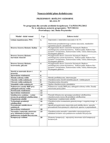 Nauczycielski plan dydaktyczny PRZEDMIOT: ROŚLINY OZDOBNE KLASA IV Nr programu dla zawodu architekt krajobrazu: TA/PZS1/PG/2012 Nr w szkolnym zestawie programów: 70/T/2012/4 Prowadzący: inż. Ilona Przytarska Moduł - dział -temat Lekcja organizacyjna. PSO. L.p. 1. Drzewa i krzewy liściaste: Kalina 2 Drzewa i krzewy liściaste: barwinek winorośl 3 Drzewa i krzewy liściaste: krzewuszka, glicynia 4 Stawki za usuwanie drzew i krzewów Sprawdzian wiadomości Metody ochrony roślin Choroby roślin ozdobnych Chwasty roślin ozdobnych Szkodniki roślin ozdobnych Podstawowe zasady BHP przy zabiegach ochrony roślin Powtórzenie wiadomości Sprawdzian wiadomości Szkółkarstwo ozdobne – wybór terenu do produkcji szkółkarskiej Organizacja szkółki Technologia produkcji szkółkarskiej Prowadzenie szkółki drzew ozdobnych Sprawdzian wiadomości Narzędzia i materiały stosowane przy układaniu kwiatów oraz podstawowe techniki florystyczne Kompozycje roślinne 5 6 7 8 9 10 11 12 13 14 15 16 17 18 19 20 Zakres treści Zapoznanie z materiałem nauczania w kl. IV, Omówienie przedmiotowego systemu nauczania, standardów egzaminacyjnych z przedmiotu Występowanie drzew i krzewów liściastych. Budowa morfologiczna system korzeniowy, budowa pędu, budowa liści kwiatów i kwiatostanu, Zastosowanie roślin, walory dekoracyjne, Wymaganie glebowe Występowanie drzew i krzewów liściastych. Budowa morfologiczna system korzeniowy, budowa pędu, budowa liści kwiatów i kwiatostanu, Zastosowanie roślin, walory dekoracyjne, Wymaganie glebowe Występowanie drzew i krzewów liściastych. Budowa morfologiczna system korzeniowy, budowa pędu, budowa liści kwiatów i kwiatostanu, Zastosowanie roślin, walory dekoracyjne, Wymaganie glebowe Metody profilaktyczne, interwencyjne Charakterystyka chorób nieinfekcyjnych i infekcyjnych Charakterystyka chwastów Ogólna charakterystyka szkodników Podstawowe zasady BHP przy zabiegach ochrony roślin. Zasady stosowania pestycydów Warunki klimatyczne sprzyjające produkcji szkółkarskiej, charakterystyka terenu dla produkcji szkółkarskiej Organizacja i rozplanowanie szkółki Charakterystyka rozmnażania generatywnego i wegetatywnego w szkółce Sposób przygotowania stanowiska pod szkółkę drzew, sposoby prowadzenia form piennych i alejowych, uprawa w pojemnikach Charakterystyka narzędzi i materiałów stosowanych przy układaniu kwiatów oraz podstawowe techniki florystyczne Elementy kompozycji, najczęściej stosowane style kompozycji kwiatowych Moduł - dział -temat L.p. Zakres treści Zasady postępowania z materiałem roślinnym 21 Zasady postępowania z materiałem roślinnym oraz czynniki wpływające na trwałość kwiatów ciętych Kwiaty i zieleń cięta stosowana we florystyce 22 Charakterystyka kwiatów i zieleni stosowanej we florystyce Kompozycje z kwiatów ciętych 23 Rodzaje kompozycji Pojemniki do uprawy roślin projekt 24 Charakterystyka pojemników Dekoracje roślinne 25 Podział roślin polecanych do rożnych wnętrz oraz zasady ich komponowania Dekoracje okolicznościowe 26 Rodzaje dekoracji Elementy architektoniczne możliwe do zagospodarowania roślinnością 27 Balkony, tarasy i inne elementy architektoniczne możliwe do zagospodarowania roślinnością Aranżacje roślinne przy ścianach budynków 28 Ogólne zasady kompozycji i możliwości aranżacji roślinnych przy ścianach budynków Sprawdzian wiadomości 29 Powtórzenie i usystematyzowanie wiadomości z roślin ozdobnych 30