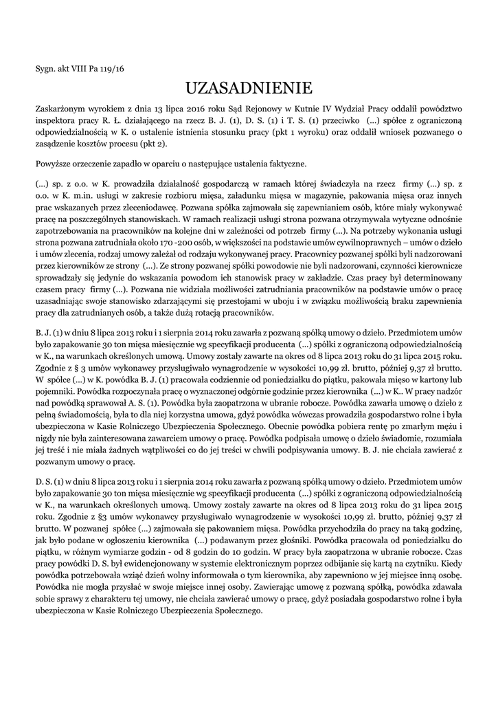 Sygn. akt VIII Pa 119/16 UZASADNIENIE Zaskarżonym wyrokiem z dnia 13 lipca 2016 roku Sąd Rejonowy w Kutnie IV Wydział Pracy oddalił powództwo inspektora pracy R. Ł. działającego na rzecz B. J. (1), D. S. (1) i T. S. (1) przeciwko (...) spółce z ograniczoną odpowiedzialnością w K. o ustalenie istnienia stosunku pracy (pkt 1 wyroku) oraz oddalił wniosek pozwanego o zasądzenie kosztów procesu (pkt 2). Powyższe orzeczenie zapadło w oparciu o następujące ustalenia faktyczne. (...) sp. z o.o. w K. prowadziła działalność gospodarczą w ramach której świadczyła na rzecz firmy (...) sp. z o.o. w K. m.in. usługi w zakresie rozbioru mięsa, załadunku mięsa w magazynie, pakowania mięsa oraz innych prac wskazanych przez zleceniodawcę. Pozwana spółka zajmowała się zapewnianiem osób, które miały wykonywać pracę na poszczególnych stanowiskach. W ramach realizacji usługi strona pozwana otrzymywała wytyczne odnośnie zapotrzebowania na pracowników na kolejne dni w zależności od potrzeb firmy (...). Na potrzeby wykonania usługi strona pozwana zatrudniała około 170 -200 osób, w większości na podstawie umów cywilnoprawnych – umów o dzieło i umów zlecenia, rodzaj umowy zależał od rodzaju wykonywanej pracy. Pracownicy pozwanej spółki byli nadzorowani przez kierowników ze strony (...). Ze strony pozwanej spółki powodowie nie byli nadzorowani, czynności kierownicze sprowadzały się jedynie do wskazania powodom ich stanowisk pracy w zakładzie. Czas pracy był determinowany czasem pracy firmy (...). Pozwana nie widziała możliwości zatrudniania pracowników na podstawie umów o pracę uzasadniając swoje stanowisko zdarzającymi się przestojami w uboju i w związku możliwością braku zapewnienia pracy dla zatrudnianych osób, a także dużą rotacją pracowników. B. J. (1) w dniu 8 lipca 2013 roku i 1 sierpnia 2014 roku zawarła z pozwaną spółką umowy o dzieło. Przedmiotem umów było zapakowanie 30 ton mięsa miesięcznie wg specyfikacji producenta (...) spółki z ograniczoną odpowiedzialnością w K., na warunkach określonych umową. Umowy zostały zawarte na okres od 8 lipca 2013 roku do 31 lipca 2015 roku. Zgodnie z § 3 umów wykonawcy przysługiwało wynagrodzenie w wysokości 10,99 zł. brutto, później 9,37 zł brutto. W spółce (...) w K. powódka B. J. (1) pracowała codziennie od poniedziałku do piątku, pakowała mięso w kartony lub pojemniki. Powódka rozpoczynała pracę o wyznaczonej odgórnie godzinie przez kierownika (...) w K.. W pracy nadzór nad powódką sprawował A. S. (1). Powódka była zaopatrzona w ubranie robocze. Powódka zawarła umowę o dzieło z pełną świadomością, była to dla niej korzystna umowa, gdyż powódka wówczas prowadziła gospodarstwo rolne i była ubezpieczona w Kasie Rolniczego Ubezpieczenia Społecznego. Obecnie powódka pobiera rentę po zmarłym mężu i nigdy nie była zainteresowana zawarciem umowy o pracę. Powódka podpisała umowę o dzieło świadomie, rozumiała jej treść i nie miała żadnych wątpliwości co do jej treści w chwili podpisywania umowy. B. J. nie chciała zawierać z pozwanym umowy o pracę. D. S. (1) w dniu 8 lipca 2013 roku i 1 sierpnia 2014 roku zawarła z pozwaną spółką umowy o dzieło. Przedmiotem umów było zapakowanie 30 ton mięsa miesięcznie wg specyfikacji producenta (...) spółki z ograniczoną odpowiedzialnością w K., na warunkach określonych umową. Umowy zostały zawarte na okres od 8 lipca 2013 roku do 31 lipca 2015 roku. Zgodnie z §3 umów wykonawcy przysługiwało wynagrodzenie w wysokości 10,99 zł. brutto, później 9,37 zł brutto. W pozwanej spółce (...) zajmowała się pakowaniem mięsa. Powódka przychodziła do pracy na taką godzinę, jak było podane w ogłoszeniu kierownika (...) podawanym przez głośniki. Powódka pracowała od poniedziałku do piątku, w różnym wymiarze godzin - od 8 godzin do 10 godzin. W pracy była zaopatrzona w ubranie robocze. Czas pracy powódki D. S. był ewidencjonowany w systemie elektronicznym poprzez odbijanie się kartą na czytniku. Kiedy powódka potrzebowała wziąć dzień wolny informowała o tym kierownika, aby zapewniono w jej miejsce inną osobę. Powódka nie mogła przysłać w swoje miejsce innej osoby. Zawierając umowę z pozwaną spółką, powódka zdawała sobie sprawy z charakteru tej umowy, nie chciała zawierać umowy o pracę, gdyż posiadała gospodarstwo rolne i była ubezpieczona w Kasie Rolniczego Ubezpieczenia Społecznego. T. S. (1) w dniu 8 lipca 2013 roku i 1 sierpnia 2014 roku zawarł z pozwaną spółką umowy o dzieło. Przedmiotem umów było zapakowanie 30 ton mięsa miesięcznie wg specyfikacji producenta (...) spółki z ograniczoną odpowiedzialnością w K., na warunkach określonych umową. Umowy zostały zawarte na okres od 8 lipca 2013 roku do 31 lipca 2015 roku. Zgodnie z §3 umów wykonawcy przysługiwało wynagrodzenie w wysokości 10,99 zł. brutto, później 9,37 zł brutto. T. S. (1) pracował w pozwanej spółce przy załadunku mięsa na kontenery, świadczył pracę od poniedziałku do piątku, od 8 do 15 godzin w zależności od ilości pracy. Godzina rozpoczęcia pracy była ogłaszana przez kierownika (...), czas pracy był zdeterminowany ilością pracy w zakładzie (...) i był ewidencjonowany w systemie elektronicznym. W przypadku nieobecności w pracy T. S. nie mógł przysłać nikogo na swoje zastępstwo, kiedy nie przychodził do pracy nie otrzymywał za to wynagrodzenia. T. S. świadomie podpisał umowę o dzieło, gdyż taka umowa była dla niego korzystna, miał gospodarstwo rolne i był ubezpieczony w Kasie Rolniczego Ubezpieczenia Społecznego, stąd nie był zainteresowany zawarciem stosunku pracy. S. W. pracował w firmie (...) na terenie zakładu (...), jest podporządkowany poleceniom kierownika z firmy (...) w K. A. S.. Czas pracy pracowników zależy od ilości pracy w danym dniu, ustalone jest to odgórnie