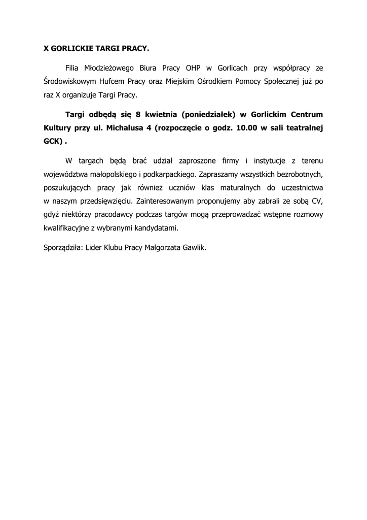 X GORLICKIE TARGI PRACY. Filia Młodzieżowego Biura Pracy OHP w Gorlicach przy współpracy ze Środowiskowym Hufcem Pracy oraz Miejskim Ośrodkiem Pomocy Społecznej już po raz X organizuje Targi Pracy. Targi odbędą się 8 kwietnia (poniedziałek) w Gorlickim Centrum Kultury przy ul. Michalusa 4 (rozpoczęcie o godz. 10.00 w sali teatralnej GCK) . W targach będą brać udział zaproszone firmy i instytucje z terenu województwa małopolskiego i podkarpackiego. Zapraszamy wszystkich bezrobotnych, poszukujących pracy jak również uczniów klas maturalnych do uczestnictwa w naszym przedsięwzięciu. Zainteresowanym proponujemy aby zabrali ze sobą CV, gdyż niektórzy pracodawcy podczas targów mogą przeprowadzać wstępne rozmowy kwalifikacyjne z wybranymi kandydatami. Sporządziła: Lider Klubu Pracy Małgorzata Gawlik.