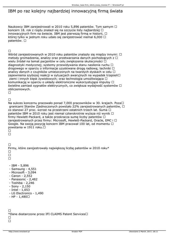 Wrocław, baza firm, oferty pracy, branża IT :: WroclawIT.pl IBM po raz kolejny najbardziej innowacyjną firmą świata Naukowcy IBM zarejestrowali w 2010 roku 5,896 patentów. Tym samym koncern 18. rok z rzędu znalazł się na szczycie listy najbardziej innowacyjnych firm na świecie. IBM jest pierwszą firmą w historii, której tylko w jednym roku udało się zarejestrować niemal 6,000 patentów. Wśród zarejestrowanych w 2010 roku patentów znalazły się między innymi: metody gromadzenia, analizy oraz przetwarzania danych pochodzących z wielu źródeł na temat pacjentów w celu zwiększenia skuteczności diagnostyki medycznej; systemy przewidywania stanu nasilenia ruchu drogowego w oparciu o informacje uzyskiwane drogą radiową; techniki analizy danych z czujników umieszczonych na twardych dyskach w celu zapewnienia szybszej reakcji w sytuacjach awaryjnych na wypadek trzęsień ziemi i innych klęsk żywiołowych; oraz technologia umożliwiająca komunikację w oparciu o układy elektroniczne wykorzystujące impulsy świetlne zamiast sygnałów elektrycznych, co zwiększa wydajność systemów obliczeniowych. Na sukces koncernu pracowało ponad 7,000 pracowników w 30. krajach. Poza granicami Stanów Zjednoczonych powstało 22% zarejestrowanych patentów, co stanowi 27 proc. wzrost na przestrzeni ostatnich trzech lat. Suma patentów IBM w 2010 roku jest niemal czterokrotnie wyższa niż wynik firmy Hewlett-Packard, a także przekracza sumę liczby patentów zarejestrowanych przez firmy: Microsoft, Hewlett-Packard, Oracle, EMC i Google. Na swoją pozycję koncern IBM pracował 100 lat, od momentu powstania w 1911 roku. Firmy, które zarejestrowały największą liczbę patentów w 2010 roku* - IBM - 5,896 Samsung - 4,551 Microsoft - 3,094 Canon - 2,552 Panasonic - 2,482 Toshiba - 2,246 Sony - 2,150 Intel - 1,653 LG Electronics - 1,490 HP - 1,480 *Dane dostarczone przez IFI CLAIMS Patent Services http://www.wroclawit.pl Kreator PDF Utworzono 2 March, 2017, 18:11 Wrocław, baza firm, oferty pracy, branża IT :: WroclawIT.pl Już od stu lat tworzenie nowych patentów stanowi ważny element strategii biznesowej IBM, skupiającej się na dostarczaniu inteligentnych rozwiązań i technologii usprawniających działalność biznesową naszych klientów. powiedziała Anna Sieńko, Dyrektor Generalna, IBM Polska. Od czasu kiedy IBM uzyskał pierwszy patent w 1911 roku za wynalazek związany z tabelarycznymi kartami perforowanymi aż do 2010 roku, firma nieprzerwanie realizuje zrównoważoną i zróżnicowaną strategię w obszarze tworzenia własności intelektualnej, którą można przekuć na rzeczywiste rozwiązania IT. Obecnie IBM przeznacza około 6 mld USD rocznie na cele badawczo-rozwojowe. Kilka najbardziej interesujących innowacji IBM w 2010 roku: - U.S. Patent 7,761,440: Produkty obejmujące metody, systemy i programy komputerowe do syntetyzowania diagnoz w bazach danych służby zdrowia - to opatentowane rozwiązanie zwiększa standardy analizy danych medycznych, aby stworzyć inteligentny system opieki zdrowotnej. Patent 7,761, 440 otrzymali wynalazcy IBM: Tony Chow, Robert Friedlander, Richard Hennessy i Anwer Kahn. - U.S. Patent 7,760,112: Systemy i metody oparte na komunikacji radiowej o krótkim zasięgu, w celu informowania kierowców o zwiększonym natężeniu ruchu drogowego - to rozwiązanie przewiduje warunki ruchu drogowego w oparciu o informację wymienianą pomiędzy pojazdami drogą radiową o krótkim zasięgu. Patent 7,760,112 otrzymali naukowcy IBM: Frederic Bauchot i Gerard Marmigere. - U.S. Patent 7,693,663: Systemy i metody wykrywania trzęsień ziemi i tsunami łączące się z systemami wczesnego ostrzegania - patent ten opisuje technikę gromadzenia i analizy danych z czujników dysków twardych w celu precyzyjnej analizy po wystąpieniu ruchów sejsmicznych, takich jak trzęsienia ziemi, które mogą przyczynić się do skutecznej reakcji na sytuacje awaryjne w oparciu o dane zebrane po wystąpieniu klęski żywiołowej. Patent 7,693,663 otrzymali naukowcy IBM: Robert Friedlander i James Kraemer. - U.S. Patent 7,790,495: Urządzenie optoelektroniczne z fotodetektorem germanu - Wynalazek ten jest kompatybilny z technologią chipową CMOS Integrated Silicon Nanophotonics wprowadzoną przez IBM w listopadzie 2010 r. Technologia ta integruje elektryczne i optyczne urządzenia na jednym elemencie krzemowym umożliwiając układom elektronicznym komunikację za pośrednictwem impulsów świetlnych (zamiast sygnałów elektrycznych) i jest ukoronowaniem 10 lat badań w laboratoriach IBM na całym świecie. Patent 7,790,495 został przyznany następującym osobom: Solomon Assefa, Waleter Bedell, Yurii Vlasov i Fengnian Xia. http://www.wroclawit.pl Kreator PDF Utworzono 2 March, 2017, 18:11