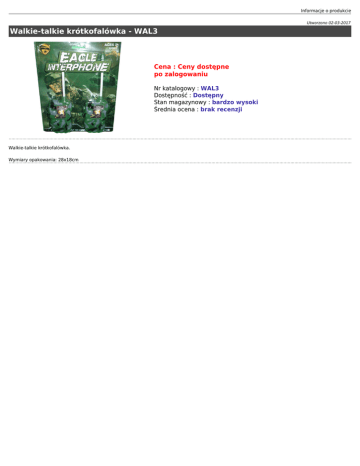 Informacje o produkcie Utworzono 02-03-2017 Walkie-talkie krótkofalówka - WAL3 Cena : Ceny dostępne po zalogowaniu Nr katalogowy : WAL3 Dostępność : Dostępny Stan magazynowy : bardzo wysoki Średnia ocena : brak recenzji Walkie-talkie krótkofalówka. Wymiary opakowania: 28x18cm
