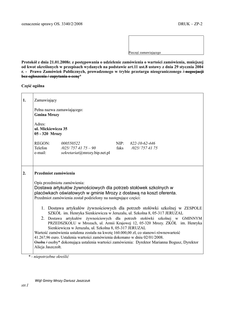 oznaczenie sprawy OS. 3340/2/2008 DRUK – ZP-2 Pieczęć zamawiającego Protokół z dnia 21.01.2008r. z postępowania o udzielenie zamówienia o wartości zamówienia, mniejszej od kwot określonych w przepisach wydanych na podstawie art.11 ust.8 ustawy z dnia 29 stycznia 2004 r. - Prawo Zamówień Publicznych, prowadzonego w trybie przetargu nieograniczonego / negocjacji bez ogłoszenia / zapytania o cenę* Część ogólna 1. Zamawiający Pełna nazwa zamawiającego: Gmina Mrozy Adres: ul. Mickiewicza 35 05 - 320 Mrozy REGON: Telefon e-mail: 2. 000550522 /025/ 757 41 75 – 90 [email protected] NIP: faks 822-10-62-446 /025/ 757 41 75 Przedmiot zamówienia Opis przedmiotu zamówienia: Dostawa artykułów żywnościowych dla potrzeb stołówek szkolnych w placówkach oświatowych w gminie Mrozy z dostawą na koszt oferenta. Przedmiot zamówienia został podzielony na następujące części: 1. Dostawa artykułów żywnościowych dla potrzeb stołówki szkolnej w ZESPOLE SZKÓŁ im. Henryka Sienkiewicza w Jeruzalu, ul. Szkolna 8, 05-317 JERUZAL 2. Dostawa artykułów żywnościowych dla potrzeb stołówki szkolnej w GMINNYM PRZEDSZKOLU w Mrozach, ul. Armii Krajowej 12, 05-320 Mrozy. ZKÓŁ im. Henryka Sienkiewicza w Jeruzalu, ul. Szkolna 8, 05-317 JERUZAL Wartość zamówienia ustalona została na kwotę 160.000,00 zł, co stanowi równowartość 41.267,96 euro. Ustalenia wartości zamówienia dokonano w dniu 02/01/2008. Osoba / osoby* dokonująca ustalenia wartości zamówienia: Dyrektor Marianna Bogusz, Dyrektor Alicja Jaszczołt. * - niepotrzebne skreślić Wójt Gminy Mrozy Dariusz Jaszczuk str.1 oznaczenie sprawy OS. 3340/2/2008 3. Tryb postępowania 1.Postępowanie prowadzono w trybie: przetargu nieograniczonego na podstawie art. 39 ustawy z dnia 29 stycznia 2004 r. - Prawo zamówień publicznych. Powody zastosowania trybu innego niż przetarg nieograniczony lub przetarg ograniczony (podać uzasadnienie faktyczne i prawne): ................................................................................................................................................................ ................................................................................................................................................................. ................................................................................................................................................................. ............................................................................................................................................................. (podać formę i numer rozstrzygnięcia oraz nazwę organu uprawnionego do rozstrzygnięcia o wszczęciu postępowania o udzielenie zamówienia na zasadach szczególnych, jeżeli dotyczy) 2. Postępowanie prowadzone w celu zawarcia umowy ramowej/ustanowienia dynamiczngo systemu zakupów* z odpowiednim stosowaniem przepisów dotyczących trybu:................................................ ................................................................................................................................................................. ................................................................................................................................................................. * - niepotrzebne skreślić Wójt Gminy Mrozy Dariusz Jaszczuk str. 2 oznaczenie sprawy OS. 3340/2/2008 DRUK – ZP- 2/PN Protokół z dnia 21.01.2008r. z postępowania o udzielenie zamówienia o wartości zamówienia, mniejszej od kwot określonych w przepisach wydanych na podstawie art.11 ust.8 ustawy z dnia 29 stycznia 2004 r. - Prawo Zamówień Publicznych, prowadzonego w trybie przetargu nieograniczonego / negocjacji bez ogłoszenia / zapytania o cenę* Część szczegółowa Termin składania ofert 5. Termin składania ofert upłynął w dniu 21/01/2008 o godz. 10,00 Otwarcie ofert 6. 1. Otwarcie ofert odbyło się w dniu 21/01/2008 o godz. 10,30 w: Urząd Gminy w Mrozach – sala konferencyjna adres: 05-320 Mrozy ul. Mickiewicza 35 2. Do upływu terminu składania ofert złożono 1 ofert, których zbiorcze zestawienie stanowi załączony druk ZP-12. 3. Bezpośrednio przed otwarciem ofert zamawiający podał kwotę, jaką zamierza przeznaczyć na finansowanie zamówienia, w wysokości 160.000,00 zł. Informacja o spełnianiu warunków udziału w postępowaniu 7. Wymagane warunki udziału w postępowaniu spełnia 1 wykonawca. Wykonawcy wykluczeni 8. Z postępowania wykluczono 0 wykonawców. Listę wykluczonych wykonawców wraz z podaniem uzasadnienia wykluczenia stanowi załączony druk ZP-18. Oferty odrzucone 9. Odrzucono 0 ofert. Listę ofert odrzuconych wraz z podaniem uzasadnienia odrzucenia stanowi załączony druk ZP-19. *- niepotrzebne skreślić Wójt Gminy Mrozy Dariusz Jaszczuk str. 3 oznaczenie sprawy OS. 3340/2/2008 10. Oferta najkorzystniejsza Na podstawie streszczenia oceny i porównania złożonych ofert, dokonanego na załączonym druku ZP-21 wybrano ofertę: numer oferty 01 firma (nazwa) SKLEP SPOŻYWCZY Bożena Szeląg adres 05-320 Mrozy, ul. Armii Krajowej 2 Złożona oferta jest ofertą częściową i obejmuje: 1.Dostawa artykułów żywnościowych dla potrzeb stołówki szkolnej w ZESPOLE SZKÓŁ im. Henryka Sienkiewicza w Jeruzalu, ul. Szkolna 8, 05-317 JERUZAL Uzasadnienie: Firma: SKLEP SPOŻYWCZY Bożena Szeląg, 05-320 Mrozy, ul. Armii Krajowej 2, zaoferowała najniższą cenę i otrzymała najwyższą ilość punktów w/g punktowej oceny ofert zawartej w § 16 Specyfikacji Istotnych Warunków Zamówienia. 11. Protesty i odwołania – nie dotyczy na tym etapie postępowania. W trakcie postępowania nie wniesiono żadnego protestu / wniesiono protest(y) lub odwołanie(a)* i wydano rozstrzygnięcie(a), o którym(ch) informacja zawarta jest na załączonym druku ZP-19. * - niepotrzebne skreślić Wójt Gminy Mrozy Dariusz Jaszczuk str. 4