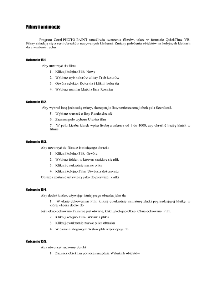 Filmy i animacje Program Corel PHOTO-PAINT umożliwia tworzenie filmów, także w formacie QuickTime VR. Filmy składają się z serii obrazków nazywanych klatkami. Zmiany położenia obiektów na kolejnych klatkach dają wrażenie ruchu. Ćwiczenie 15.1. Aby utworzyć tło filmu 1. Kliknij kolejno Plik Nowy 2. Wybierz tryb kolorów z listy Tryb kolorów 3. Otwórz selektor Kolor tła i kliknij kolor tła 4. Wybierz rozmiar klatki z listy Rozmiar Ćwiczenie 15.2. Aby wybrać inną jednostkę miary, skorzystaj z listy umieszczonej obok pola Szerokość. 5. Wybierz wartość z listy Rozdzielczość 6. Zaznacz pole wyboru Utwórz film 7. W polu Liczba klatek wpisz liczbę z zakresu od 1 do 1000, aby określić liczbę klatek w filmie Ćwiczenie 15.3. Aby utworzyć tło filmu z istniejącego obrazka 1. Kliknij kolejno Plik Otwórz 2. Wybierz folder, w którym znajduje się plik 3. Kliknij dwukrotnie nazwę pliku 4. Kliknij kolejno Film Utwórz z dokumentu Obrazek zostanie ustawiony jako tło pierwszej klatki Ćwiczenie 15.4. Aby dodać klatkę, używając istniejącego obrazka jako tła 1. W oknie dokowanym Film kliknij dwukrotnie miniaturę klatki poprzedzającej klatkę, w której chcesz dodać tło Jeśli okno dokowane Film nie jest otwarte, kliknij kolejno Okno Okna dokowane Film. 2. Kliknij kolejno Film Wstaw z pliku 3. Kliknij dwukrotnie nazwę pliku obrazka 4. W oknie dialogowym Wstaw plik włącz opcję Po Ćwiczenie 15.5. Aby utworzyć ruchomy obiekt 1. Zaznacz obiekt za pomocą narzędzia Wskaźnik obiektów 2. Kliknij kolejno Edycja Kopiuj 3. Kliknij kolejno Obiekt Połącz Połącz obiekty z tłem 4. Kliknij kolejno Okno Okna dokowane Film 5. W oknie dokowanym Film kliknij przycisk Następna klatka Ćwiczenie 15.6. Aby dodać klatkę, w oknie dokowanym Film kliknij przycisk Wstaw klatkę . 6. Kliknij kolejno Edycja Wklej Wklej jako obiekt 7. Ustal położenie obiektu w bieżącej klatce 8. Kliknij kolejno Obiekt Połącz Połącz obiekty z tłem. Ćwiczenie 15.7. Aby zapisać film 1. Kliknij kolejno Plik Zapisz jako 2. Wybierz folder, w którym chcesz zapisać plik 3. Z listy Zapisz jako typ wybierz jedną z następujących pozycji: • AVI - Klip wideo dla Windows • MOV - Klip wideo - Quick Time • MOV - Plik wirtualnej rzeczywistości Quick Time VR 4. Wpisz nazwę pliku w polu Nazwa pliku i kliknij przycisk Zapisz • Aby utworzyć animowany plik GIF do opublikowania na stronie WWW, wybierz z listy Tryb koloru tryb Z paletą (8 bitów). Dzięki temu powstanie plik o mniejszym rozmiarze Ćwiczenie 15.8. Aby zapisać film w formacie animowanego pliku GIF 1. Kliknij kolejno Plik Zapisz jako 2. Wybierz folder, w którym chcesz zapisać plik 3. W polu listy Nazwa pliku wpisz nazwę 4. Wybierz pozycję Animowany GIF z listy Zapisz jako typ i kliknij przycisk Zapisz 5. W oknie dialogowym Przekształć w obrazek z paletą dopasuj paletę koloru 8-bitowego i kliknij OK 6. W oknie dialogowym Opcje animacji GIF 89 kliknij kartę Ustawienia klatki 7. Włącz jedną z poniższych opcji w obszarze Paleta: • Użyj globalnej — powoduje użycie tej samej palety kolorów dla wszystkich klatek • Użyj lokalnej — umożliwia użycie różnych palet kolorów dla poszczególnych klatek 8. W polu Opóźnienie klatki wpisz wartość określającą czas między wyświetlaniem kolejnych klatek 9. Kliknij jeden z następujących przycisków: • Zastosuj tylko zmienione — powoduje zastosowanie tylko tych parametrów klatki, które uległy zmianie • Zastosuj wszystko — powoduje zastosowanie wszystkich ustawień klatki Ćwiczenie 15.9. Aby otworzyć film 1. Kliknij kolejno Plik Otwórz 2. Wybierz folder, w którym znajduje się film 3. Kliknij nazwę pliku 4. Z listy Pliki typu wybierz jedną z następujących pozycji: • Cały obrazek • Załaduj częściowo Po wybraniu opcji Załaduj częściowo w polach Od i Do w oknie dialogowym Częściowe ładowanie filmu wpisz wartości określające zakres klatek, który chcesz otworzyć.