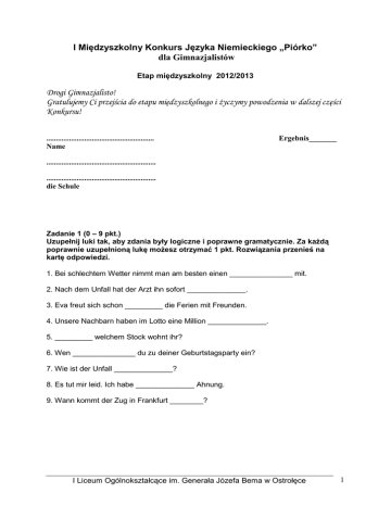 I Międzyszkolny Konkurs Języka Niemieckiego „Piórko” dla Gimnazjalistów Etap międzyszkolny 2012/2013 Drogi Gimnazjalisto! Gratulujemy Ci przejścia do etapu międzyszkolnego i życzymy powodzenia w dalszej części Konkursu! ......................................................... Name Ergebnis_______ .......................................................... .......................................................... die Schule Zadanie 1 (0 – 9 pkt.) Uzupełnij luki tak, aby zdania były logiczne i poprawne gramatycznie. Za każdą poprawnie uzupełnioną lukę możesz otrzymać 1 pkt. Rozwiązania przenieś na kartę odpowiedzi. 1. Bei schlechtem Wetter nimmt man am besten einen _______________ mit. 2. Nach dem Unfall hat der Arzt ihn sofort ______________. 3. Eva freut sich schon _________ die Ferien mit Freunden. 4. Unsere Nachbarn haben im Lotto eine Million ______________. 5. _________ welchem Stock wohnt ihr? 6. Wen _______________ du zu deiner Geburtstagsparty ein? 7. Wie ist der Unfall ______________? 8. Es tut mir leid. Ich habe ______________ Ahnung. 9. Wann kommt der Zug in Frankfurt ________? I Liceum Ogólnokształcące im. Generała Józefa Bema w Ostrołęce 1 Zadanie 2. (0 – 6 pkt.) Połącz pytania lub stwierdzenia z pasującymi do nich reakcjami. Za każde poprawne rozwiązanie otrzymasz 1 punkt. Rozwiązania przenieś na kartę odpowiedzi. 1. 2. 3. 4. 5. 6. Maria findet die neue Schülerin A unsympathisch. Und du? Ich kann Joachim nicht finden. Hast du B. eine Ahnung, wo er ist? Kennst du ihn persönlich? C. D. Warum kommst du so spät nach Hause? E. Passen dir die Schuhe? Wollen Sie nicht Ihren Mantel ablegen? F. 1 2 3 Nein, wir haben nur miteinander telefoniert. Ich habe in der Stadt einen alten Freund getroffen. Nein danke, ich muss gleich wieder gehen. Ich mag sie auch nicht. Ich habe sie noch nicht anprobiert. Es ist denkbar, dass er schon nach Hause gegangen ist. 4 5 6 Zadanie 3. (0 – 8 pkt.) Uzupełnij luki w tekście zakreślając jedną z podanych możliwości (A, B lub C). Zaznacz rozwiązanie. Za każde poprawne rozwiązanie otrzymasz 1 punkt. Rozwiązania przenieś na kartę odpowiedzi. Elena hat heute Nachmittag in der Stadt (1.) ____________Einkaufsbummel gemacht. Zuerst hat sie eine rote Hose anprobiert. Die rote Hose war aber zu klein. Die Verkäuferin hat ihr auch eine Winterjacke gezeigt. Die hat Elena aber gar nicht gut (2.) ___________. Sie hat sie also nicht genommen. In ihrem Lieblingsgeschäft hat sie einen (3.) ________ Pullover gesehen. Aber er war viel zu groß. (4.) __________ hat sie eine schwarze Jeans anprobiert. Leider war die Hose in (5.) __________ 28 zu klein. Eine größere hatte das Geschäft nur noch (6.) __________ Weiß. Das findet Elena für den Winter zu hell. Endlich hat Elena eine schicke Jacke gefunden. Diese war aber sehr (7.) ___________, sie hat 350 Euro gekostet! Elena hat nichts gekauft und ist unzufrieden wieder (8.) __________ Hause gegangen. A einem gesehen tolle Danach Höhe in kostenlos nach 1 2 3 4 5 6 7 8 1 2 3 B einen getragen tolles Zuerst Größe in der nett zu 4 5 C einer gefallen tollen Damit Modell im teuer in 6 7 8 I Liceum Ogólnokształcące im. Generała Józefa Bema w Ostrołęce 2 Zadanie 4. (0 – 5 pkt.) Połącz pasujące do siebie wyrażenia(1 - 5) i czasowniki (A - H). Trzy czasowniki są zbędne i nie pasują do żadnego wyrażenia. Za każde poprawne przyporządkowanie otrzymasz 1 punkt. Rozwiązania przenieś na kartę odpowiedzi. 1. 2. 3. 4. 5. 1 E-Mails Sport den Geburtstag den Zug um 8 Uhr nachmittags Freunde 2 3 4 A. B. C. D. E. F. G. H. üben besuchen nehmen zahlen treiben verschicken feiern spielen 5 Zadanie 5. (0 – 10 pkt.) Które uzupełnienie lub dokończenie zdania pasuje? Wybierz jedną z trzech podanych możliwości (A, B lub C). Rozwiązanie wpisz do tabeli. Za każde poprawne rozwiązanie otrzymasz 1 punkt. 1. Der Lehrer zeigt ______________ einen Film. A. der Schüler B. den Schülern C. die Schüler 2. Der Opa schenkt _____________ein Fahrrad. A. ihm B. ihn C. es 3. Was kann der Onkel nicht finden? - _________ Brille. A. Ihre B. Dein C. Seine 4. Meine Katze ist jung, aber deine ist noch ___________. A. jünger B. jung C. am jüngsten 5. Du bist erkältet. Gehst du heute __________ Arzt? A. auf B. nach C. zum I Liceum Ogólnokształcące im. Generała Józefa Bema w Ostrołęce 3 6. A. B. C. Kinder, __________ euch die Hände vor dem Essen. wasch wascht wäscht 7. A. B. C. Lars kommt heute nicht, __________ er hatte einen Unfall. weil deshalb denn 8. A. B. C. Wir müssen ___________ unbedingt treffen! mich sich uns 9. A. B. C. Frage den Mann _________ dem Weg zum Bahnhof. über nach von 10. ___________ gibst du diese CD? – Meiner Mutter. A. Wer B. Wen C. Wem Zadanie 6 (0 – 8 pkt.) Zaznacz poprawne uzupełnienia zdań zakreślając literę a, b lub c. Za każde poprawne zaznaczenie otrzymasz 1 punkt. Rozwiązania przenieś na kartę odpowiedz 1. Das ist …………… Nummer von der Touristeninformation. a. der b. die c. das 2. ……………. soll ich das wissen? a. Wohin b. Woher c. Woraus 3. ………………. es heiβ war, hatte er einen Pulli an. a. Obwohl b. Trotzdem c. Denn 4. Gestern ……………. sie bis zehn Uhr abends. a. arbeitete b. arbeitetet c. arbeitet 5. Katja, nimm bitte die CD …………….. ! a. aus b. heraus c. her 6. Anke schenkt ihrer best………. Freundin ein weiβ……. Plüschtier. a. –en, -es b. –er, -en c. –en, -en 7. Ich habe Bratfisch nicht ………… . a. lieb b. mag c. gern 8. Ich rufe ………….. morgen an. a. dir b. zu dir c. Dich I Liceum Ogólnokształcące im. Generała Józefa Bema w Ostrołęce 4 .............../ 46 I Liceum Ogólnokształcące im. Generała Józefa Bema w Ostrołęce 5 I Liceum Ogólnokształcące im. Generała Józefa Bema w Ostrołęce 6