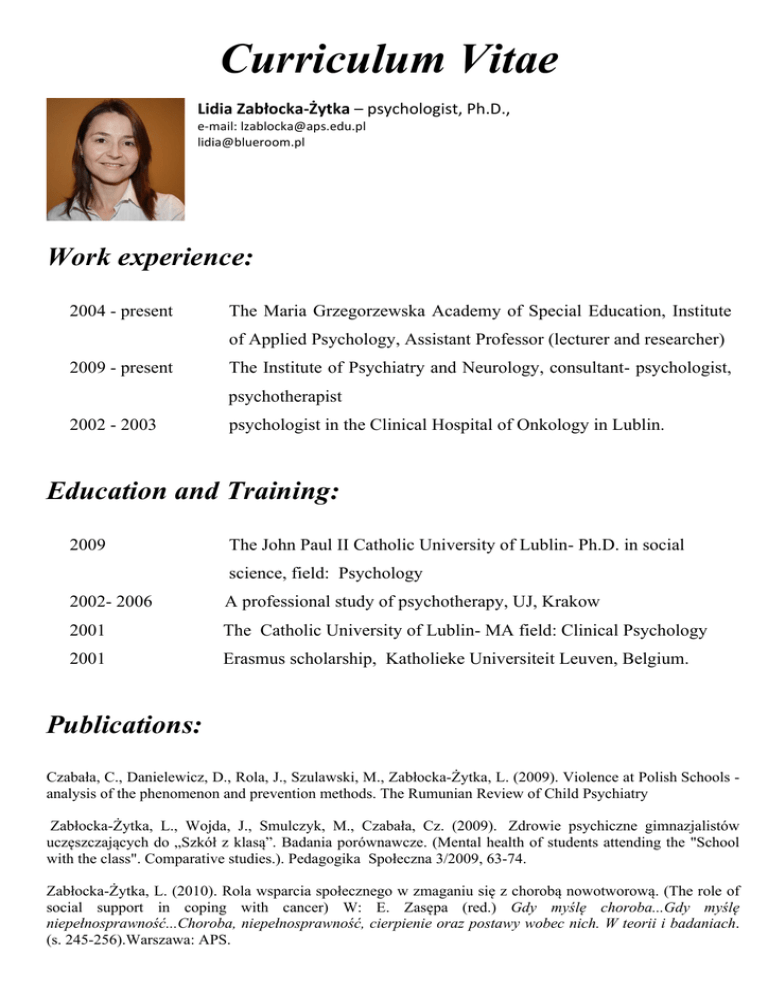 Curriculum Vitae Lidia Zabłocka-‐Żytka – psychologist, Ph.D., e-‐mail: [email protected] [email protected] Work experience: 2004 - present The Maria Grzegorzewska Academy of Special Education, Institute of Applied Psychology, Assistant Professor (lecturer and researcher) 2009 - present The Institute of Psychiatry and Neurology, consultant- psychologist, psychotherapist 2002 - 2003 psychologist in the Clinical Hospital of Onkology in Lublin. Education and Training: 2009 The John Paul II Catholic University of Lublin- Ph.D. in social science, field: Psychology 2002- 2006 A professional study of psychotherapy, UJ, Krakow 2001 The Catholic University of Lublin- MA field: Clinical Psychology 2001 Erasmus scholarship, Katholieke Universiteit Leuven, Belgium. Publications: Czabała, C., Danielewicz, D., Rola, J., Szulawski, M., Zabłocka-Żytka, L. (2009). Violence at Polish Schools analysis of the phenomenon and prevention methods. The Rumunian Review of Child Psychiatry Zabłocka-Żytka, L., Wojda, J., Smulczyk, M., Czabała, Cz. (2009). Zdrowie psychiczne gimnazjalistów uczęszczających do „Szkół z klasą”. Badania porównawcze. (Mental health of students attending the "School with the class". Comparative studies.). Pedagogika Społeczna 3/2009, 63-74. Zabłocka-Żytka, L. (2010). Rola wsparcia społecznego w zmaganiu się z chorobą nowotworową. (The role of social support in coping with cancer) W: E. Zasępa (red.) Gdy myślę choroba...Gdy myślę niepełnosprawność...Choroba, niepełnosprawność, cierpienie oraz postawy wobec nich. W teorii i badaniach. (s. 245-256).Warszawa: APS. Zabłocka-Żytka, L., Szulawski, M., Wojda, J., Czabała Cz. (2010). Zapobieganie zachowaniom destrukcyjnym i autodestrukcyjnym wśród dzieci młodzieży szkolnej. Wnioski z realizacji międzynarodowego projektu “Child and Adolescent Mental Heath in Enlarged European Union” (Prevention of destructive and self-destructive behavior disorders among children and adolescents. The conclusions of the international project "Child and Adolescent Mental Heath in Enlarged European Union"). W: K. Okulicz-Kozaryn, K. Ostaszewski (red.). Promocja zdrowia psychicznego. Badania i działania w Polsce, część druga. Warszawa: Instytut Psychiatrii i Neurologii. Zabłocka-Żytka, L., Hintze, B., Sokołowska, E., Kluczyńska, S. (2011). Ćwiczenia z podstawowych umiejetnosci pomagania. (The exercises of the basic skills in supporting). W: B. Weigl, (red.) Psychologia rozwoju i podstawy pomagania. Teoria – ćwiczenia – praktyka (s. 91-162). Warszawa: Wydawnictwo APS. Sokołowska, E., Zabłocka-Żytka, L. (2013). Psychologia rozwojowa dla klinicystów. Pomocne ćwieczenia i interwencje. (Developmental psychology for clinical psychologists. Helpful exercises and interventions). Warszawa: Fraszka Edukacyjna. Zabłocka-Żytka, L. (2013). Zrozumieć pacjenta. Stres choroby przewlekłej i sposoby radzenia sobie na przykładzie pacjentek z rakiem piersi.( To undrestand the patient. Stress and coping with chronic disease on the example of breast cancer patients). W: B. Zasępa (red.). Doświadczenie choroby i niepełnosprawności (s.109-124). Warszawa: Wydawnictwo APS. Zabłocka-Żytka, L. (2015). Poradnictwo psychologiczne dla osób chorych somatycznie ( Psychological counselling for people with somatic disease). W: Cz. Czabała, S. Kluczyńska (red.). Poradnictwo psychologiczne. Warszawa: PWN. Sokołowska, E., Zabłocka-Żytka, L., Kluczyńska S., Wojda- Kornacka J. (2015). Zdrowie psychiczne młodych dorosłych. Wybrane zagadnienia (The mental health of young adults). Warszawa: Wydawnictwo Difin. Projects: European Union Project “CAMILLE - Empowerment of Children and Adolescents of Mentally Ill Parents through Training of Professionals working with children and adolescents”, 2013-2015, intermediate researcher European Union Project “CAMHEE- Child and Adolescent Mental Health in Enlarged Europe”, 2007-2009, intermediate researcher Local projects: 2013-2015 “Research tool construction to assess students' mental health" BSTP 22/13-I- a project coordinator, 2014-2015 “Piloting of the “PsychoŻak” mental health promotion program for university students“ BSTP 35/14-I - a project coordinator.