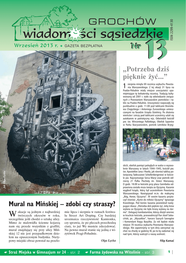 Wrzesieƒ 2013 r. • GAZETA BEZP¸ATNA Nr 13 ISSN 2299-4130 GRO C HÓ W „Potrzeba dziÊ pi´knie ˝yç...” sierpnia min´∏a 69 rocznica wybuchu Powstania Warszawskiego. Z tej okazji 31 lipca na Pradze-Po∏udnie mia∏y miejsce uroczystoÊci upami´tniajàce t´ bohaterskà rocznic´. Tradycjà kultywowanà od 2001 r. sta∏o si´ odwiedzanie zwiàzanych z Powstaniem Warszawskim pomników i tablic na Pradze-Po∏udnie. UroczystoÊci rozpocz´∏y si´ punktualnie o godz. 11.00 pod tablicami Bronis∏awa Chaj´ckiego i Antoniego ˚urowskiego umieszczonymi na fasadzie Urz´du Dzielnicy. Po z∏o˝eniu wieƒców i zniczy pod tablicami uczestnicy udali si´ autokarem w patriotyczny rejs. Odwiedzili koÊció∏ pw. Êw. Wincentego Pallottiego, Obelisk Saperów w Parku Skaryszewskim, pomnik Lotników Brytyj- 1 Olga ¸´cka Filip Kamaç fot. Olga ¸´cka mie lipca i sierpnia w ramach festiwalu Street Art Doping. Czy bardziej urozmaica rzeczywistoÊç Kamionka, czy sprawia, ˝e po plecach przechodzà ciary, to ju˝ Wy musicie zdecydowaç. Na pewno mural stanie si´ jednà z wizytówek Pragi-Po∏udnie. skich, obelisk pami´ci poleg∏ych w walce o wyzwolenie Warszawy w latach 1944–1945, koÊció∏ pw. Êw. Aposto∏ów Jana i Paw∏a, jak równie˝ tablic´ poÊwi´conà Tadeuszowi Schollenbergerowi w koÊciele pw. Najczystszego Serca Maryi oraz pomnik ˝o∏nierzy 21 Pu∏ku Piechoty im. Dzieci Warszawy. O godz. 18.00 w koÊciele przy placu Szembeka odprawiona zosta∏a msza Êwi´ta za Ojczyzn´. Kazanie wyg∏osi∏ ksiàdz, który by∏ uczestnikiem Powstania Warszawskiego. Nawiàzywa∏ m.in. do maksymy „Bóg, Honor, Ojczyzna”. W swoim kazaniu przytoczy∏ równie˝ „Hymn do mi∏oÊci Ojczyzny” Ignacego Krasickiego. Pod koniec kazania powiedzia∏ nast´pujàce s∏owa: „Potrzeba dziÊ pi´knie ˝yç, ˝eby krew wylana za Ojczyzn´ nie by∏a krwià wylanà na darmo”. Delegacji kombatantów, którzy z∏o˝yli wieniec w kruchcie koÊcio∏a, przewodniczy∏ Pan Józef Sobociƒski, ps. „Myszo∏ów”, harcerz Szarych Szeregów i Komendant Kr´gu Bazylika. Za rok b´dzie mia∏a miejsce 70 rocznica wybuchu Powstania Warszawskiego. Nie zapomnijmy w tym dniu zatrzymaç si´ choç na chwil´ w godzin´ W, po to by zadumaç si´ nad tymi, którzy walczyli o naszà wolnoÊç. Mural na Miƒskiej – zdobi czy straszy? akacje sà jednym z najbardziej twórczych okresów w roku, szczególnie jeÊli chodzi o sztuk´ ulicy. Mimo ˝e malowid∏a Êcienne kojarzà nam si´ przede wszystkim z graffiti, mural znajdujàcy si´ przy ulicy Miƒskiej 12 nie jest przypadkowym dzie∏em na opuszczonym budynku. Nietypowy miejski obraz powsta∏ na prze∏o- W ☛ Stra˝ Miejska w Gimnazjum nr 24 – str. 2 ☛ Farma ˝ydowska na Witolinie – str. 3 1 GROCHÓW Z prac Rady Dzielnicy Modernizacja ulicy Poligonowej, Miejscowy Plan Zagospodarowania Przestrzennego rejonu ul. Grochowskiej, sytuacja mieszkaƒców jednej z odzyskanych przez by∏ych w∏aÊcicieli kamienic oraz zmiany w bud˝ecie dzielnicy to najwa˝niejsze z tematów, nad którymi obradowa∏a w lipcu i sierpniu Rada Dzielnicy. Lipcowà sesj´ Rady Dzielnicy radni rozpocz´li od zaopiniowania Miejscowego Planu Zagospodarowania Przestrzennego rejonu ul. Grochowskiej. Plan ten okreÊla przeznaczenie i warunki zabudowy poszczególnych kwarta∏ów ulic, na odcinku od uli- J´zyki obce – bezp∏atna nauka dla niepe∏nosprawnych osób Zapraszamy na szkolenia z j´zyków obcych prowadzone przez wolontariuszy, dla osób z ca∏ej Warszawy, od 1.10.2013 na czas nieokreÊlony. Zaj´cia b´dà si´ odbywaç na ul. Paca 40 w Warszawie, w Centrum AktywnoÊci Lokalnej, w ma∏ych grupach, raz w tygodniu po 2–3 godziny. J´zyki obce do wyboru: angielski i hiszpaƒski. Warunki uczestnictwa: wiek 18–65 lat, orzeczenie o niepe∏nosprawnoÊci. Terminy i miejsca zaj´ç Fundacja zamieÊci na swojej stronie: http://www.fundacja-laur.pl i https:// www.facebook.com/FundacjaLAUR. Udzia∏ jest bezp∏atny, rekrutacja trwa do 15 paêdziernika 2013 r. Fundacja „Laur” jest silnie zwiàzana z Grochowem – tu ma swojà siedzib´ (ul. Makowska 31 lok. 61), tu tak˝e prowadzi wi´kszoÊç zaj´ç w ramach wy˝ej opisanego projektu (w CAL przy ul. Paca 40). Polska Fundacja Niepe∏nosprawnych Studentów i Absolwentów „Laur” „Opowiedz Grochów” to warsztaty historii mówionej dla m∏odzie˝y prowadzone przez Stowarzyszenie Prosz´ Bardzo. Zaj´cia odbywajà si´ cyklicznie i polegajà na zach´ceniu m∏odzie˝y do samodzielnego odkrywania historii Grochowa przez przeprowadzanie wywiadów z sàsiadami i cz∏onkami lokalnej spo∏ecznoÊci. Stowarzyszenie serdecznie dzi´kuje uczestnikom warsztatów za zaanga˝owanie w tworzenie archiwum historii mówionej Grochowa. Dzi´kujemy podopiecznym Fundacji „Âwiat∏o-˚ycie” OÊrodek Praga, TPD Grochów, a tak˝e grupie dzieciaków z OPP nr 1 „Jordanek”. Wi´cej o warsztatach: [email protected]. cy Garwoliƒskiej do Kana∏u Kaw´czyƒskiego. Warto zaznaczyç, i˝ na wrzeÊniowej sesji radni zajmà si´ poprawkami do MPZP rejonu ronda Wiatraczna: to niezmiernie wa˝ny dokument, który ma uporzàdkowaç na lata rondo przez wielu nazywane sercem Grochowa. Kolejnym punktem w porzàdku obrad by∏a informacja na temat realizacji inwestycji, jakà jest modernizacja ulicy Poligonowej. Informacja przerodzi∏a si´ w dyskusj´, w której uczestniczyli radni, urz´dnicy, a przede wszystkim licznie przybyli na sesj´ mieszkaƒcy okolic ulicy Poligonowej, którzy podkreÊlali ucià˝liwoÊci zwiàzane z tymczasowà organizacjà ruchu. Po kilkugodzinnej debacie uda∏o si´ doprowadziç do rozwiàzania najwa˝niejszych problemów. Najszybciej uporano si´ z oznakowaniem budowy. Ju˝ kilka dni po sesji zamontowano na ul. Grenadierów dodatkowà tablic´ informujàcà o prowadzonych pracach i objeêdzie ul. Ostrobramskà oraz u∏atwiono przejazd z ulicy Poligonowej w ul. Kakowskiego. Na wniosek m
